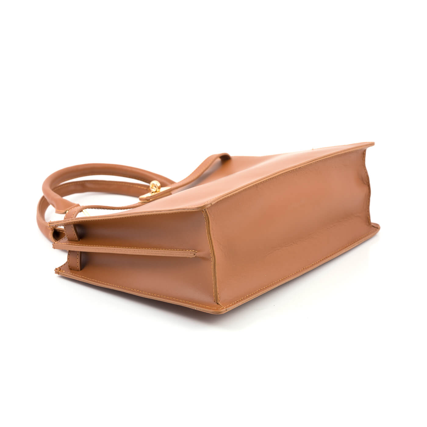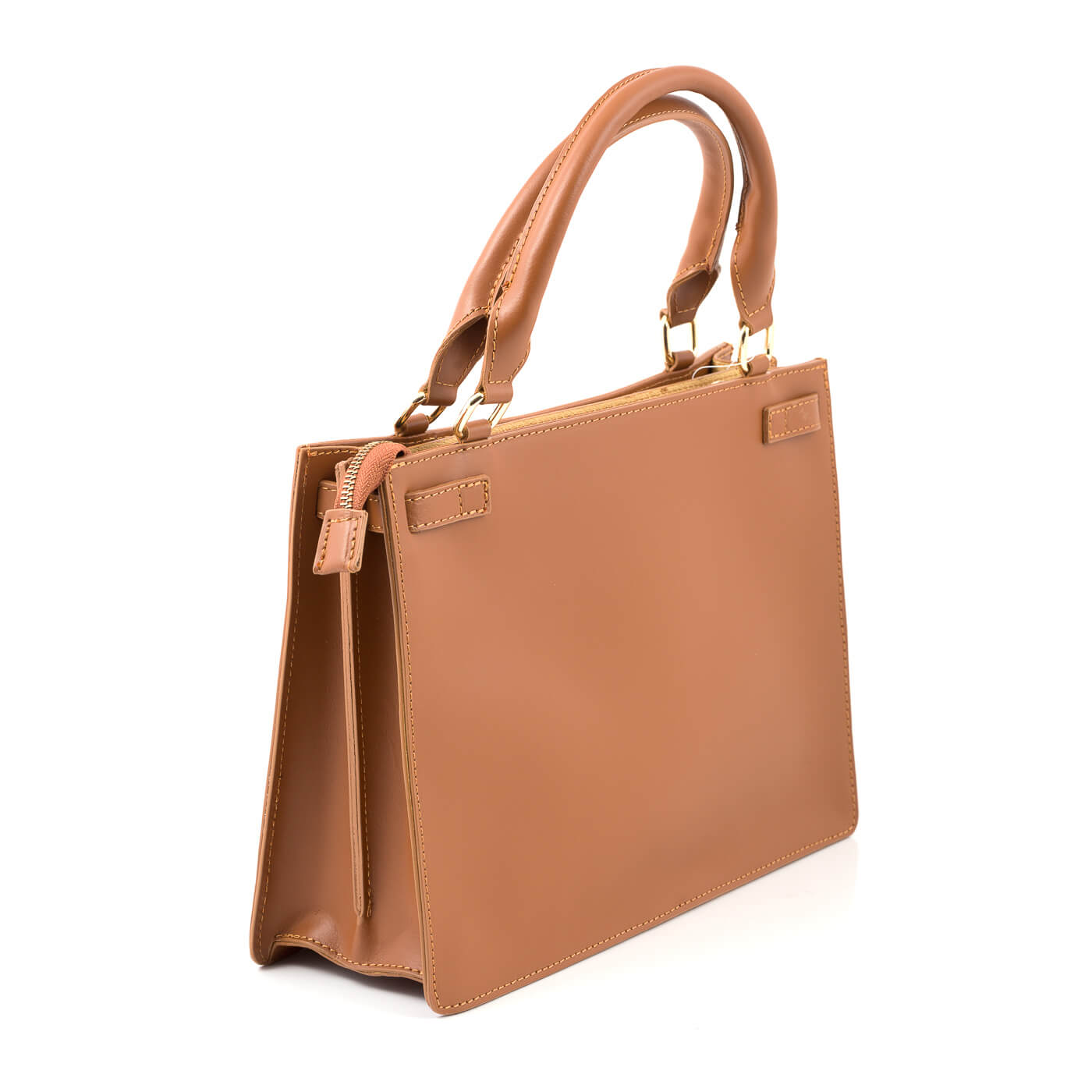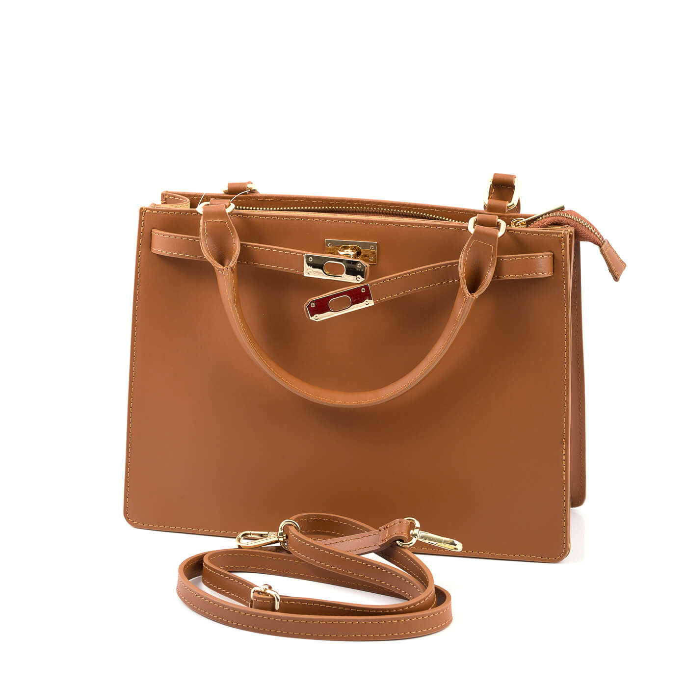 Geanta este prevazuta cu doua cureluse din piele pentru a fi purtata in mana si o curea detasabila ce permite purtarea si pe umar.