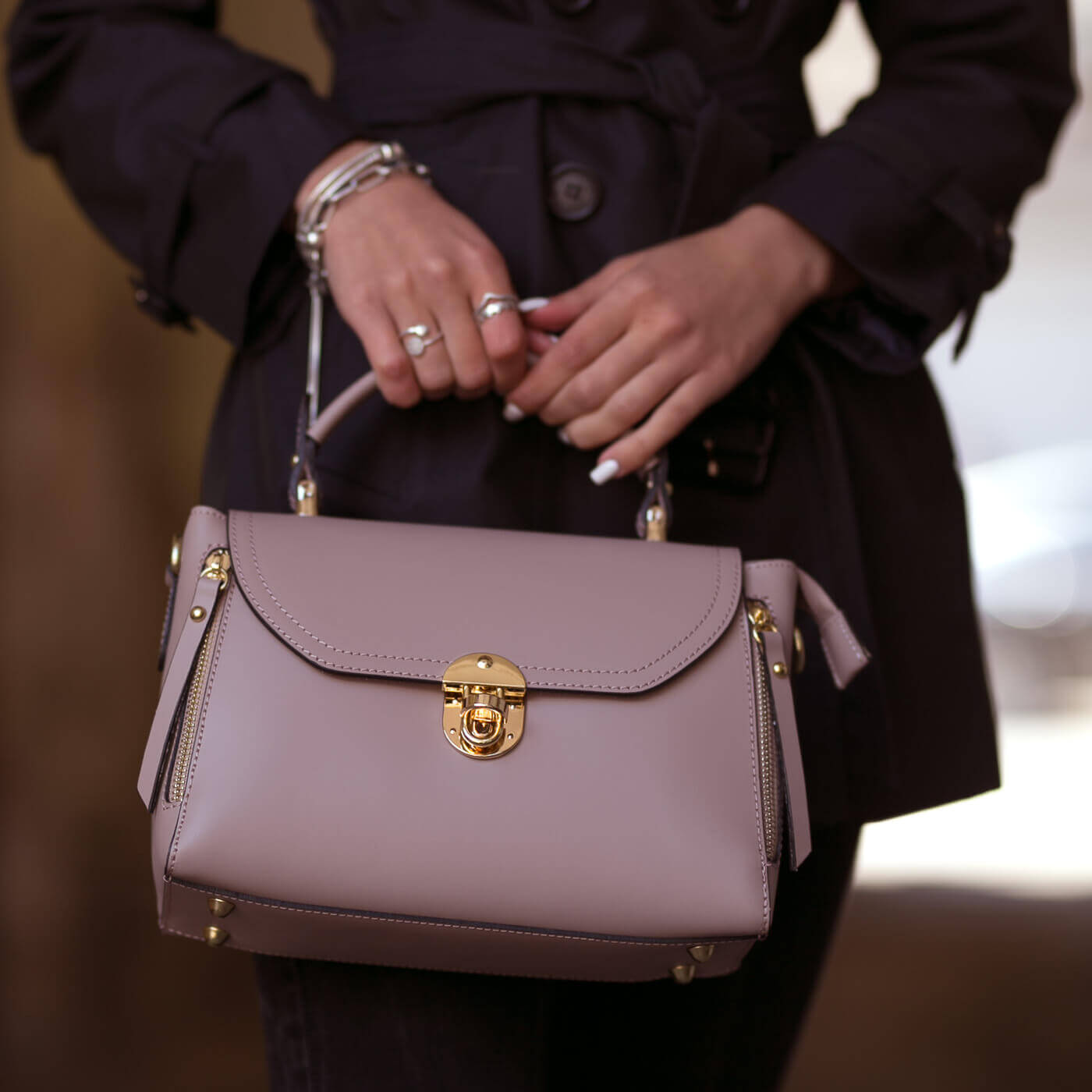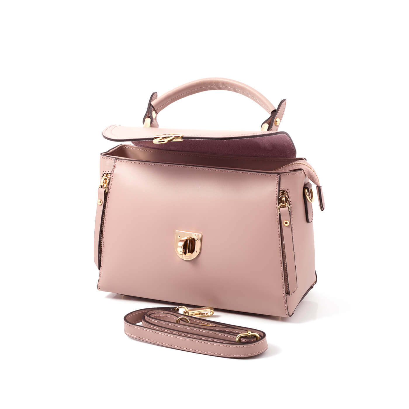 Geanta este prevazuta cu manere din piele pentru a fi purtata in mana si o curea detasabila ce permite purtarea si pe umar.