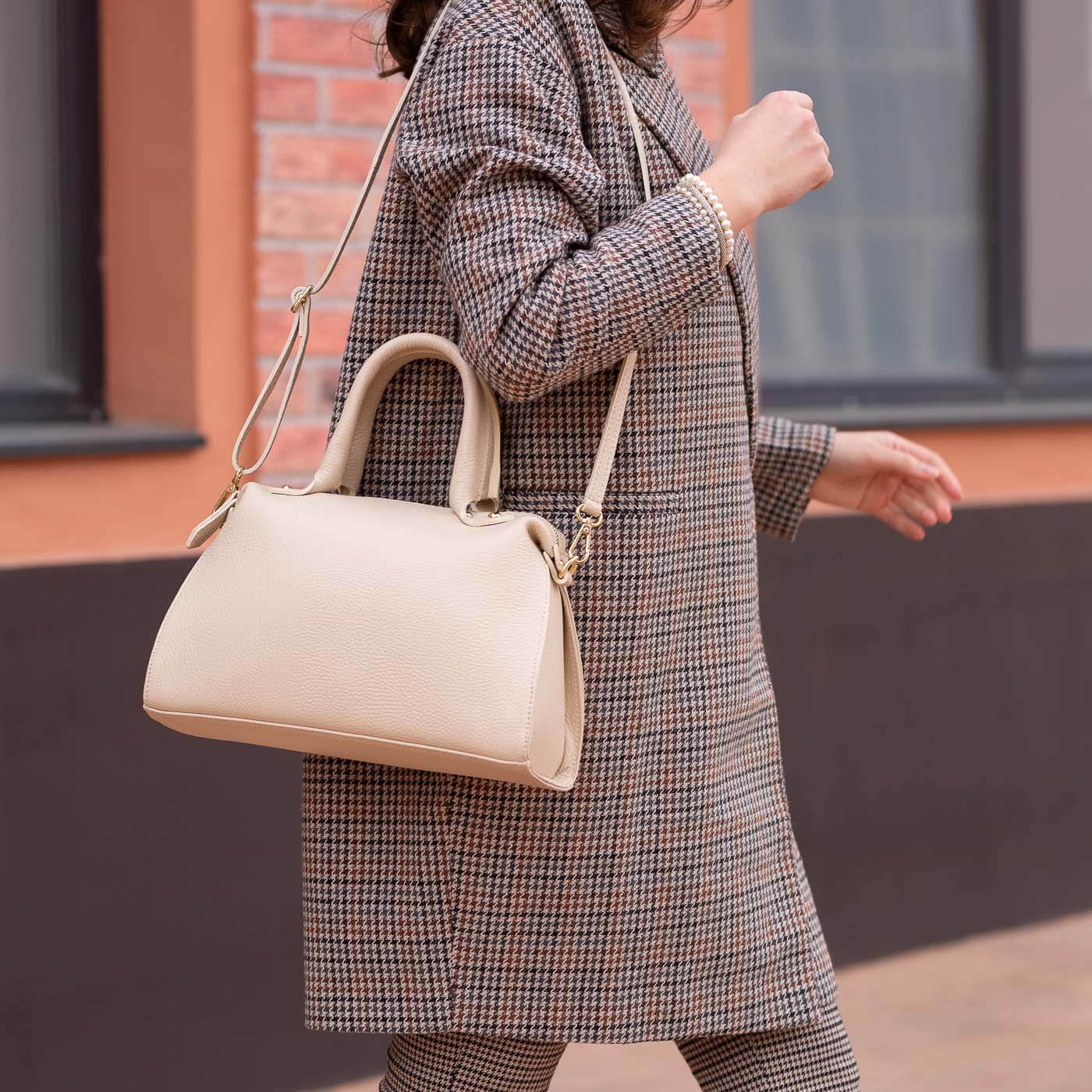 Geanta este prevazuta cu o curelusa din piele, pentru a fi purtata in mana si o curea detasabila, ajustabila, ce permite purtarea si pe umar.