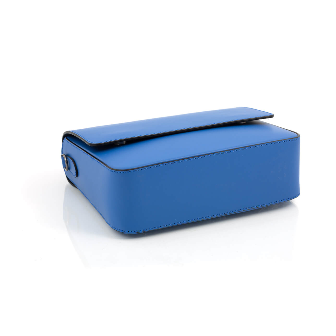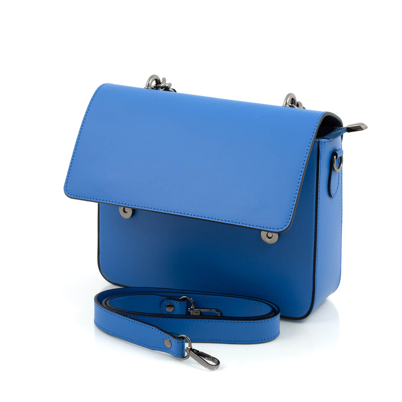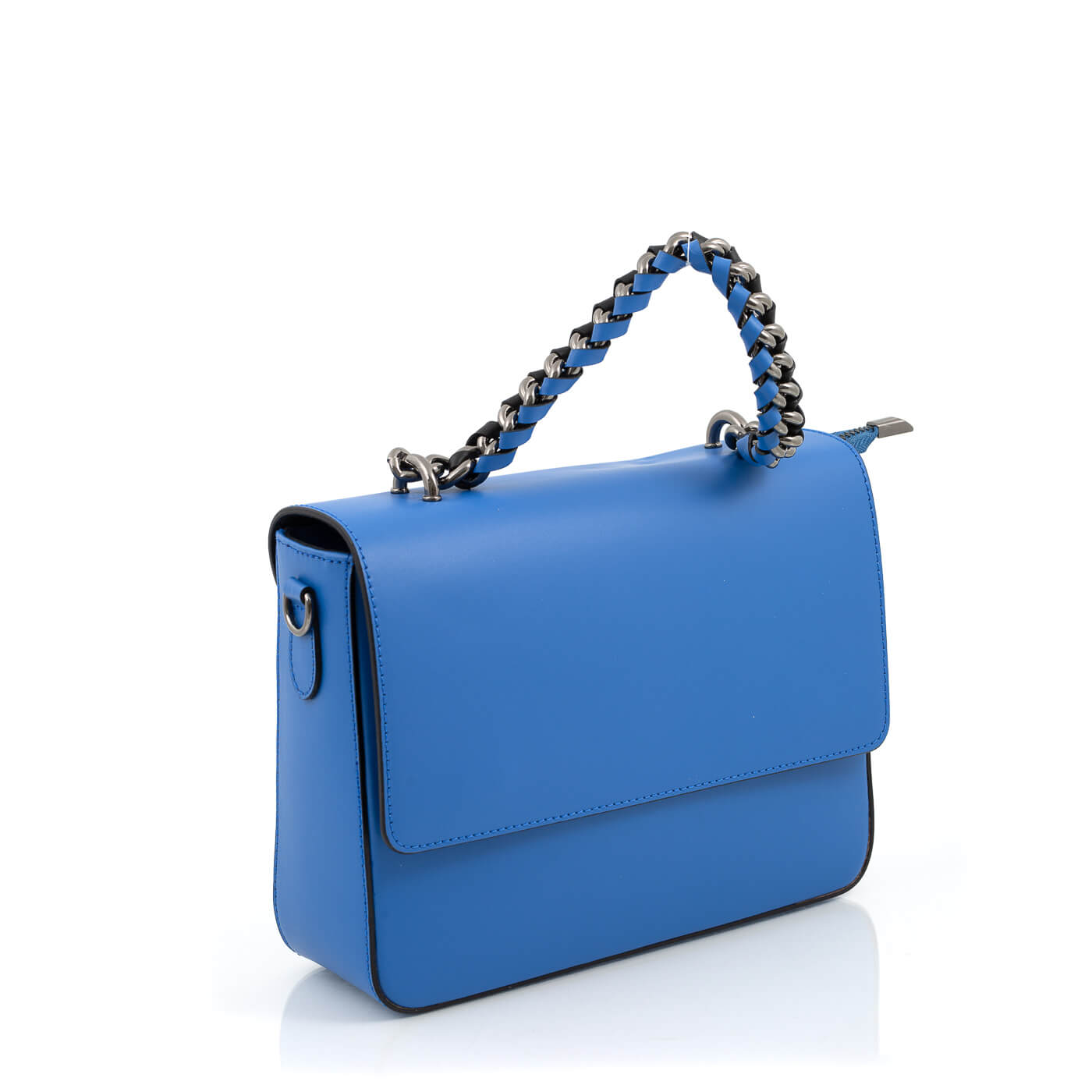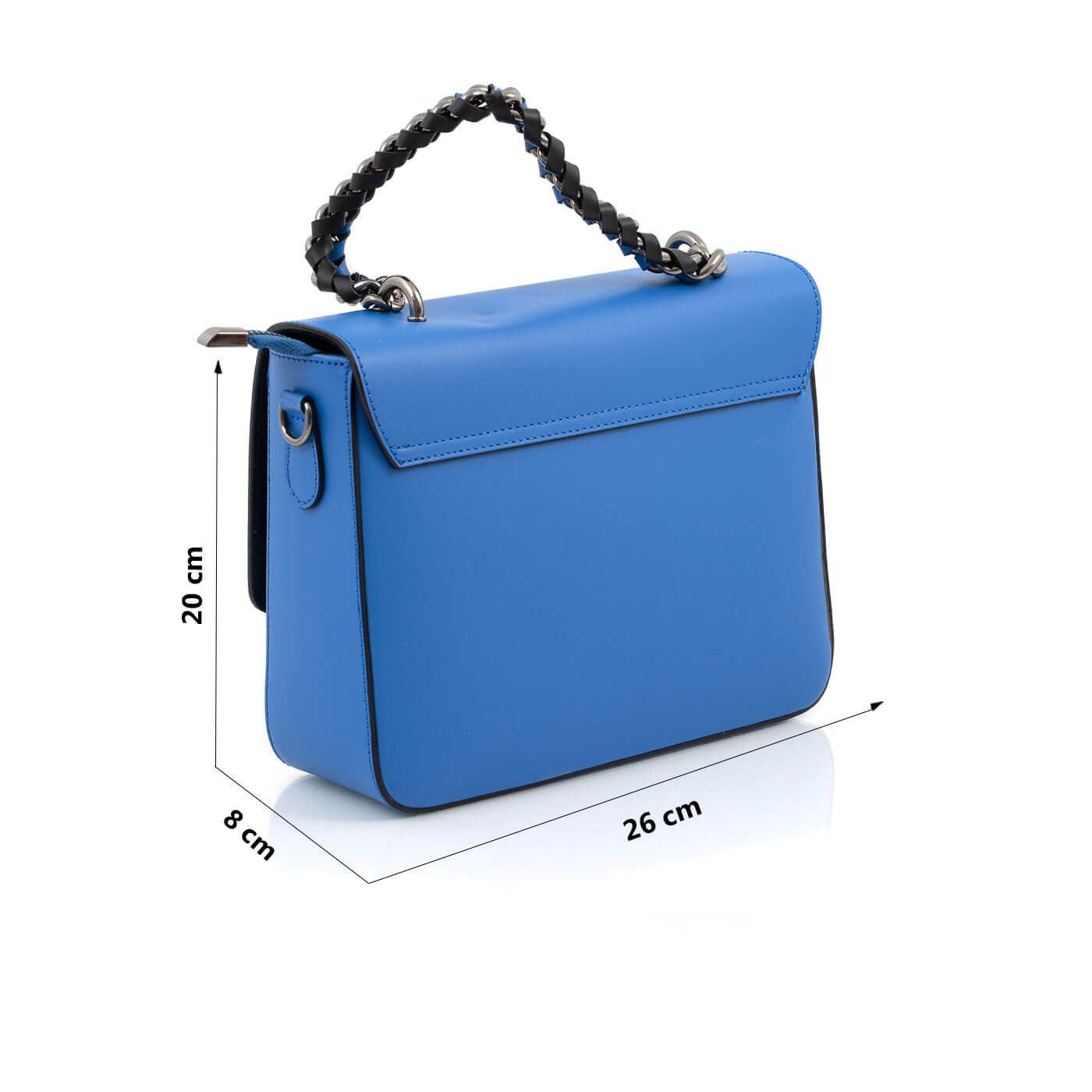 Geanta este prevazuta cu o curelusa din piele metalica, pentru a fi purtata in mana si o curea din piele detasabila, ajustabila, ce permite purtarea si pe umar.
