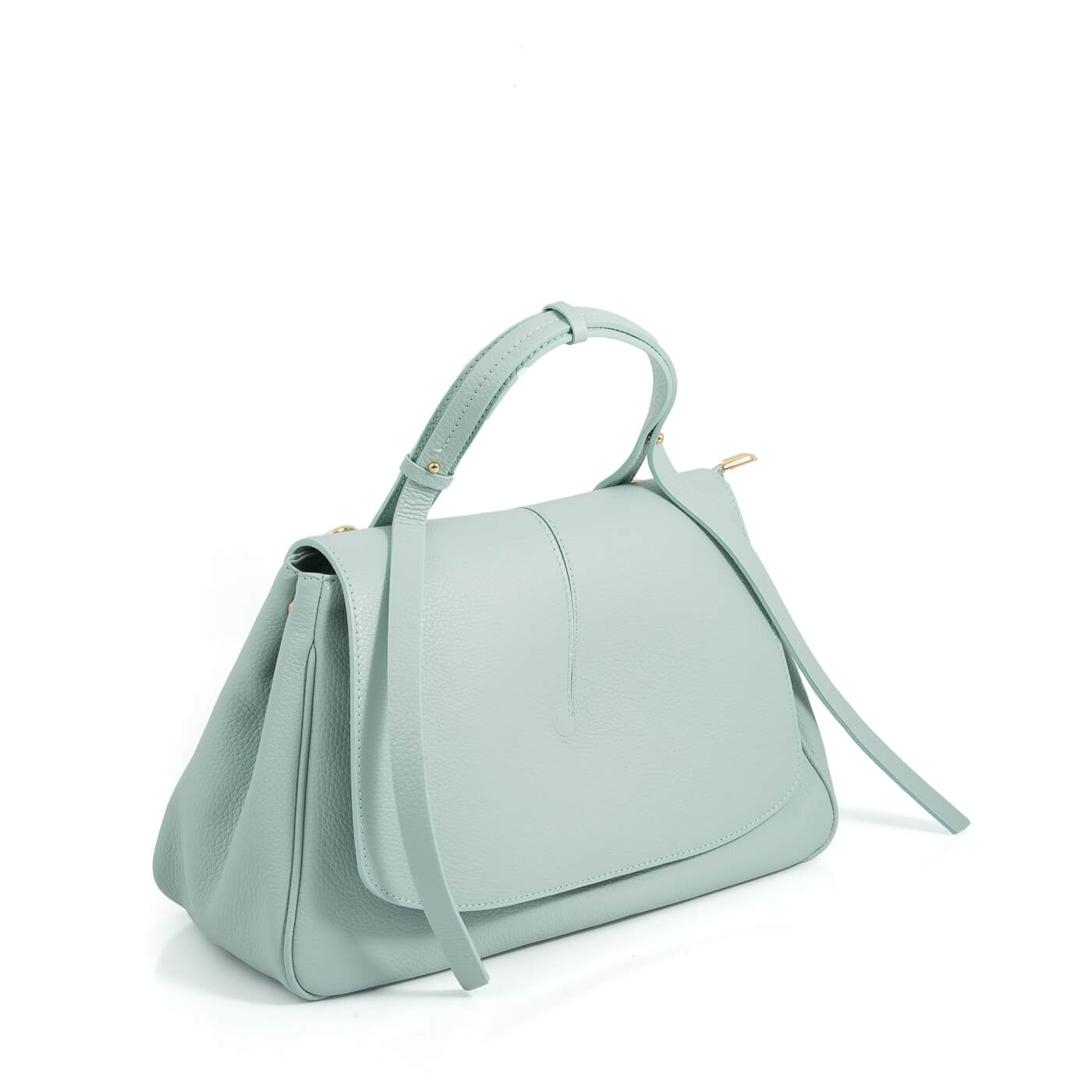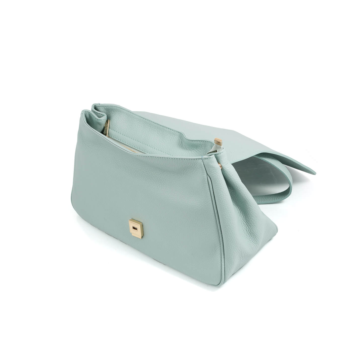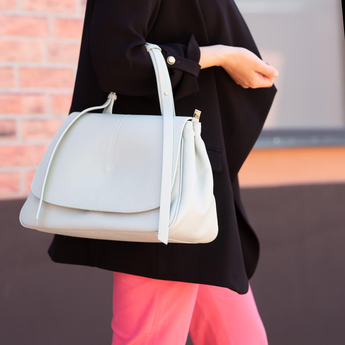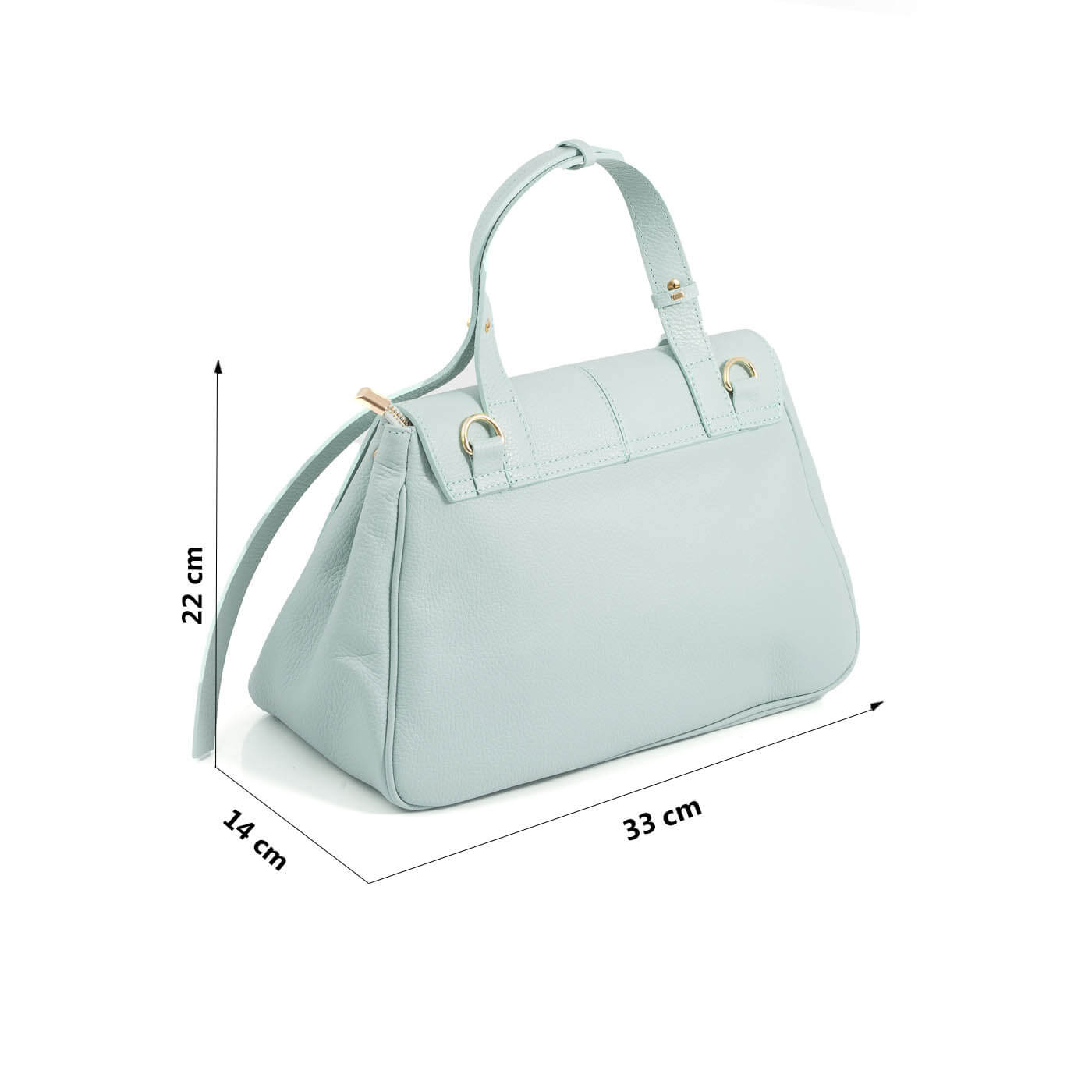 Geanta este prevazuta cu maner ce permite purtarea in mana si o curea lunga din piele, detasabila.