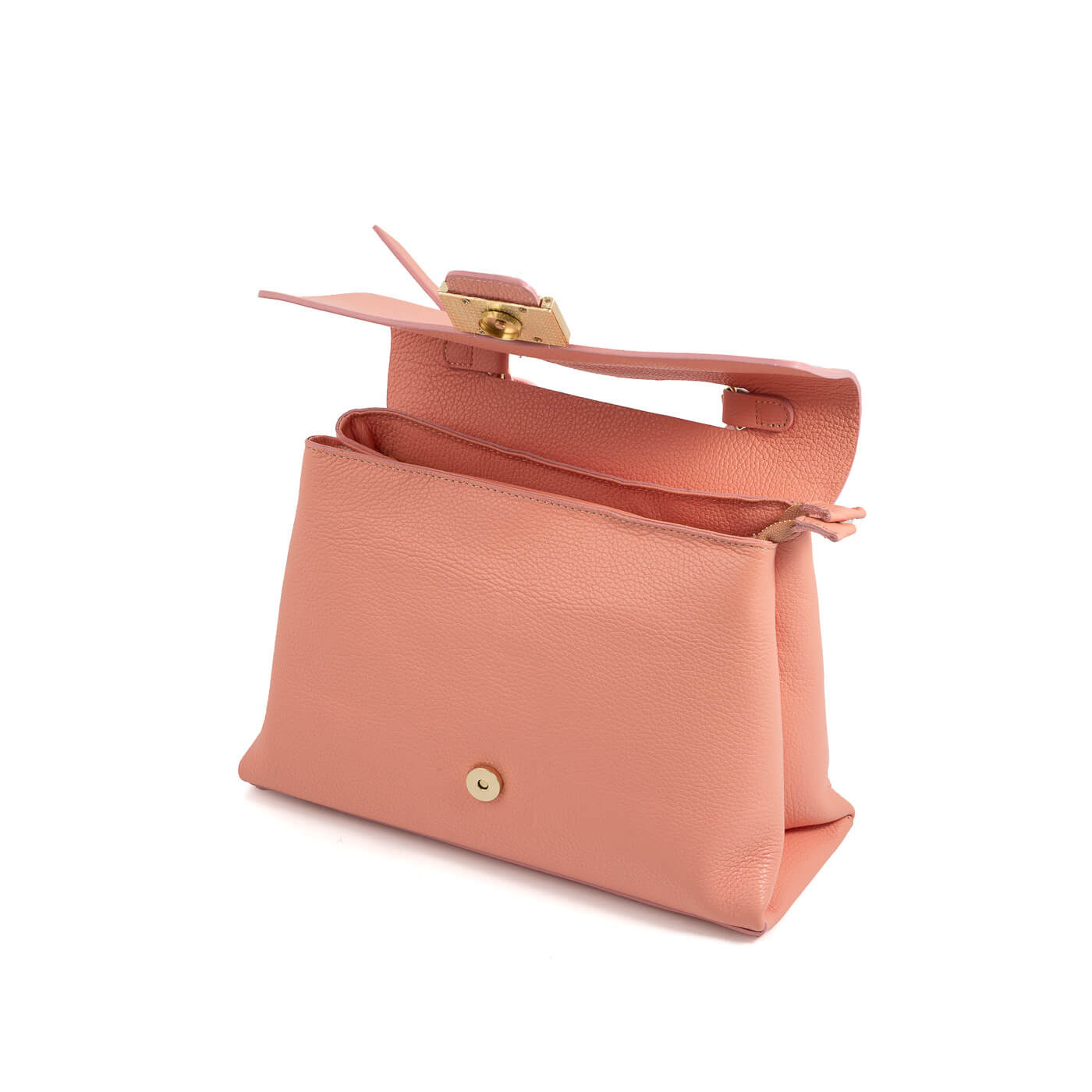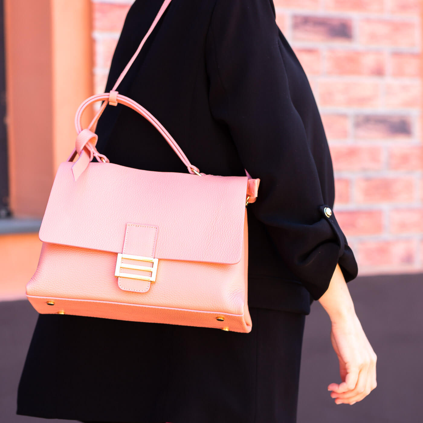 Geanta este prevazuta cu maner ce permite purtarea in mana si o curea lunga din piele, detasabila.
