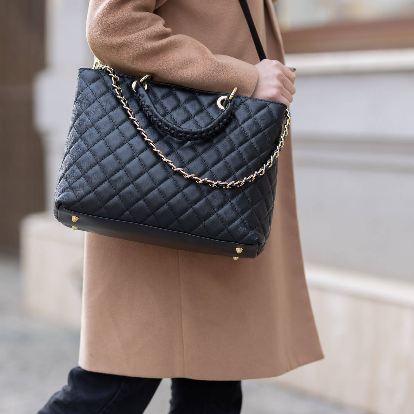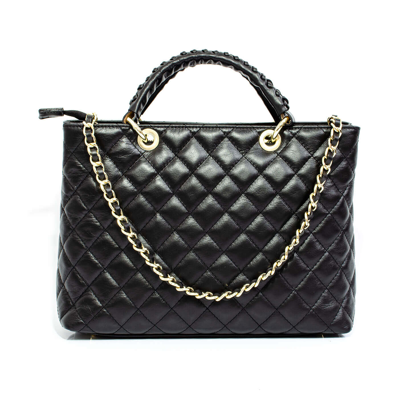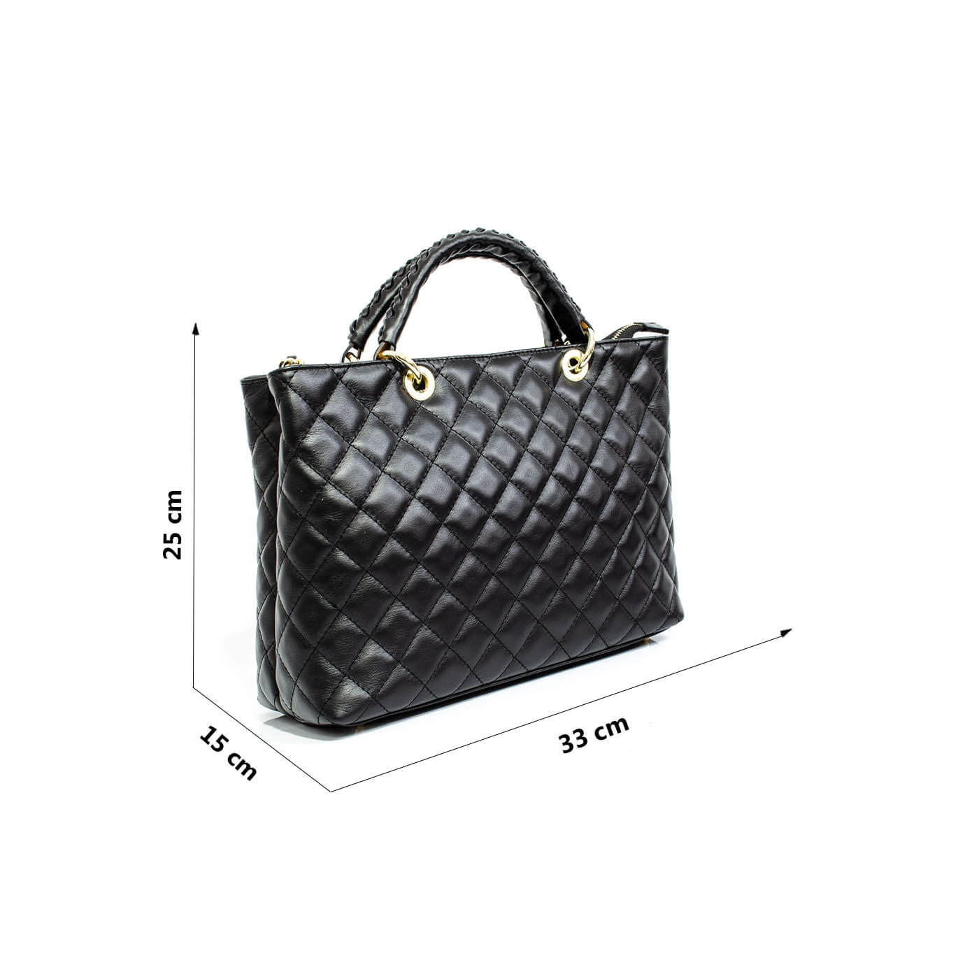 Geanta este prevazuta cu doua manere ce permite purtarea in mana, o bareta de umar scurta metalica si o curea lunga din piele detasabila.