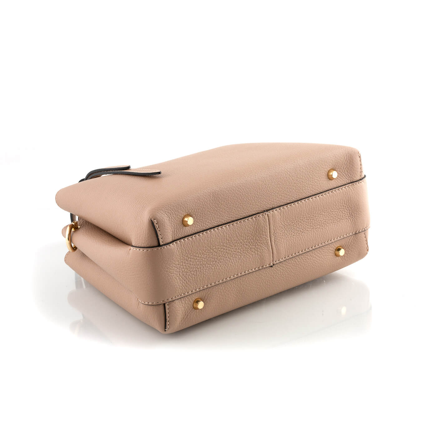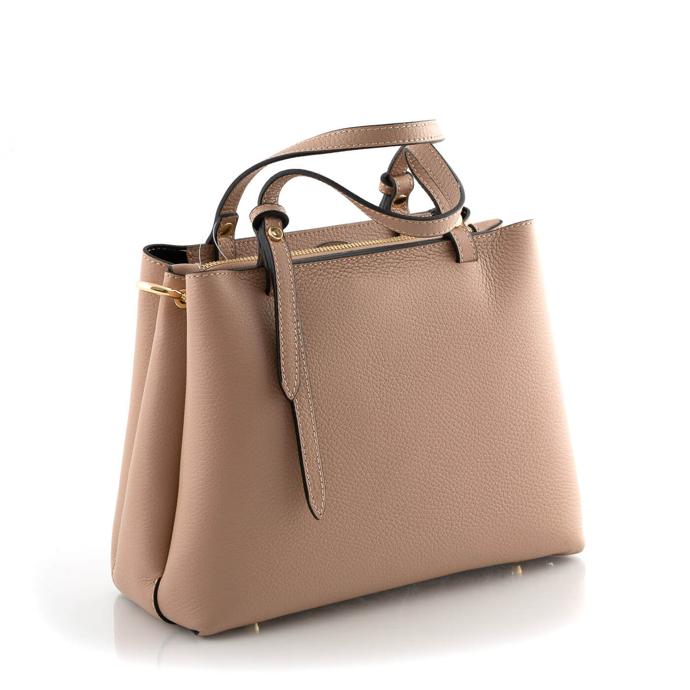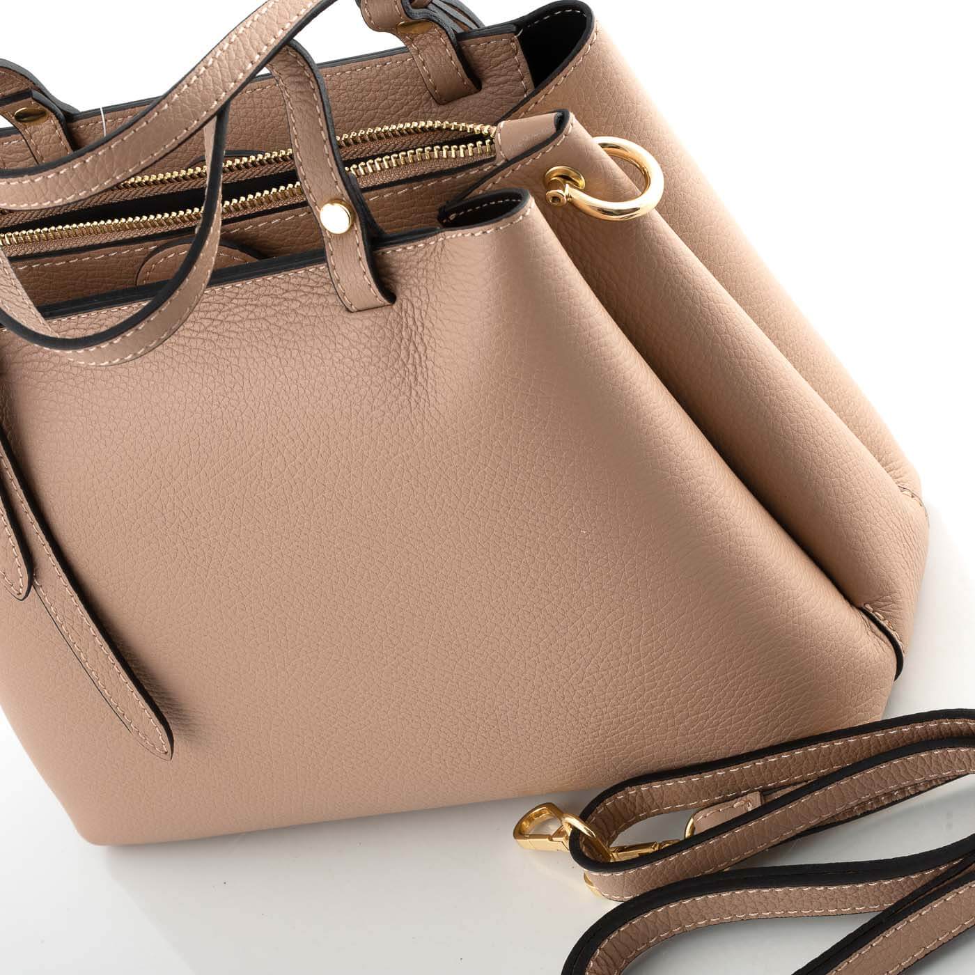 Geanta este prevazuta cu doua manere din piele pentru a fi purtata in mana si o curea detasabila de piele ce permite purtarea pe umar.