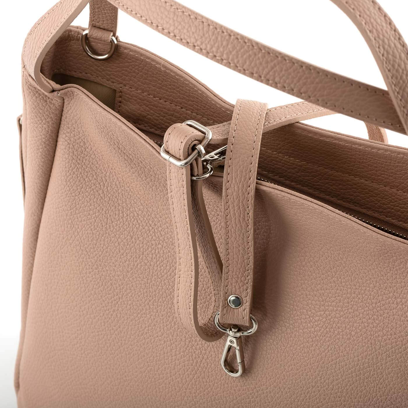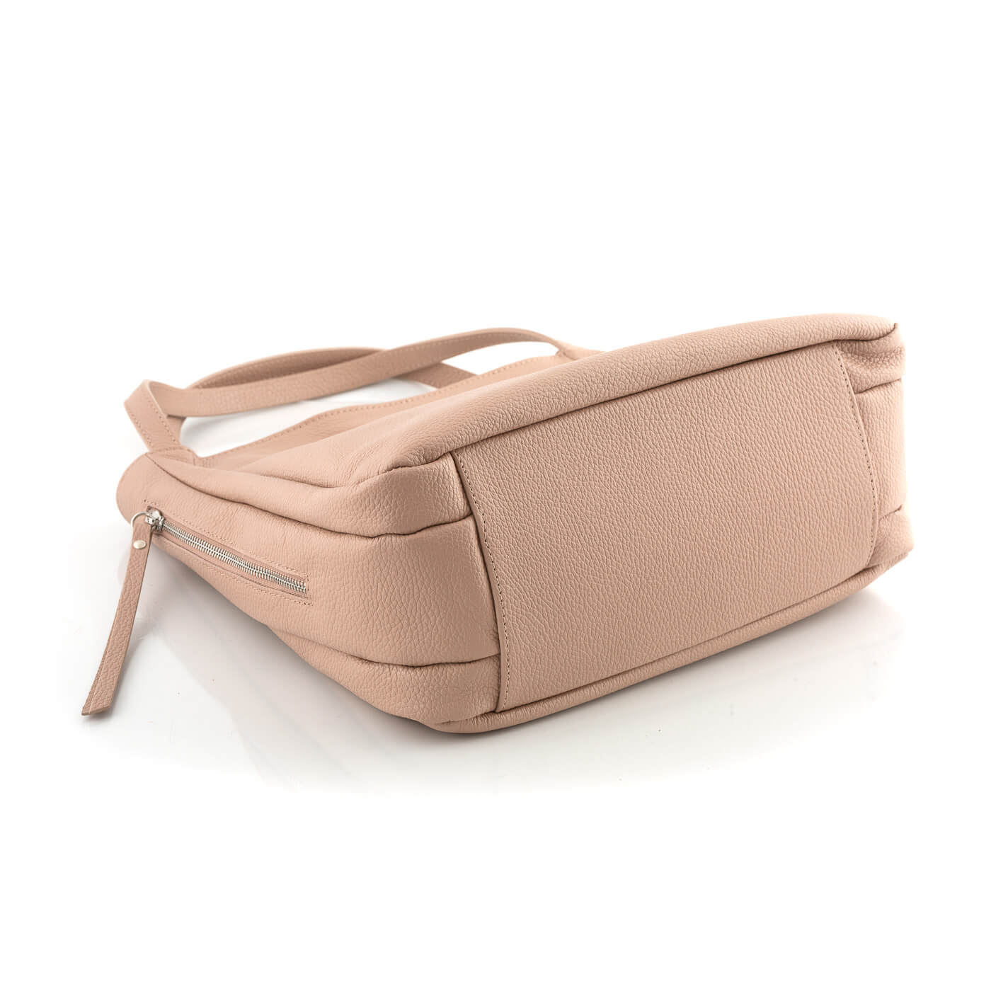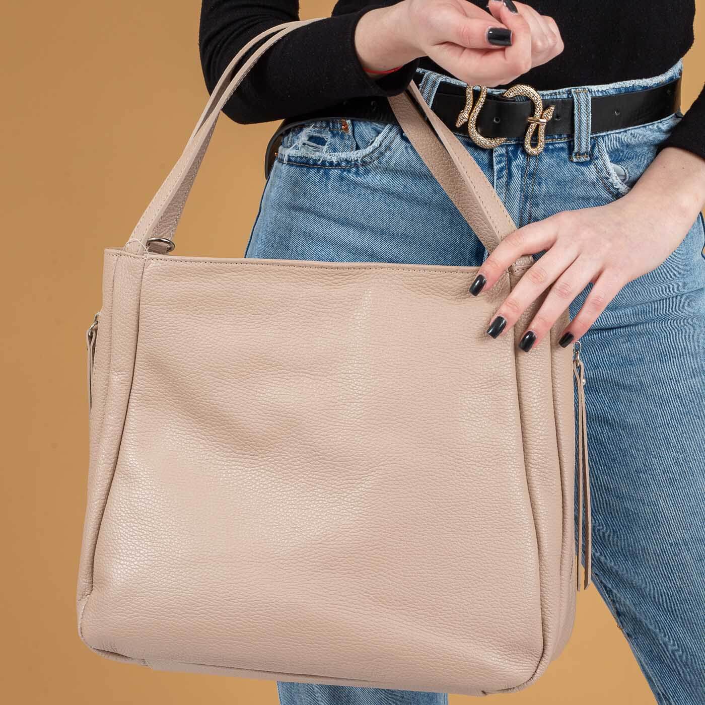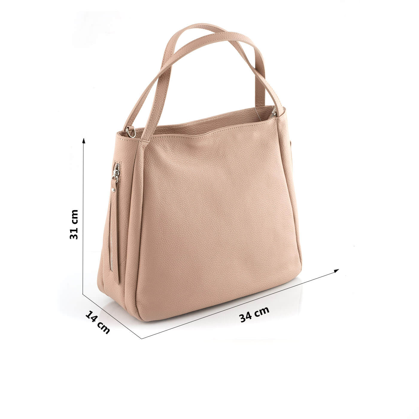 Geanta este prevazuta cu doua manere din piele pentru a fi purtata in mana si o curea detasabila de piele ce permite purtarea pe umar.