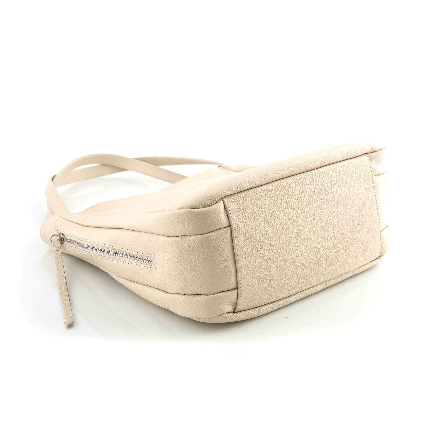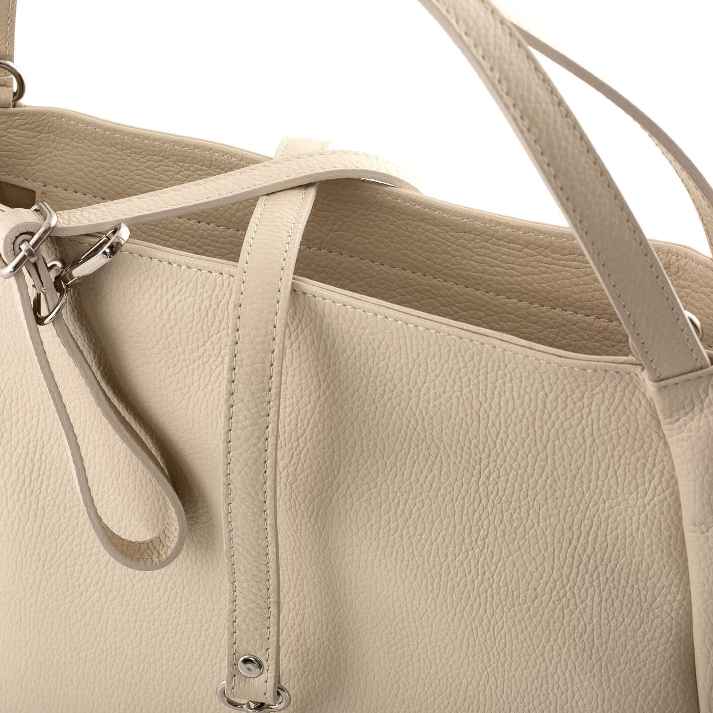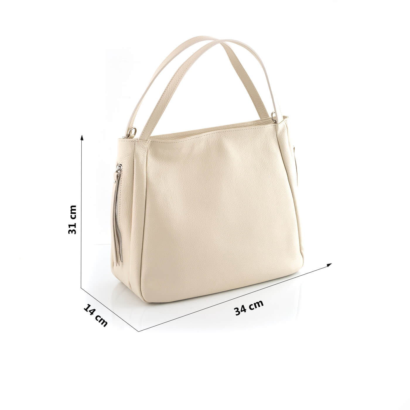 Geanta este prevazuta cu doua manere din piele pentru a fi purtata in mana si o curea detasabila de piele ce permite purtarea pe umar.