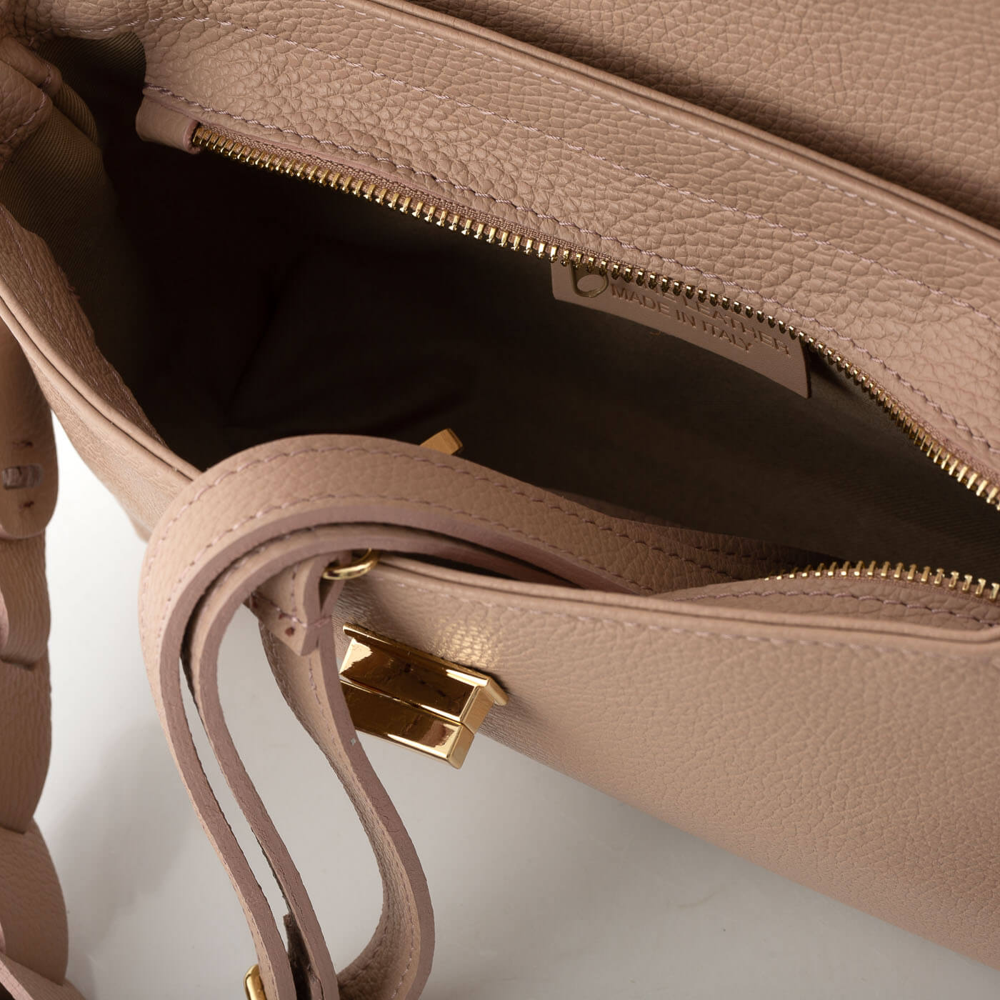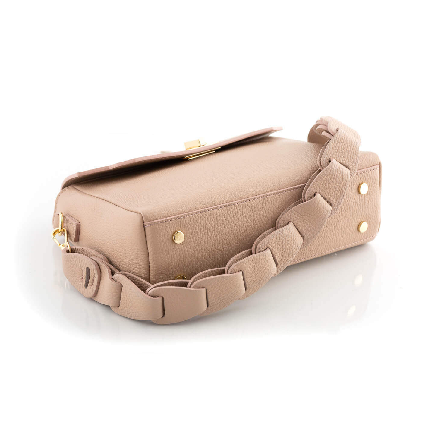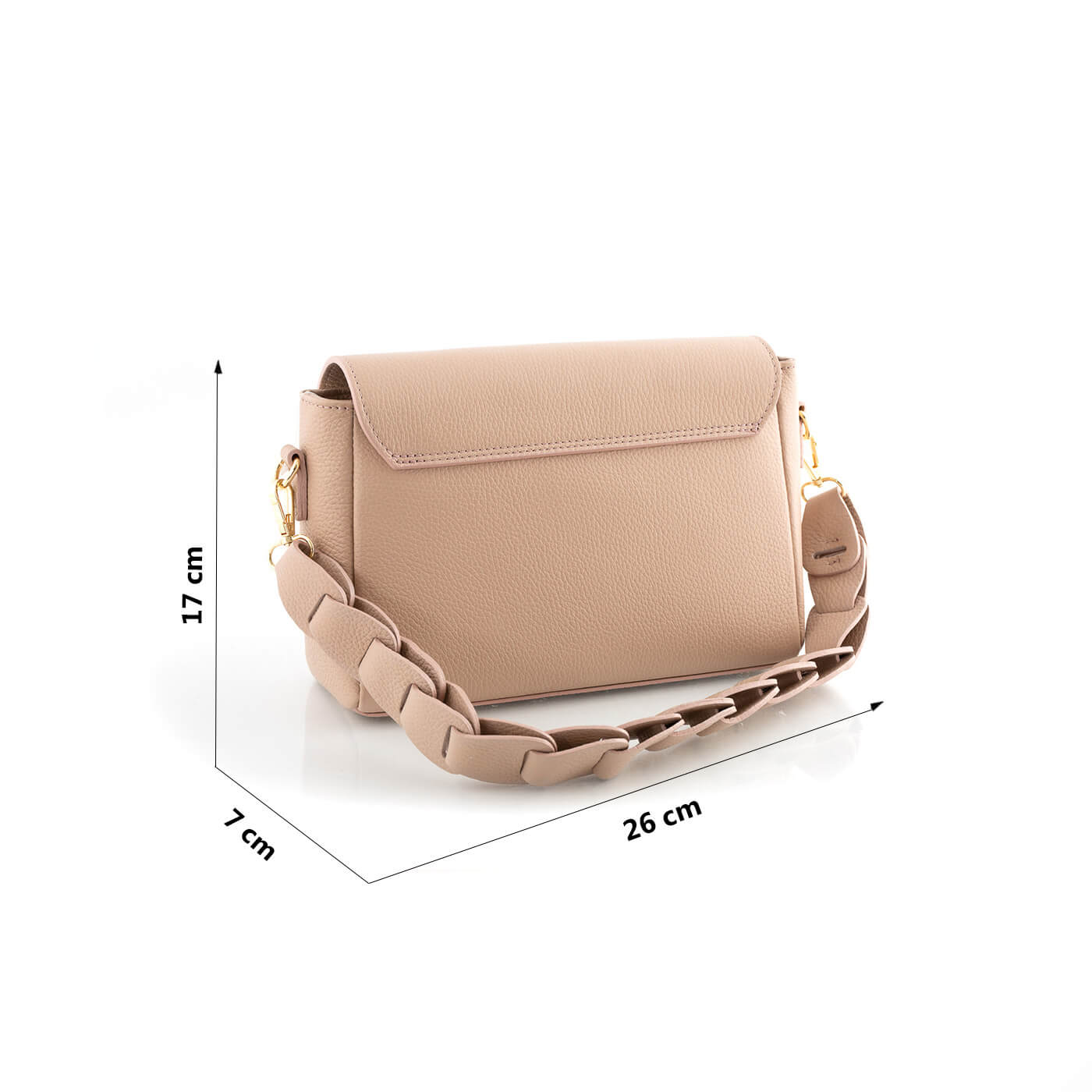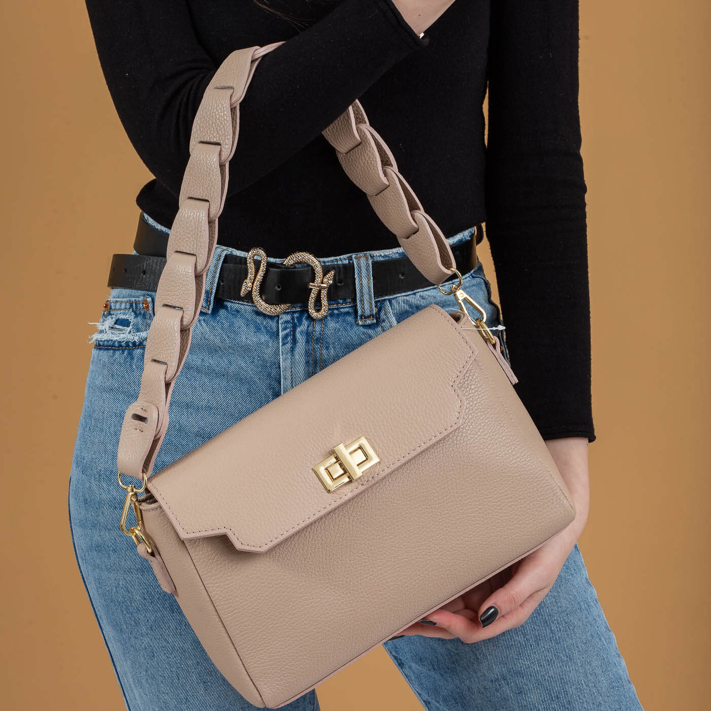 Geanta este prevazuta cu o curea din piele pentru a fi purtata in mana sau pe brat si o curea detasabila ce permite purtarea pe umar