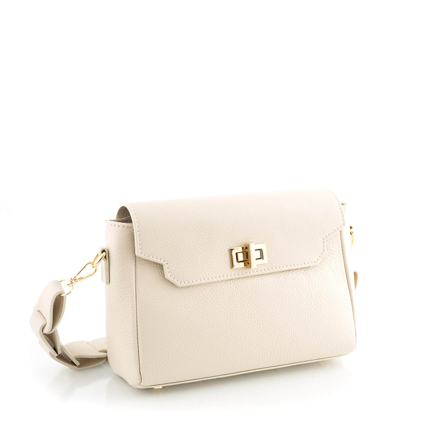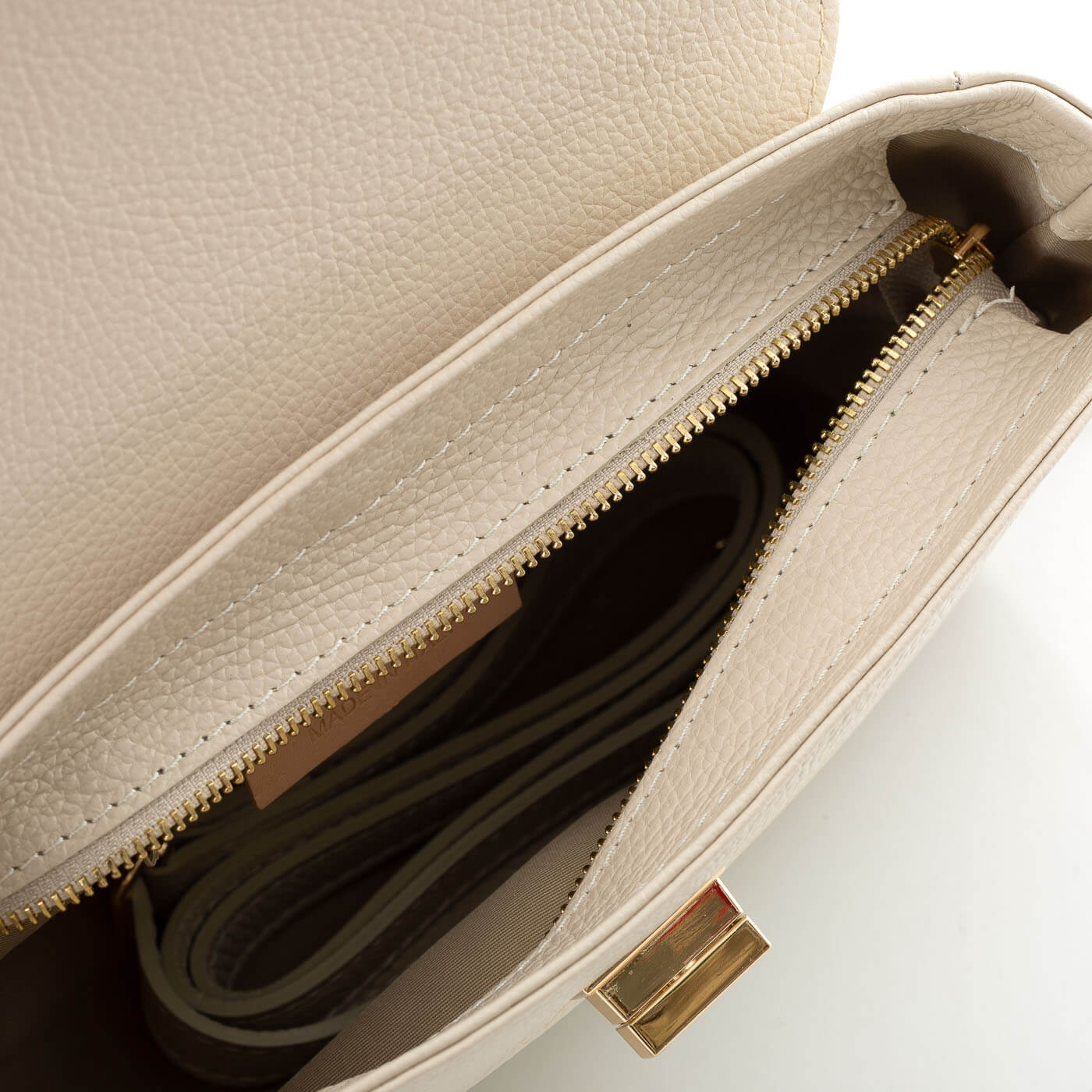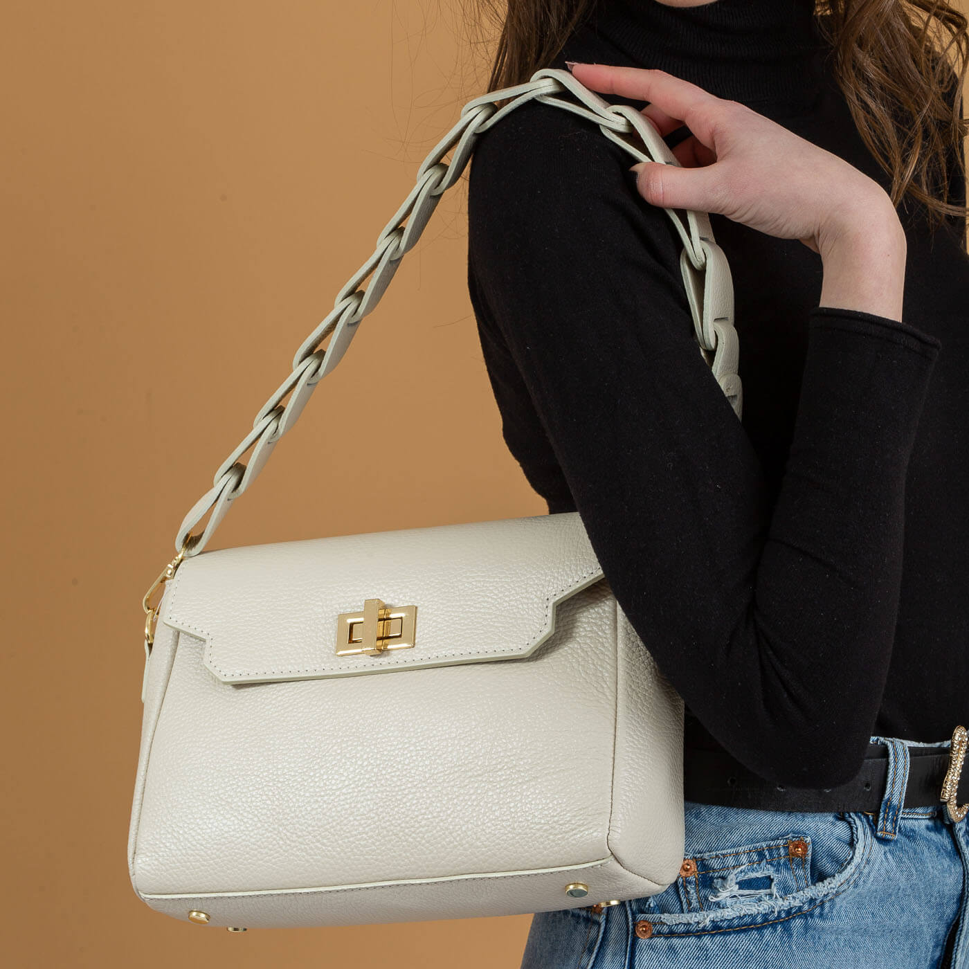 Geanta este prevazuta cu o curea din piele pentru a fi purtata in mana sau pe brat si o curea detasabila ce permite purtarea pe umar