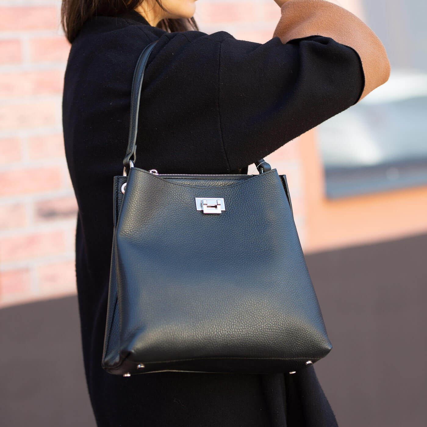Geanta este prevazuta cu doua manere din piele pentru a fi purtata in mana si o curea detasabila de piele ce permite purtarea pe umar.