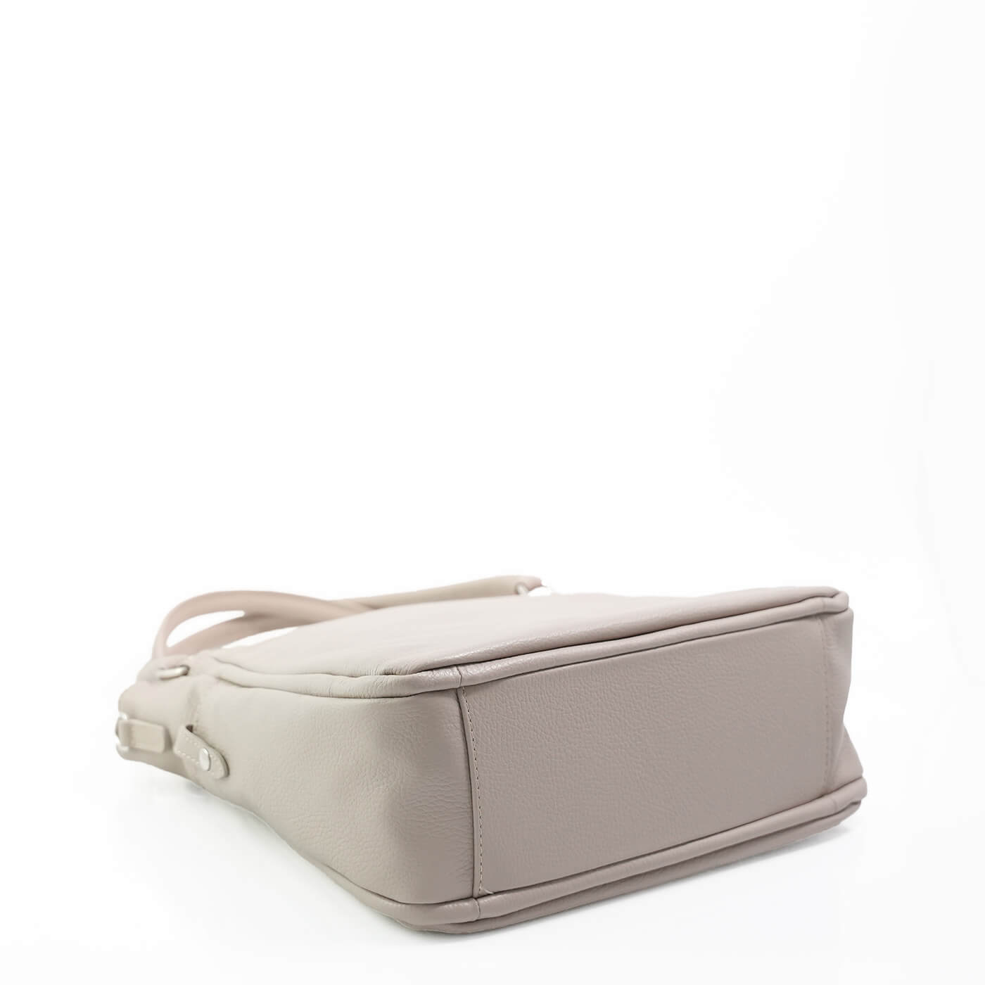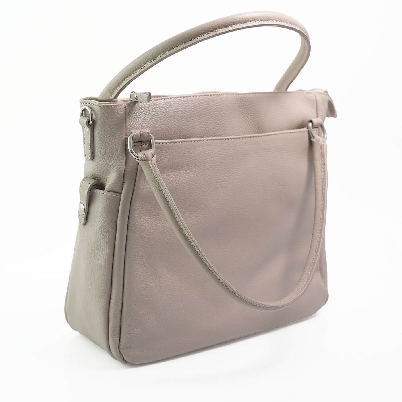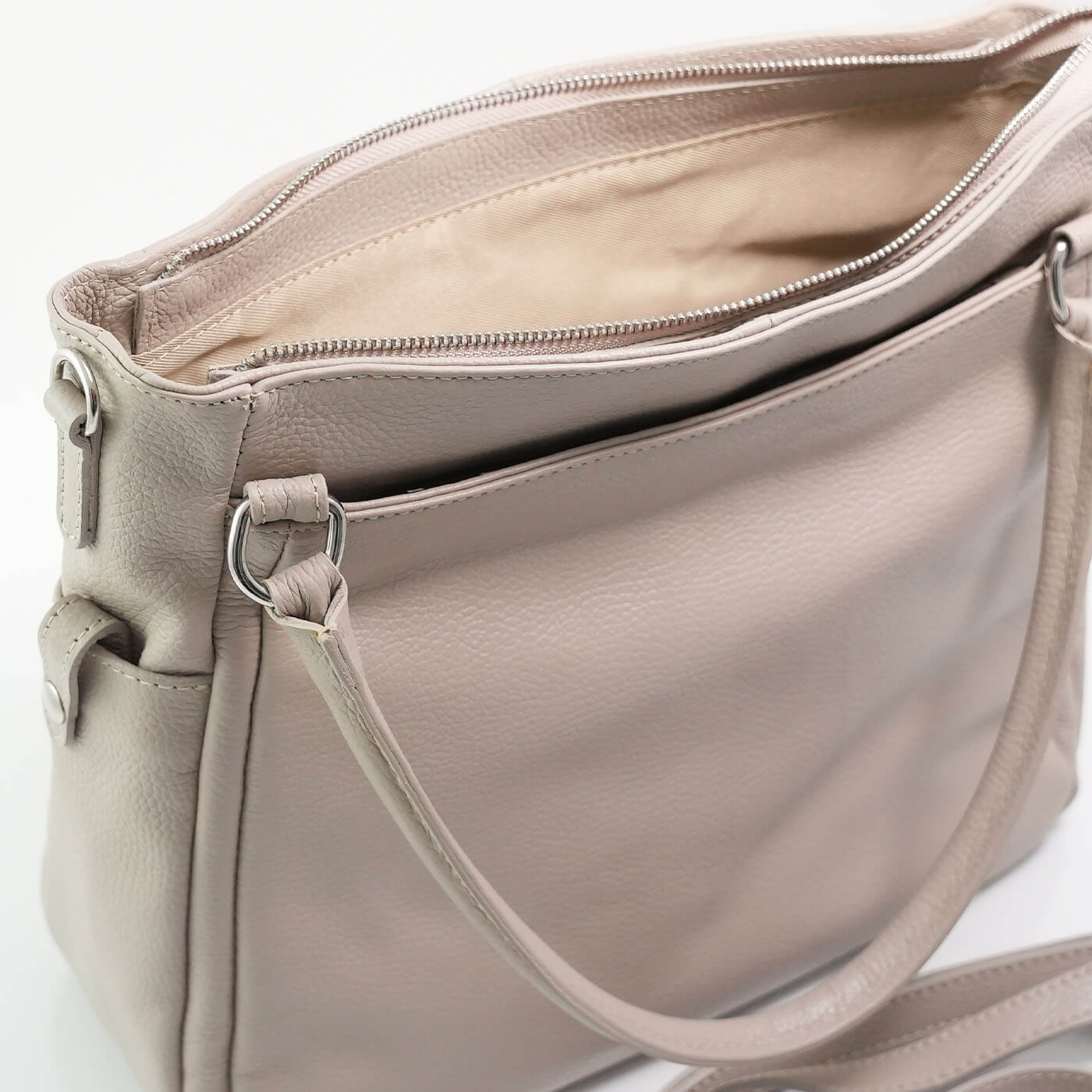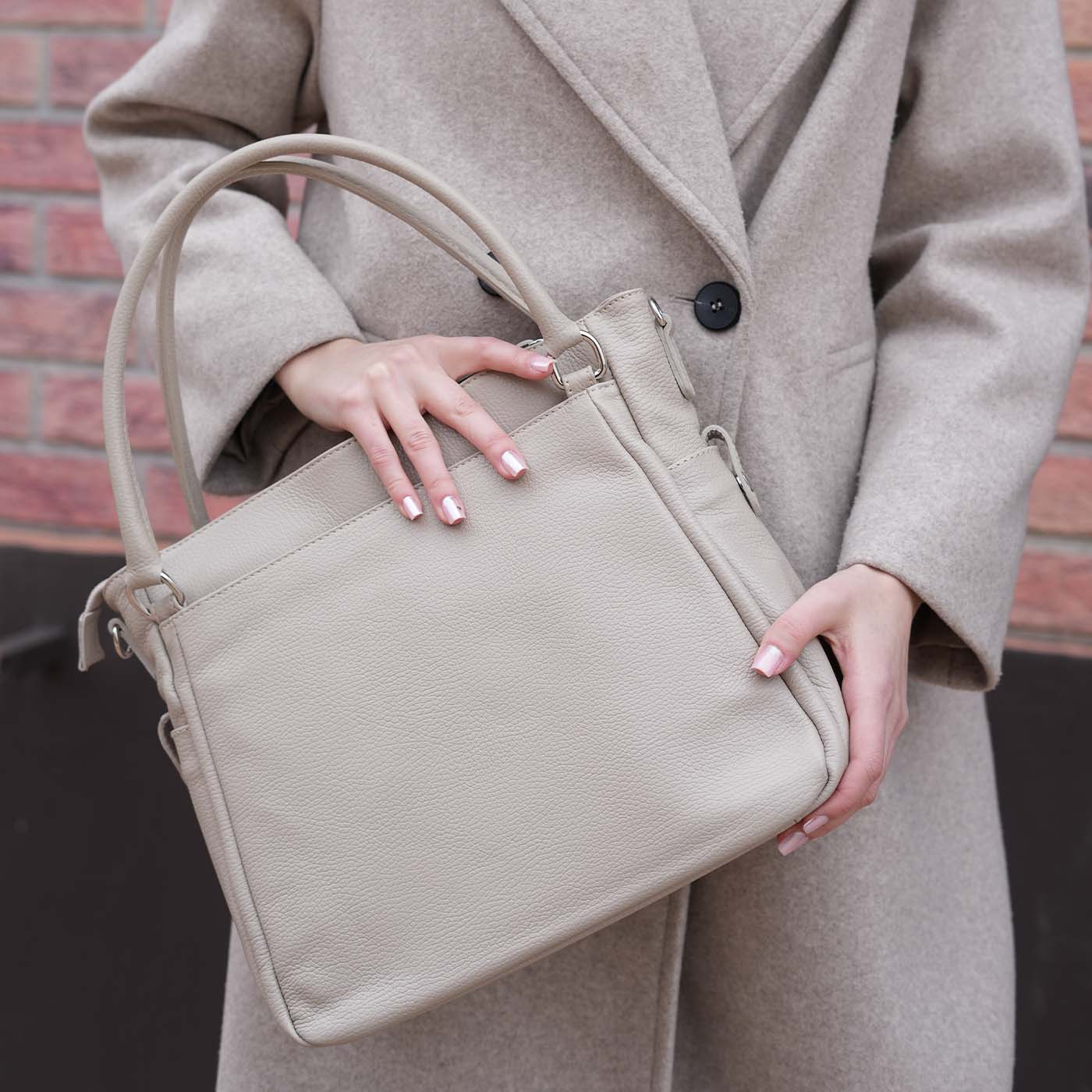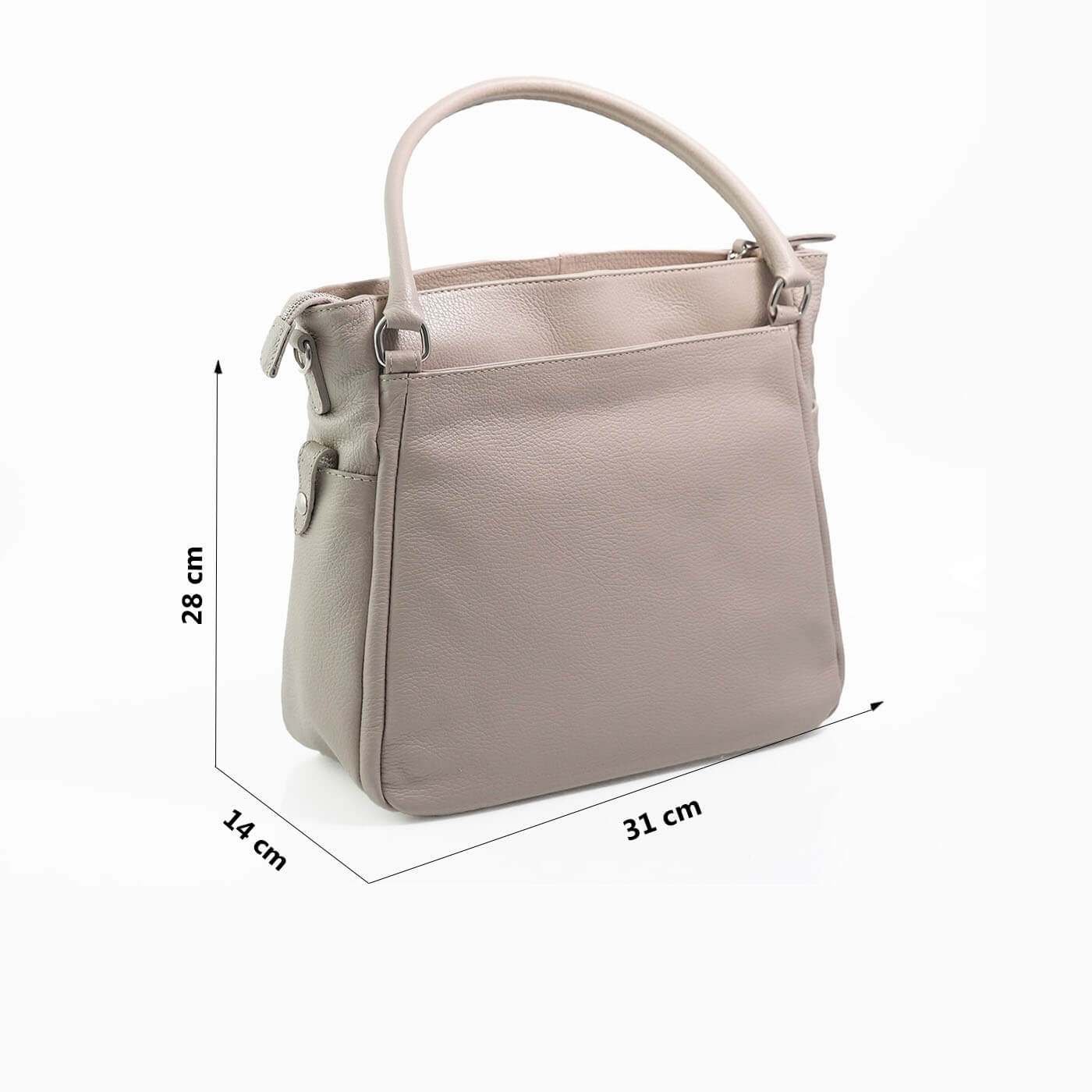 Geanta este prevazuta cu doua manere din piele pentru a fi purtata in mana si o curea detasabila de piele ce permite purtarea pe umar.