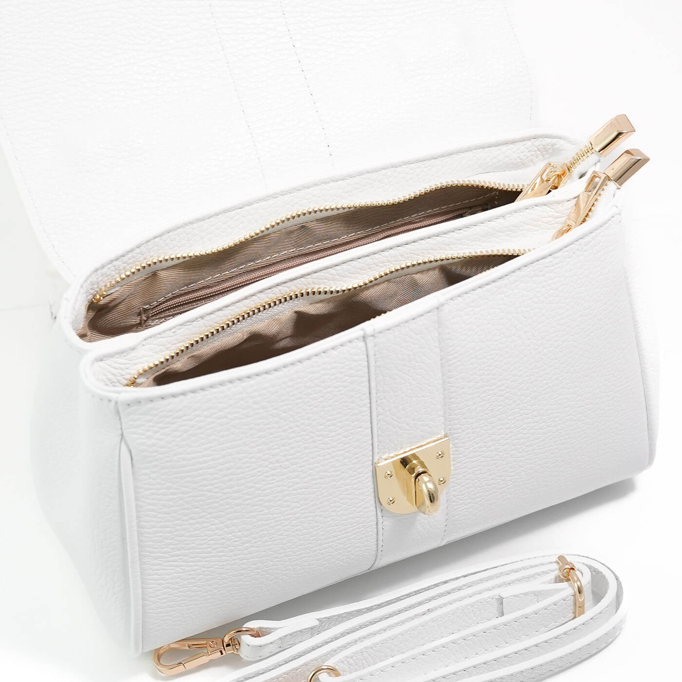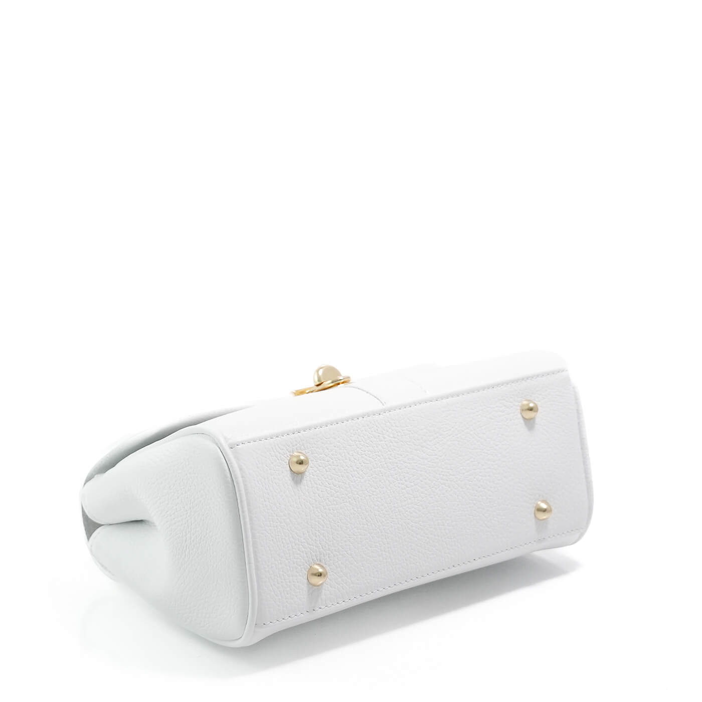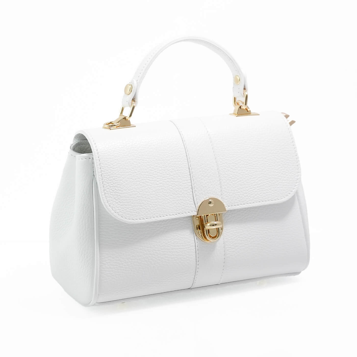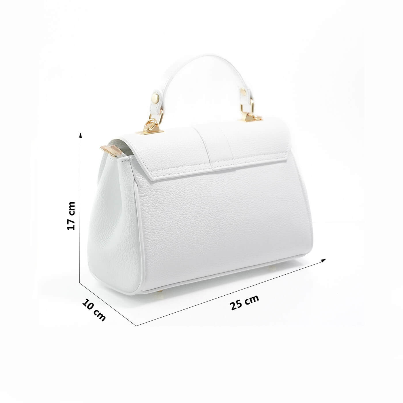 Geanta este prevazuta cu o curea din piele pentru a fi purtata in mana sau pe brat si o curea detasabila ce permite purtarea pe umar