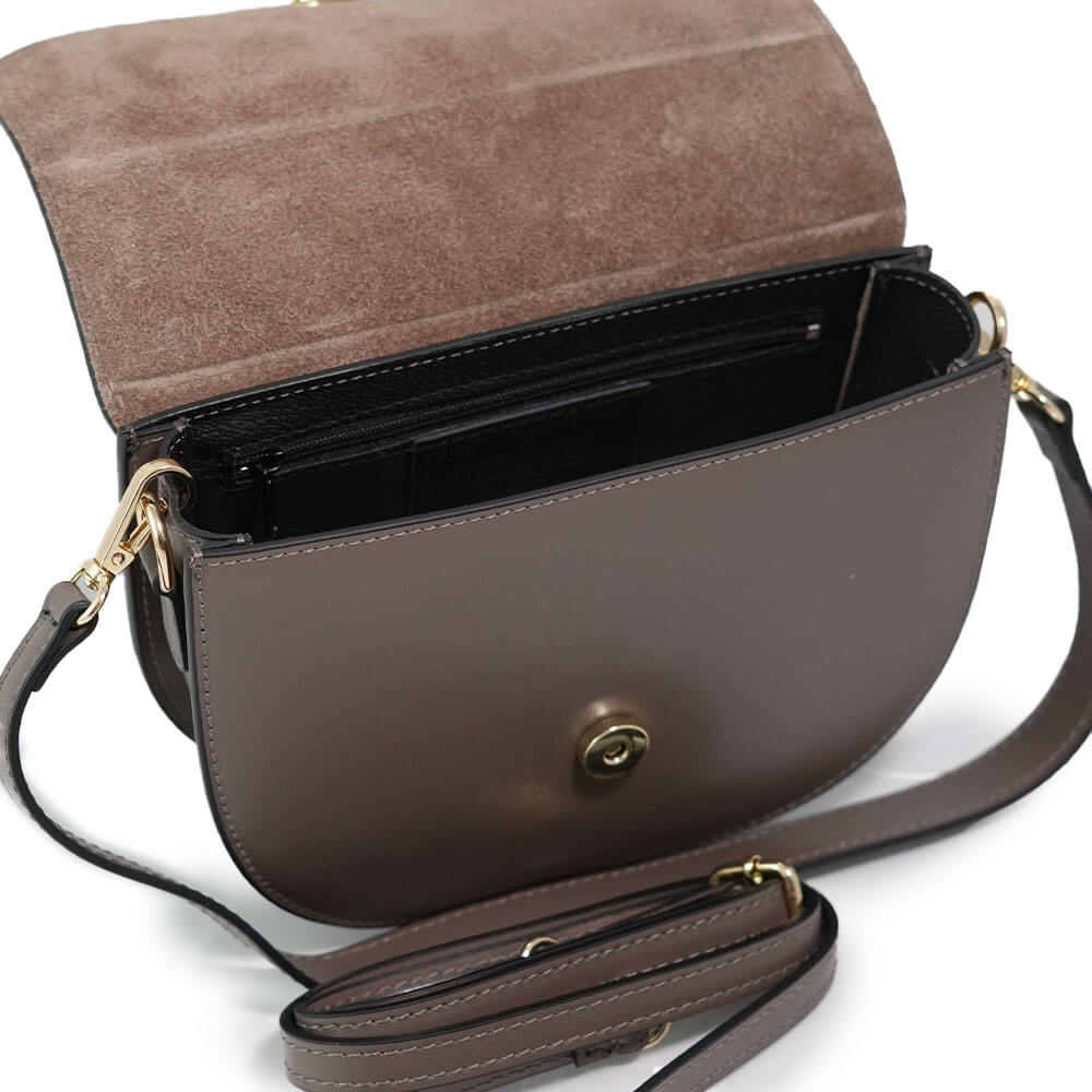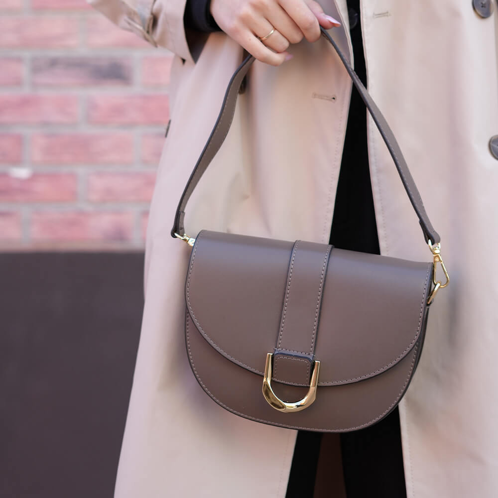 Geanta este prevazuta cu o curea din piele pentru a fi purtata in mana sau pe brat si o curea detasabila ce permite purtarea pe umar