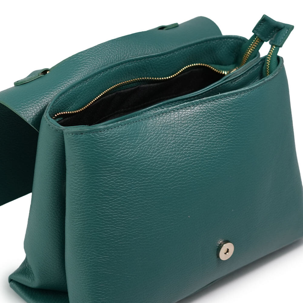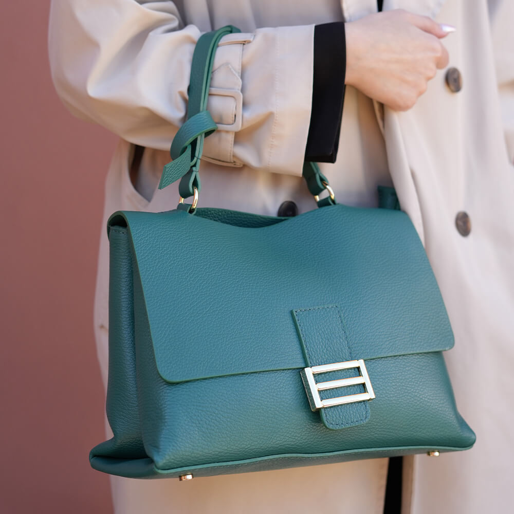 Geanta este prevazuta cu maner ce permite purtarea in mana si o curea lunga din piele, detasabila.