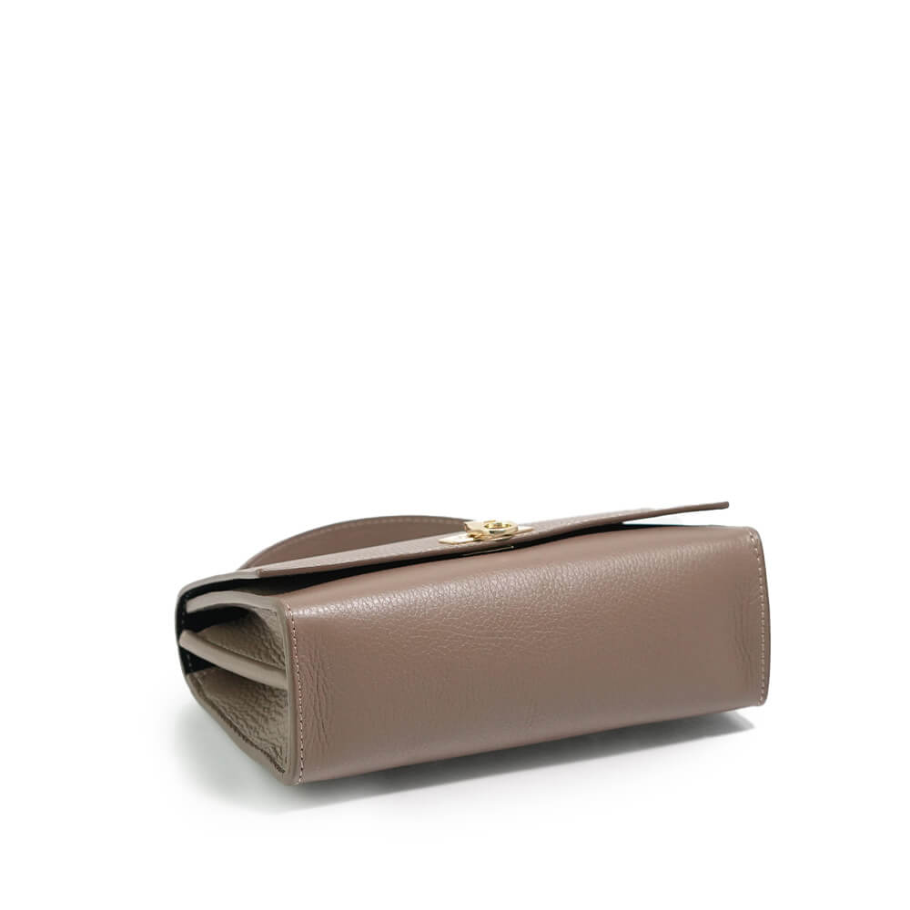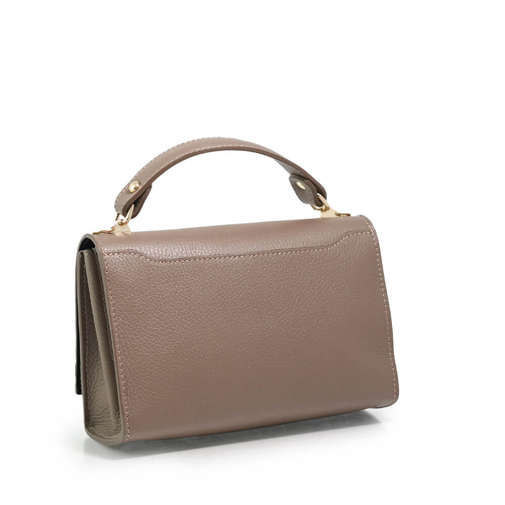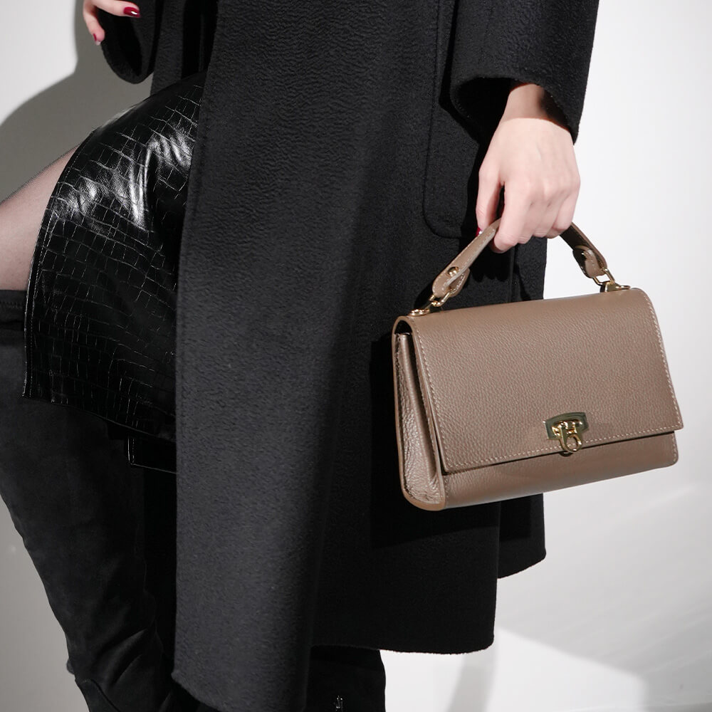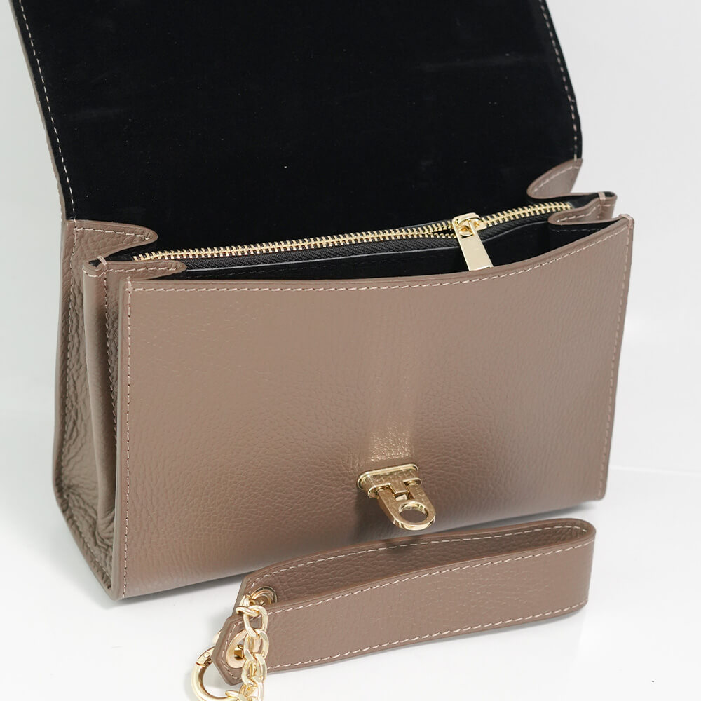 Geanta este prevazuta cu o curea din piele pentru a fi purtata in mana sau pe brat si o curea detasabila ce permite purtarea pe umar