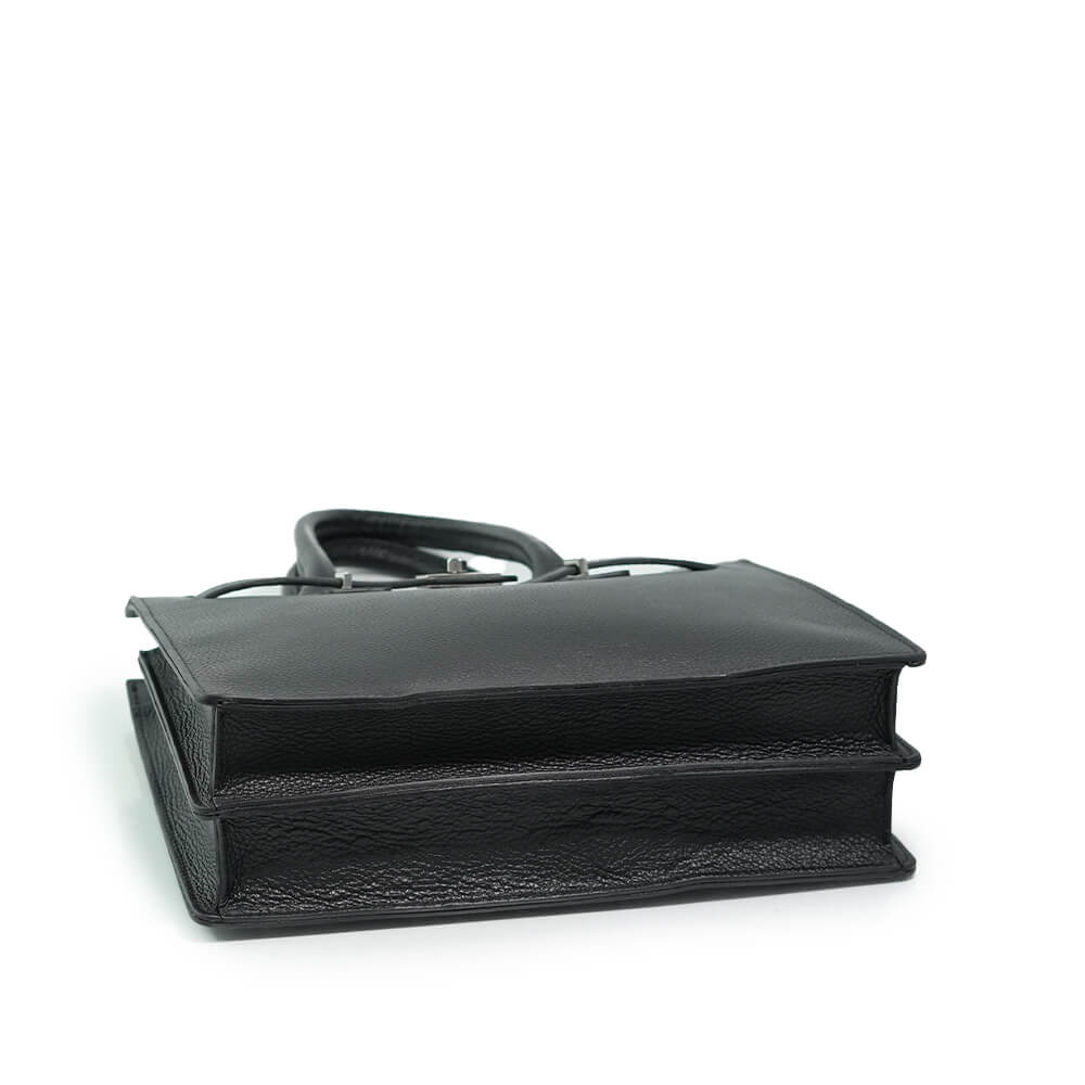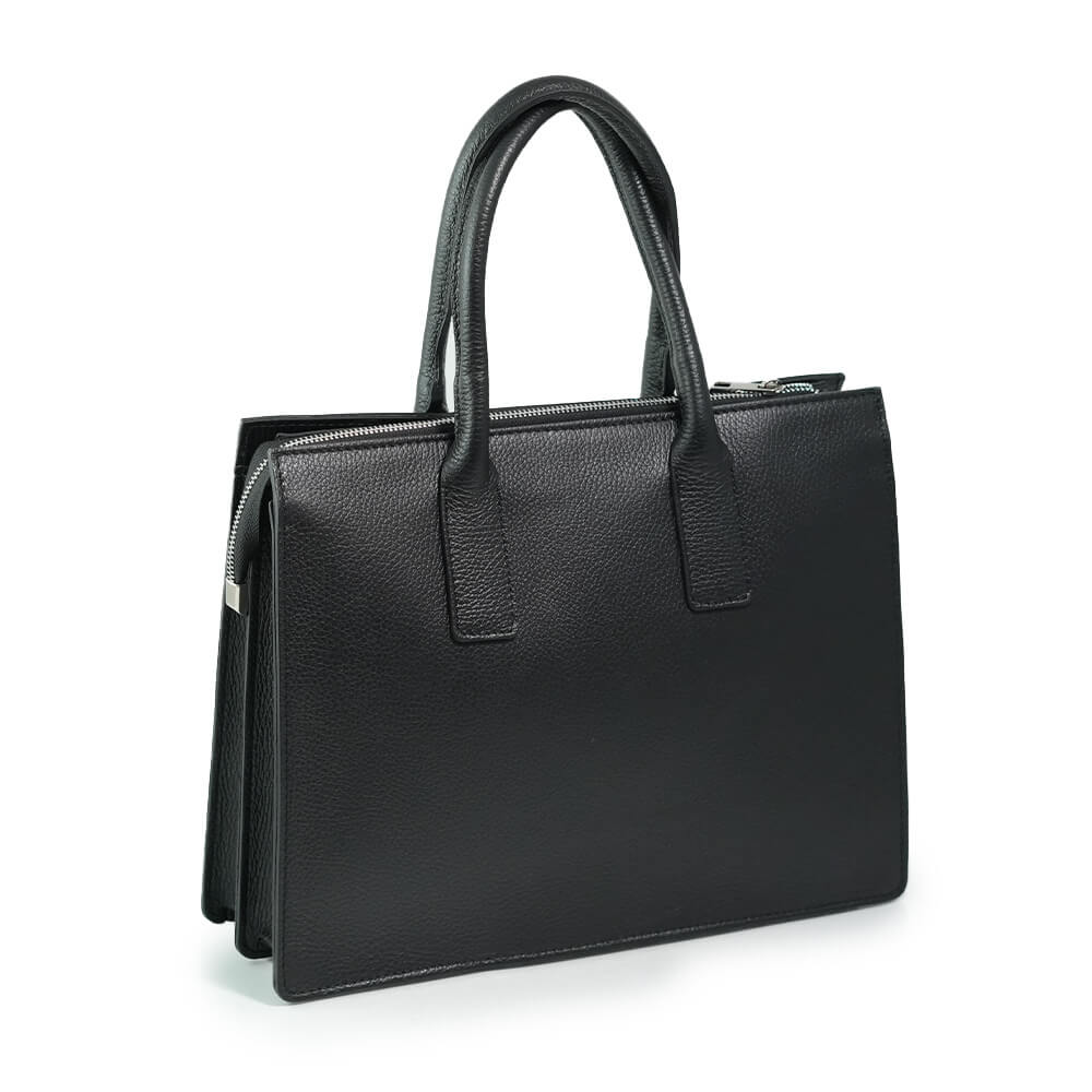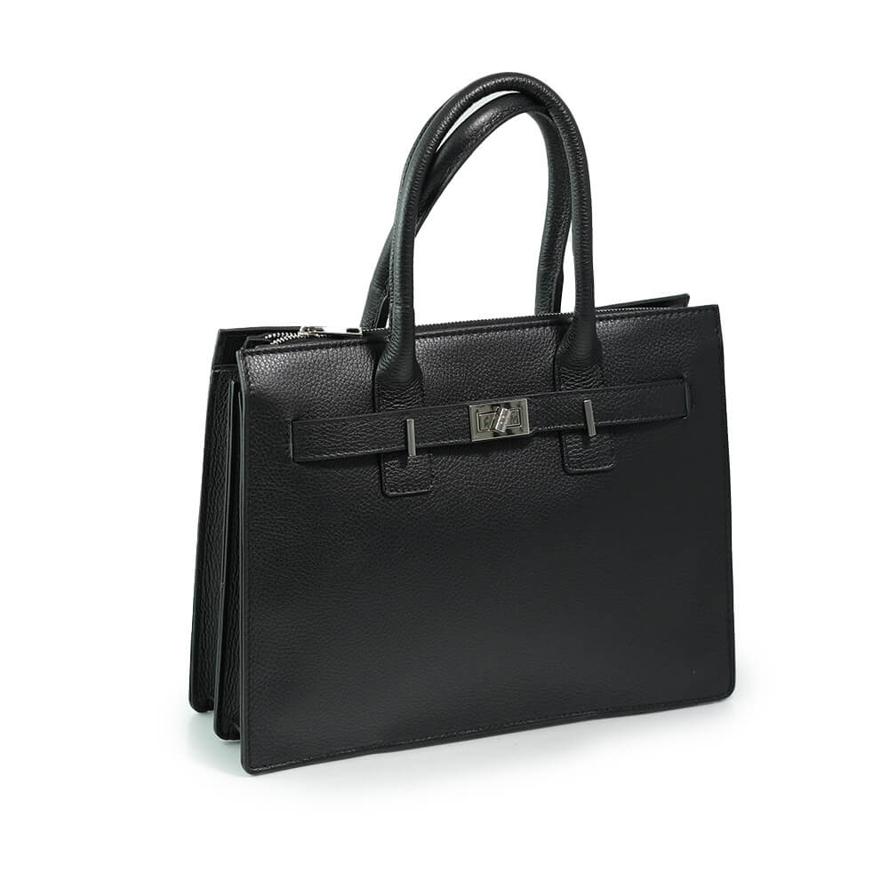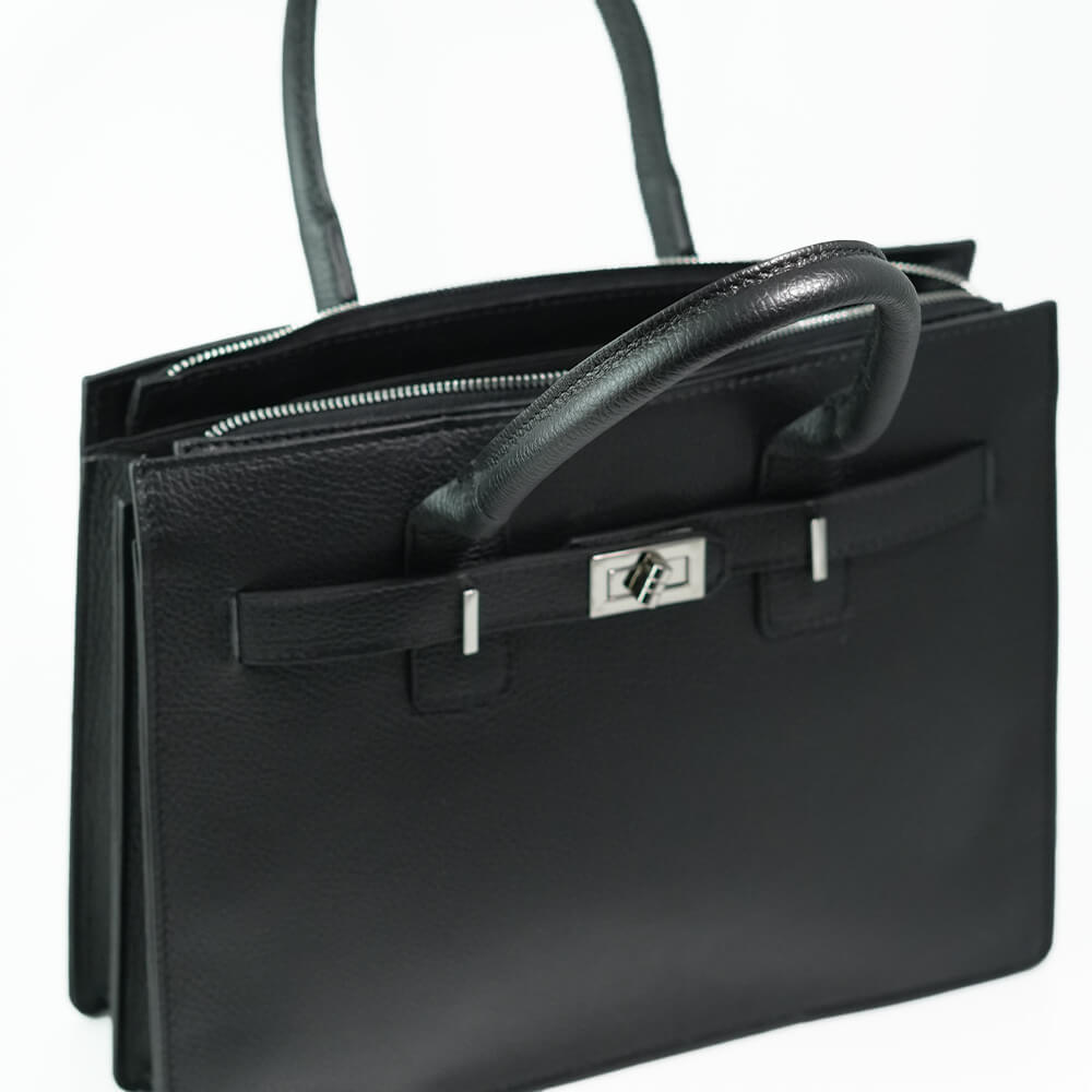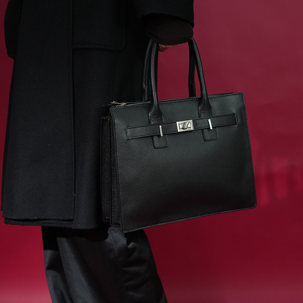 Geanta este prevazuta cu doua cureluse din piele pentru a fi purtata in mana si o curea detasabila ce permite purtarea si pe umar.