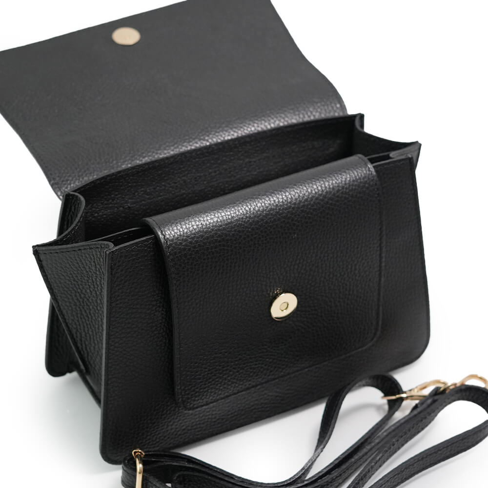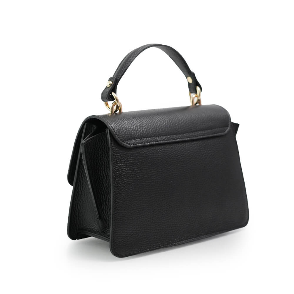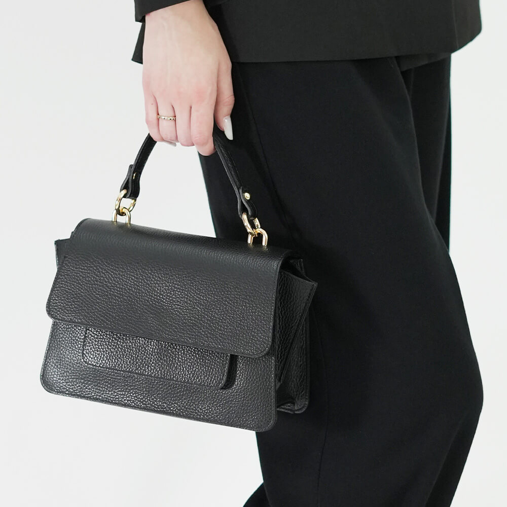 Geanta este prevazuta cu o curea din piele pentru a fi purtata in mana sau pe brat si o curea detasabila ce permite purtarea pe umar