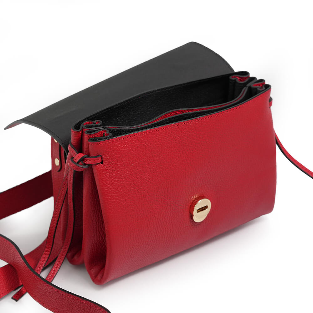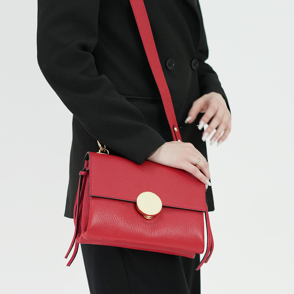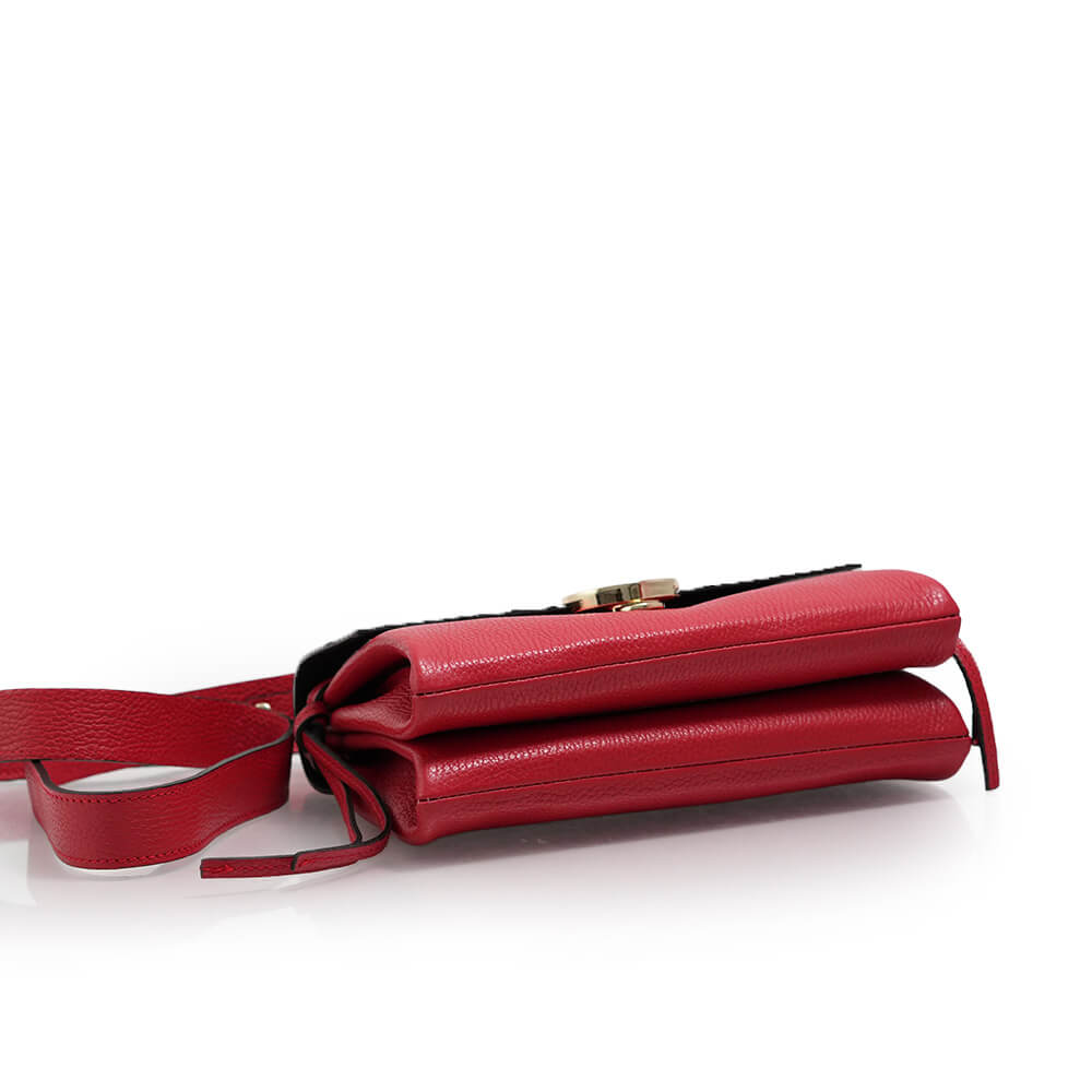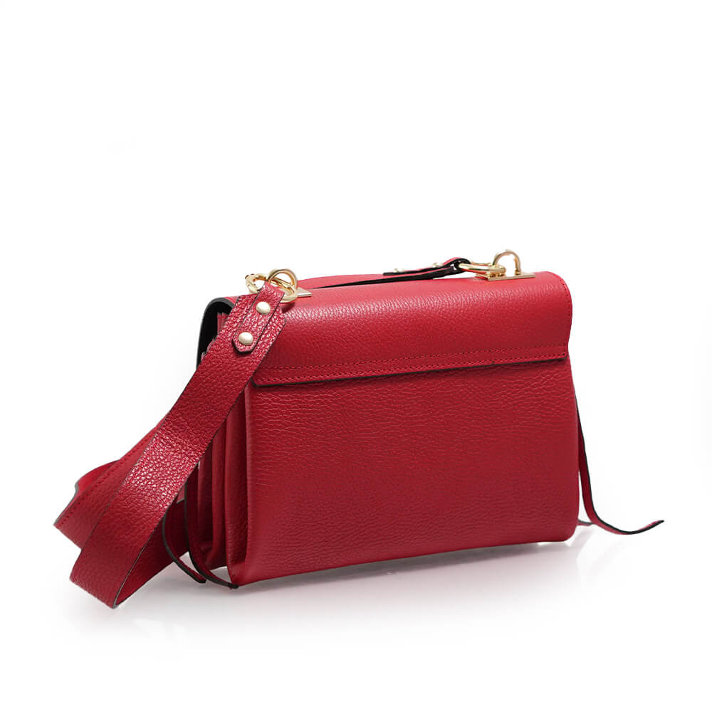 Geanta este prevazuta cu o curea detasabila din piele ce permite purtarea pe umar.