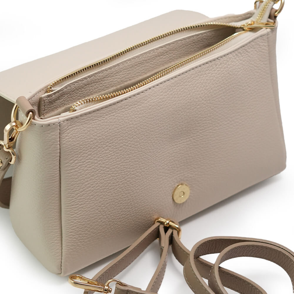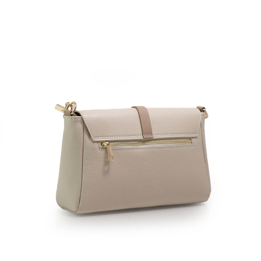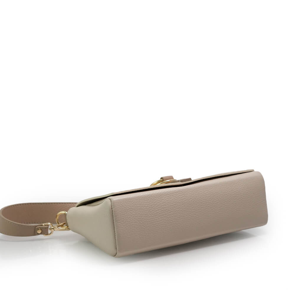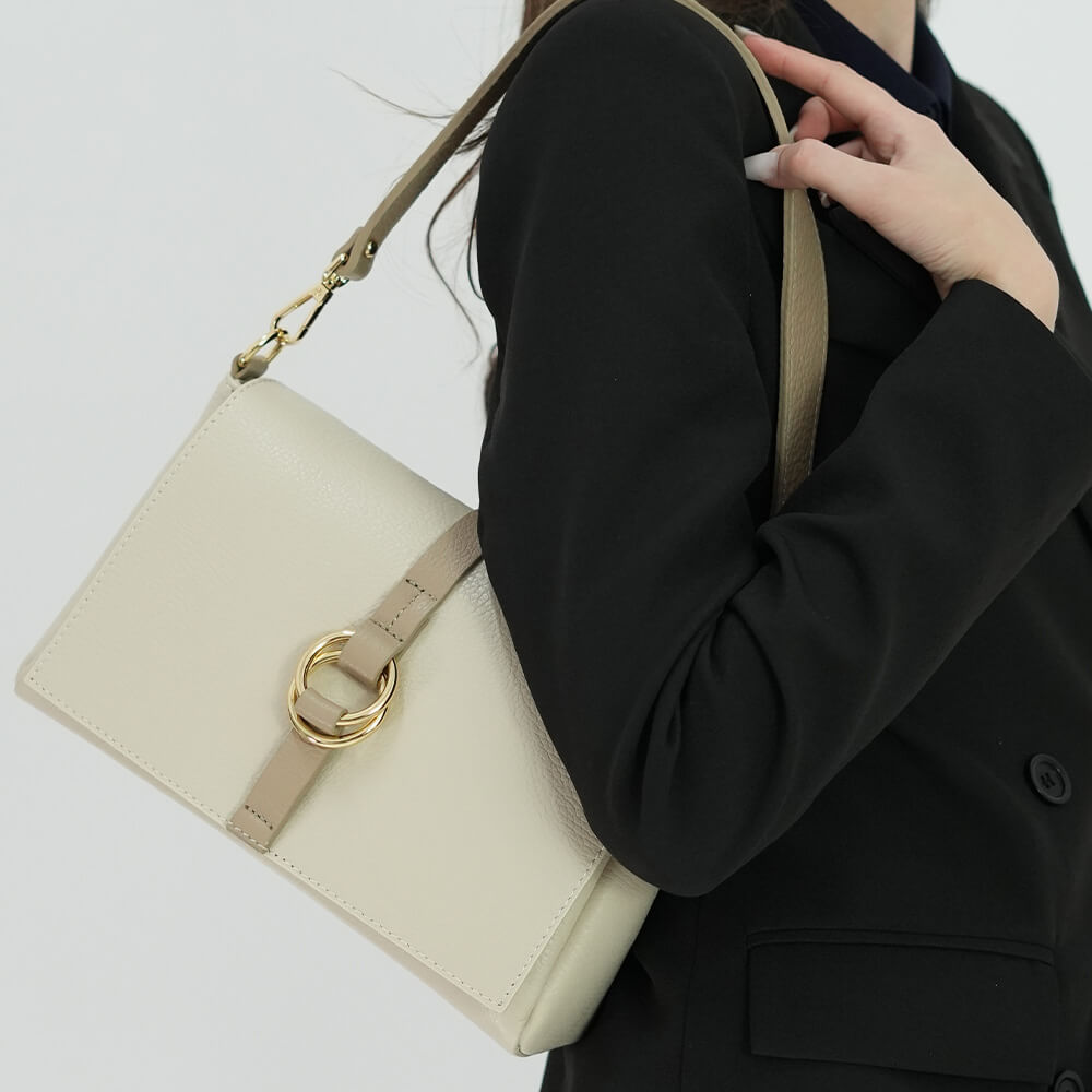 Geanta este prevazuta cu o curea din piele pentru a fi purtata in mana sau pe brat si o curea detasabila ce permite purtarea pe umar