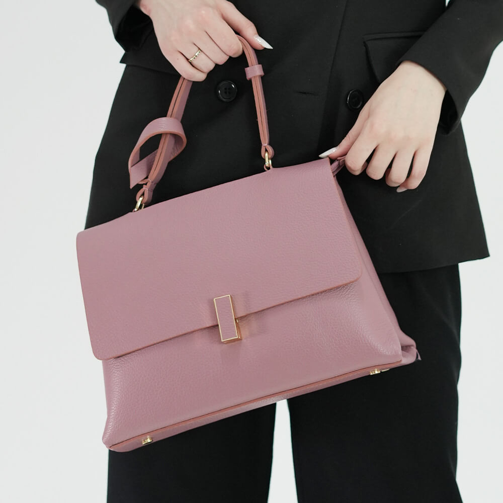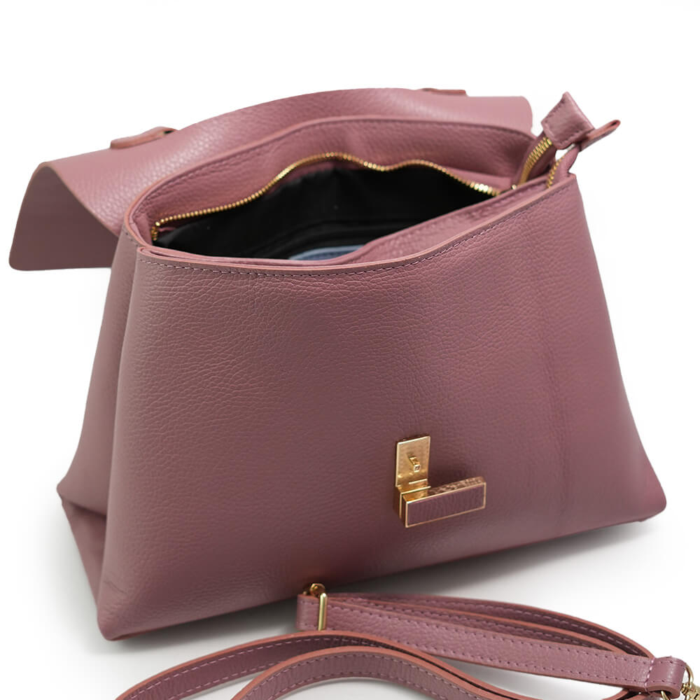 Geanta este prevazuta cu maner ce permite purtarea in mana si o curea lunga din piele, detasabila.