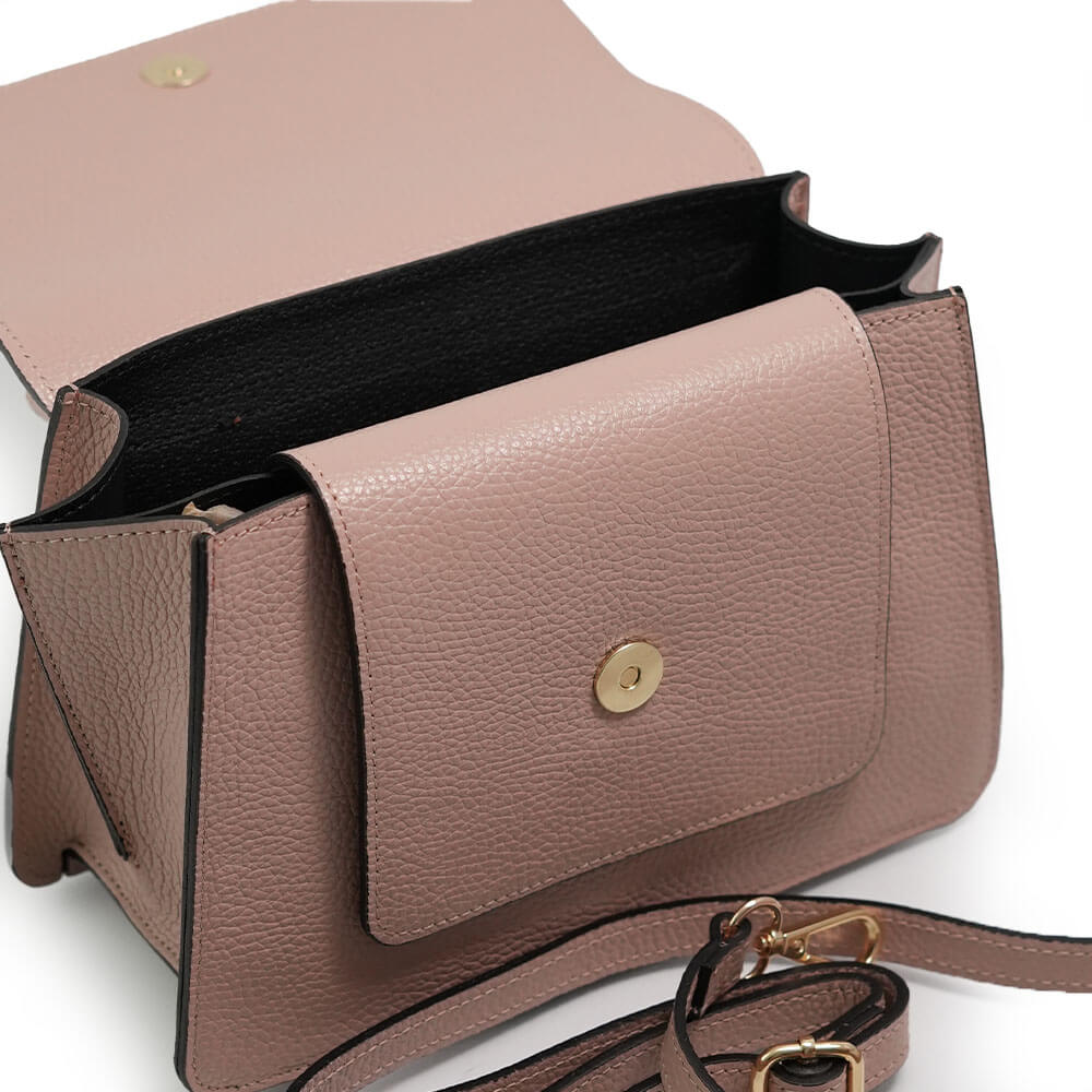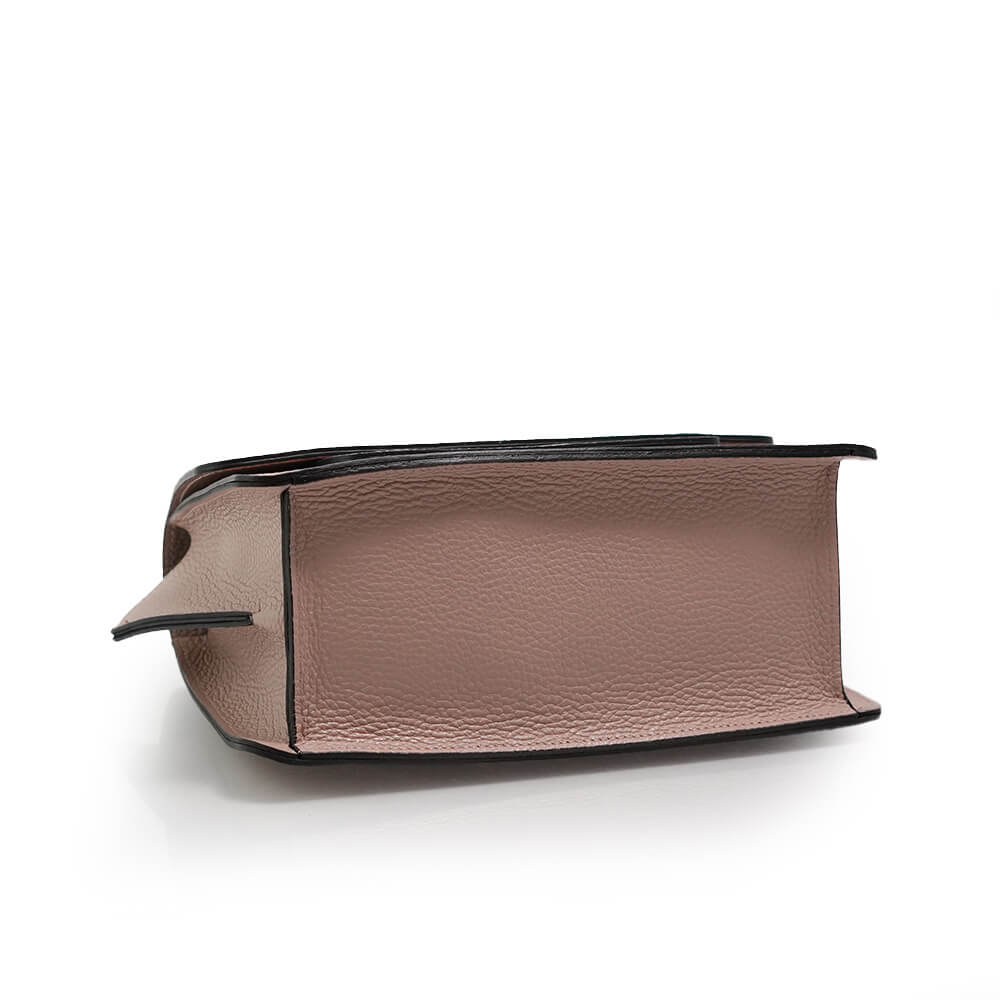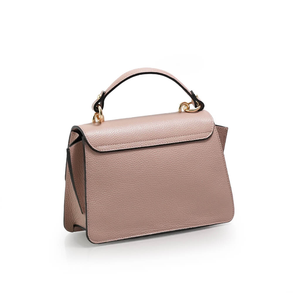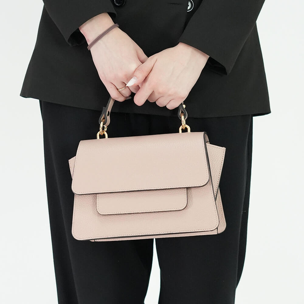 Geanta este prevazuta cu o curea din piele pentru a fi purtata in mana sau pe brat si o curea detasabila ce permite purtarea pe umar