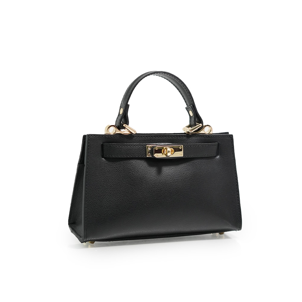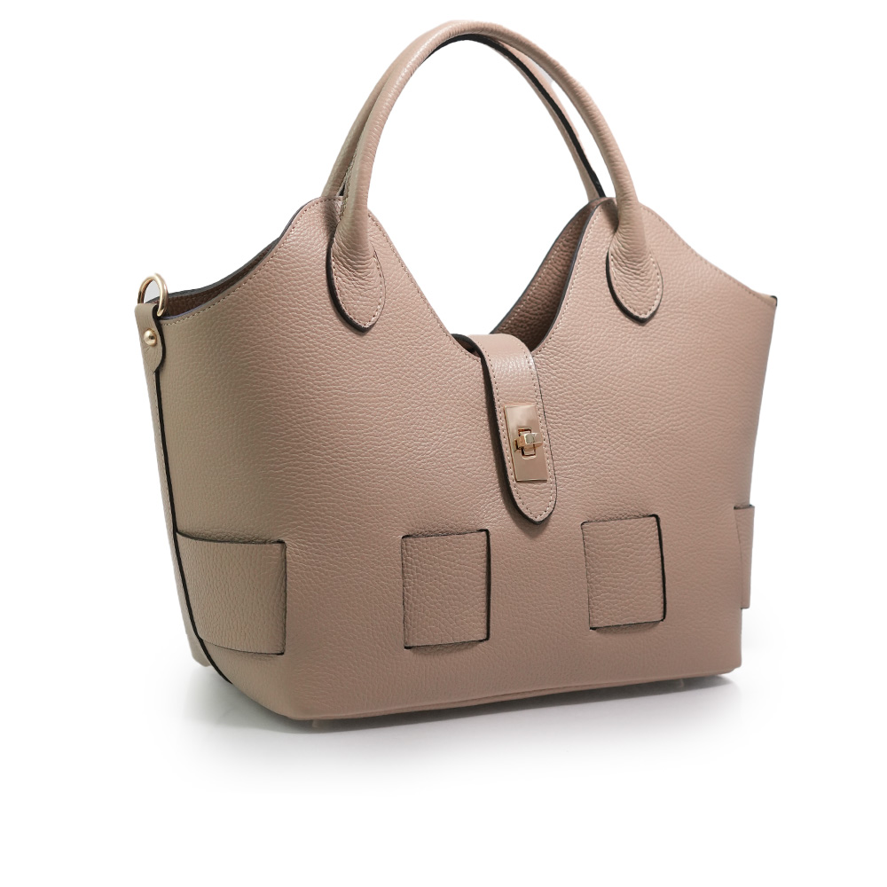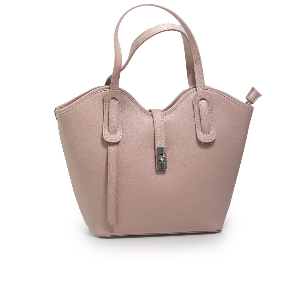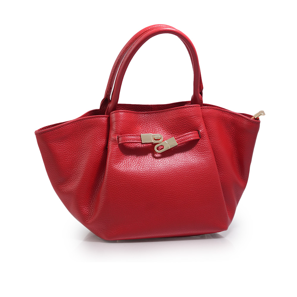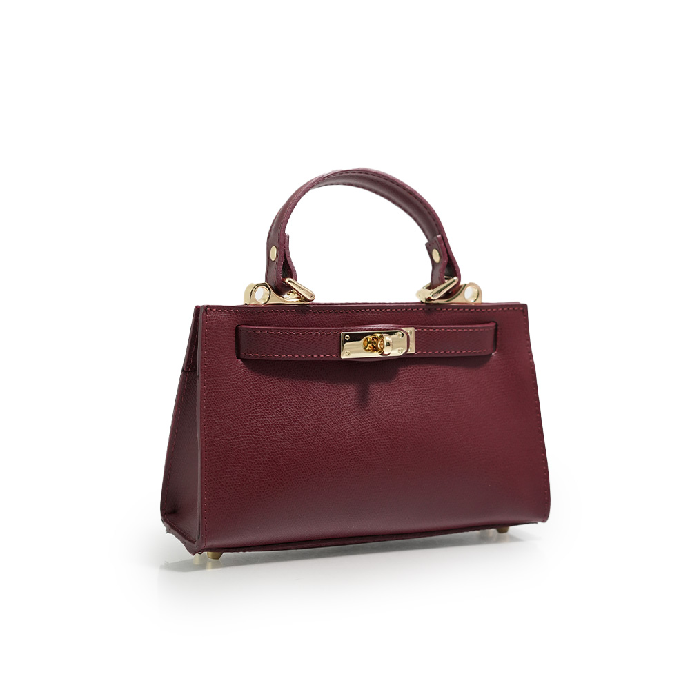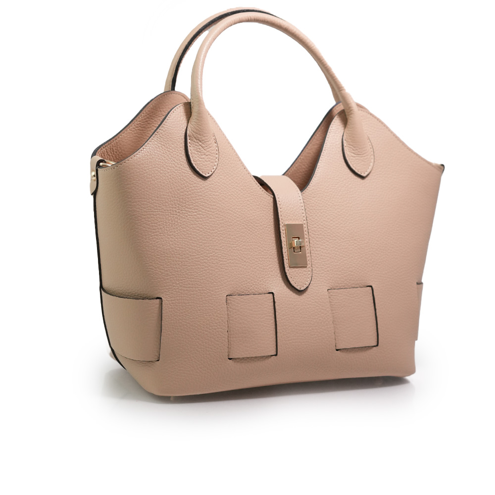 Geanta este prevazuta cu o curea din piele pentru a fi purtata in mana sau pe brat si o curea detasabila ce permite purtarea pe umar