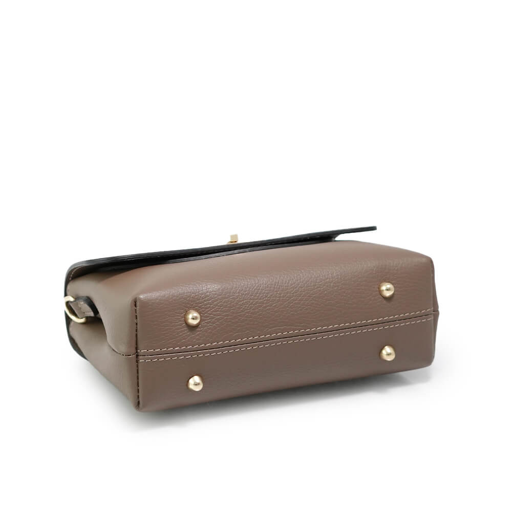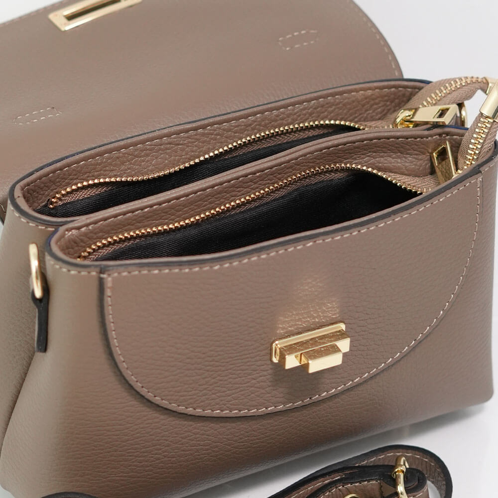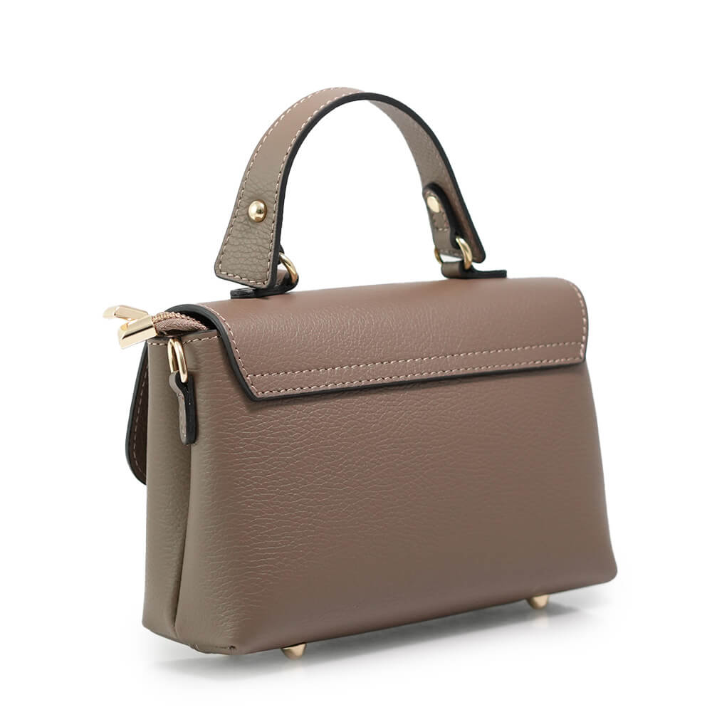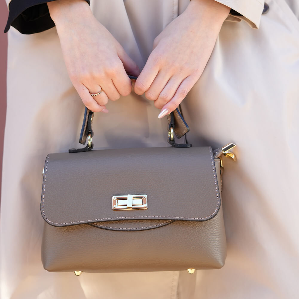 Geanta este prevazuta cu o curea din piele pentru a fi purtata in mana sau pe brat si o curea detasabila ce permite purtarea pe umar