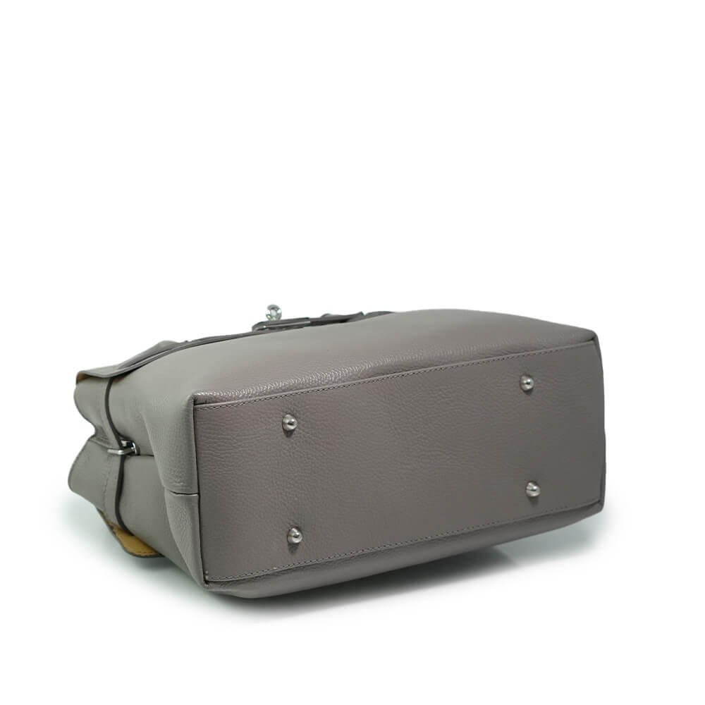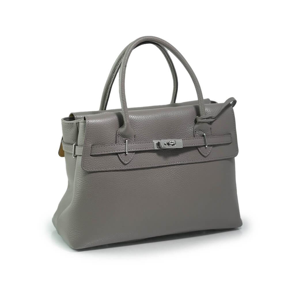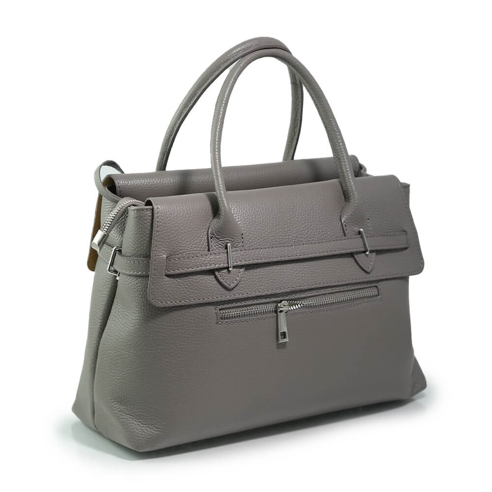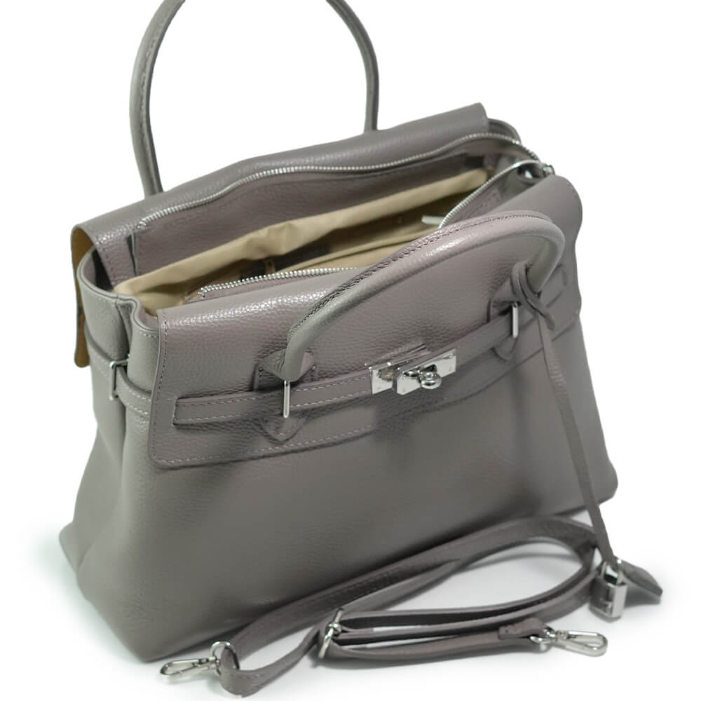 Geanta este prevazuta cu doua cureluse din piele pentru a fi purtata in mana si o curea detasabila ce permite purtarea si pe umar.