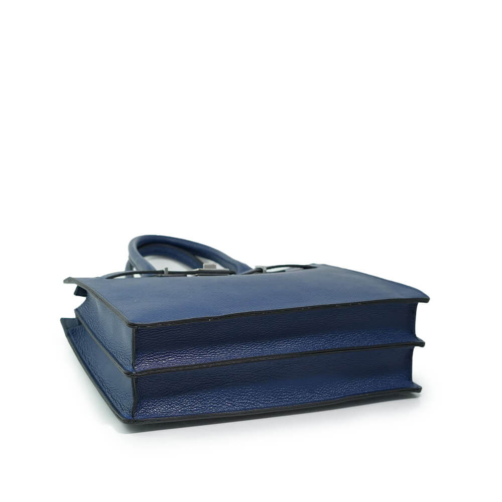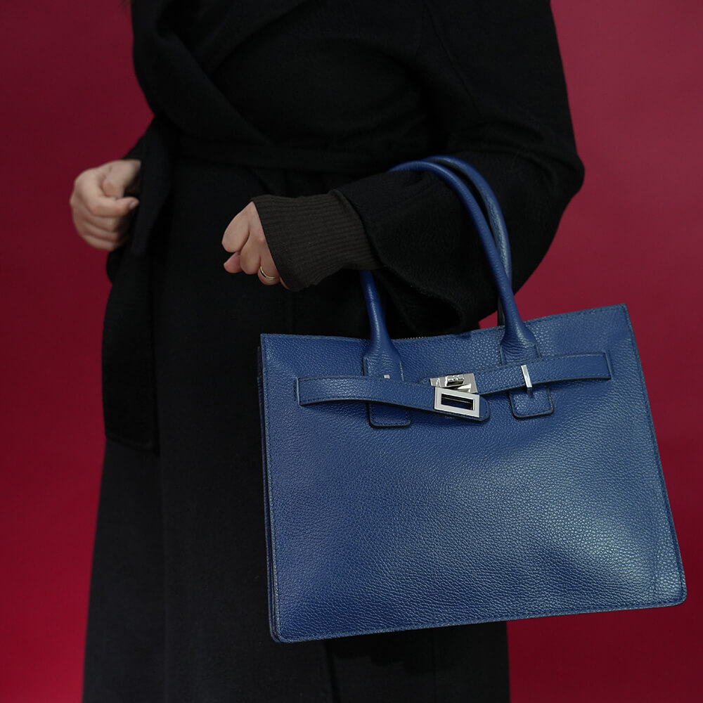 Geanta este prevazuta cu doua cureluse din piele pentru a fi purtata in mana si o curea detasabila ce permite purtarea si pe umar.