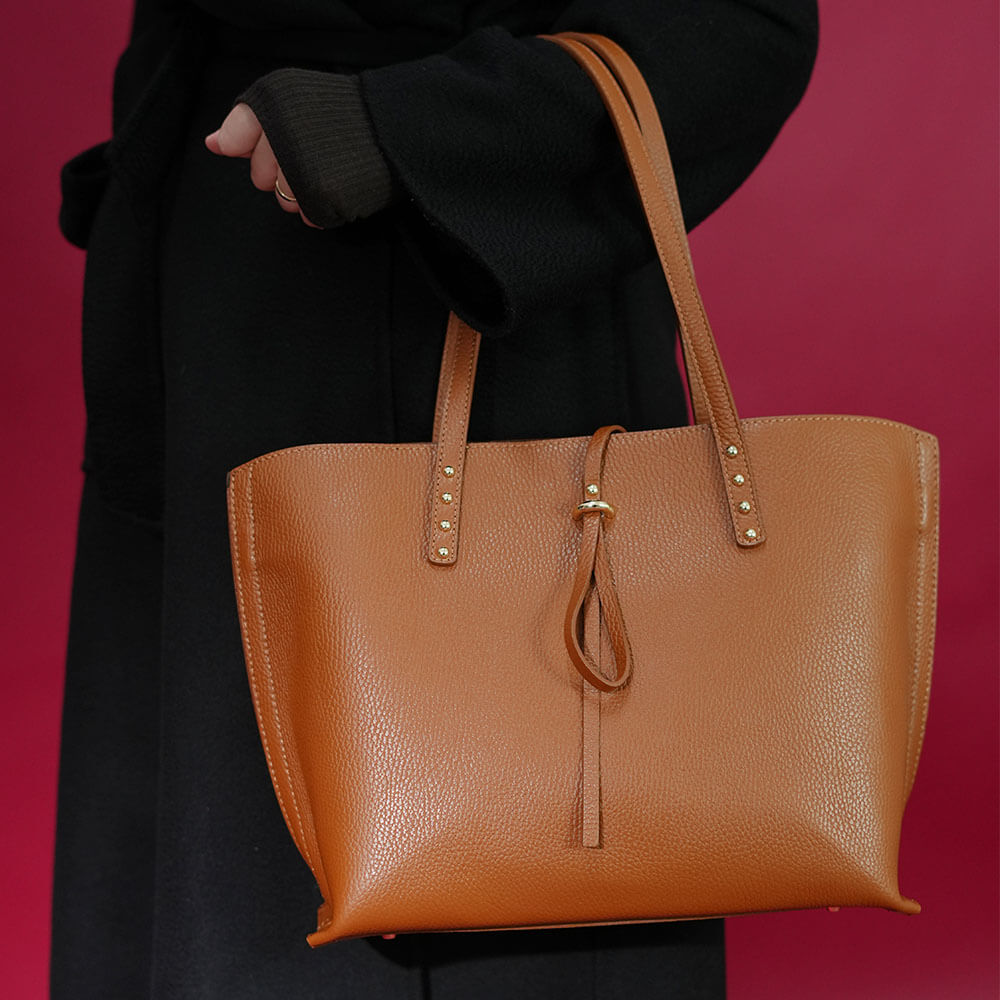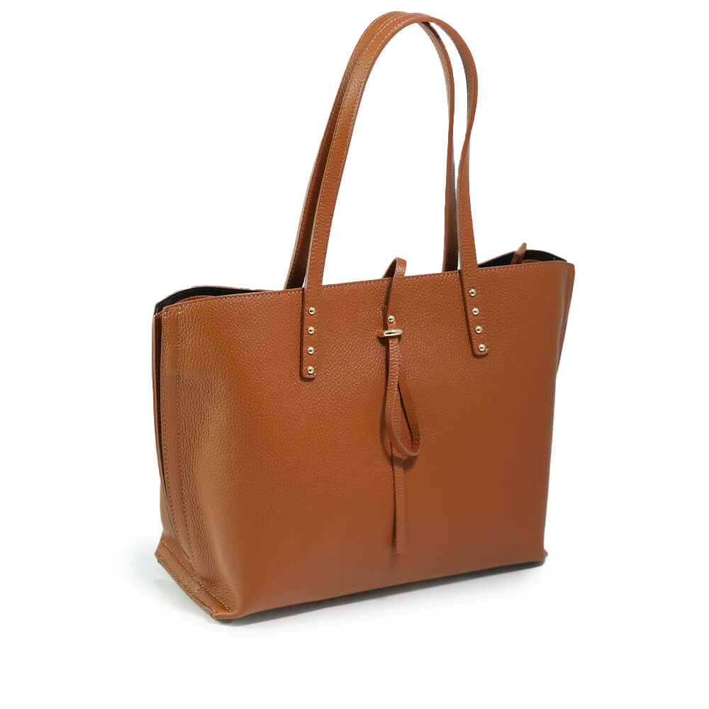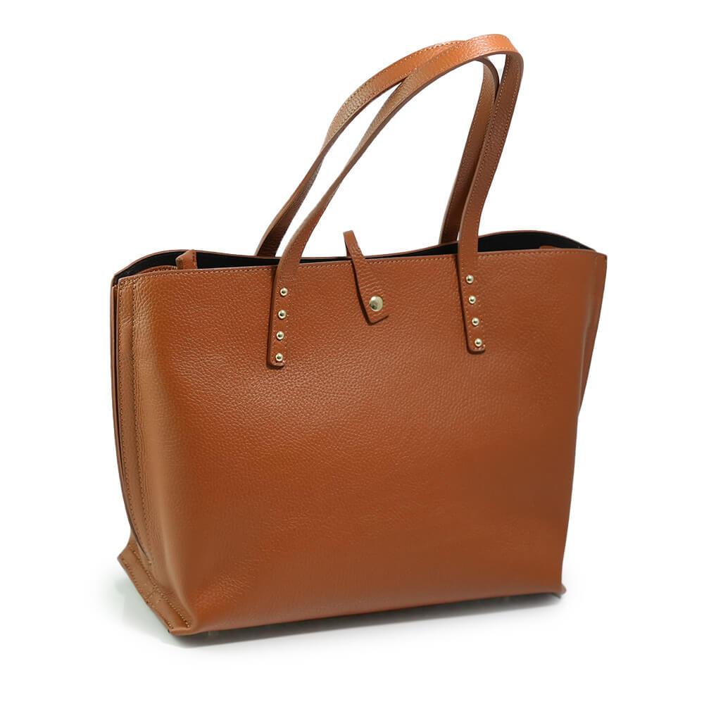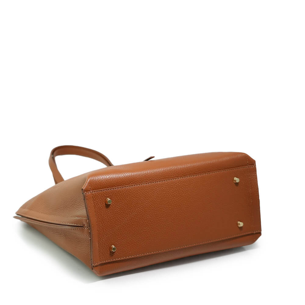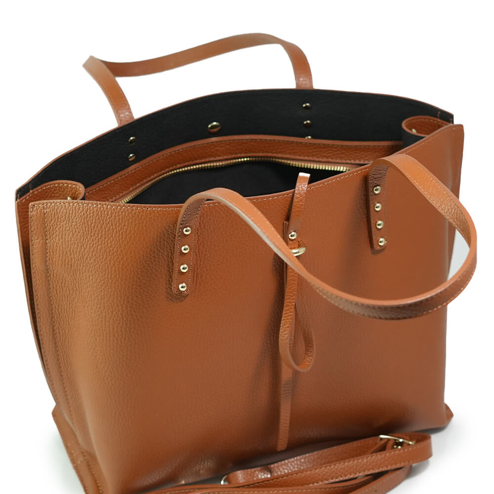 Geanta este prevazuta cu doua manere din piele pentru a fi purtata in mana si o curea detasabila de piele ce permite purtarea pe umar.