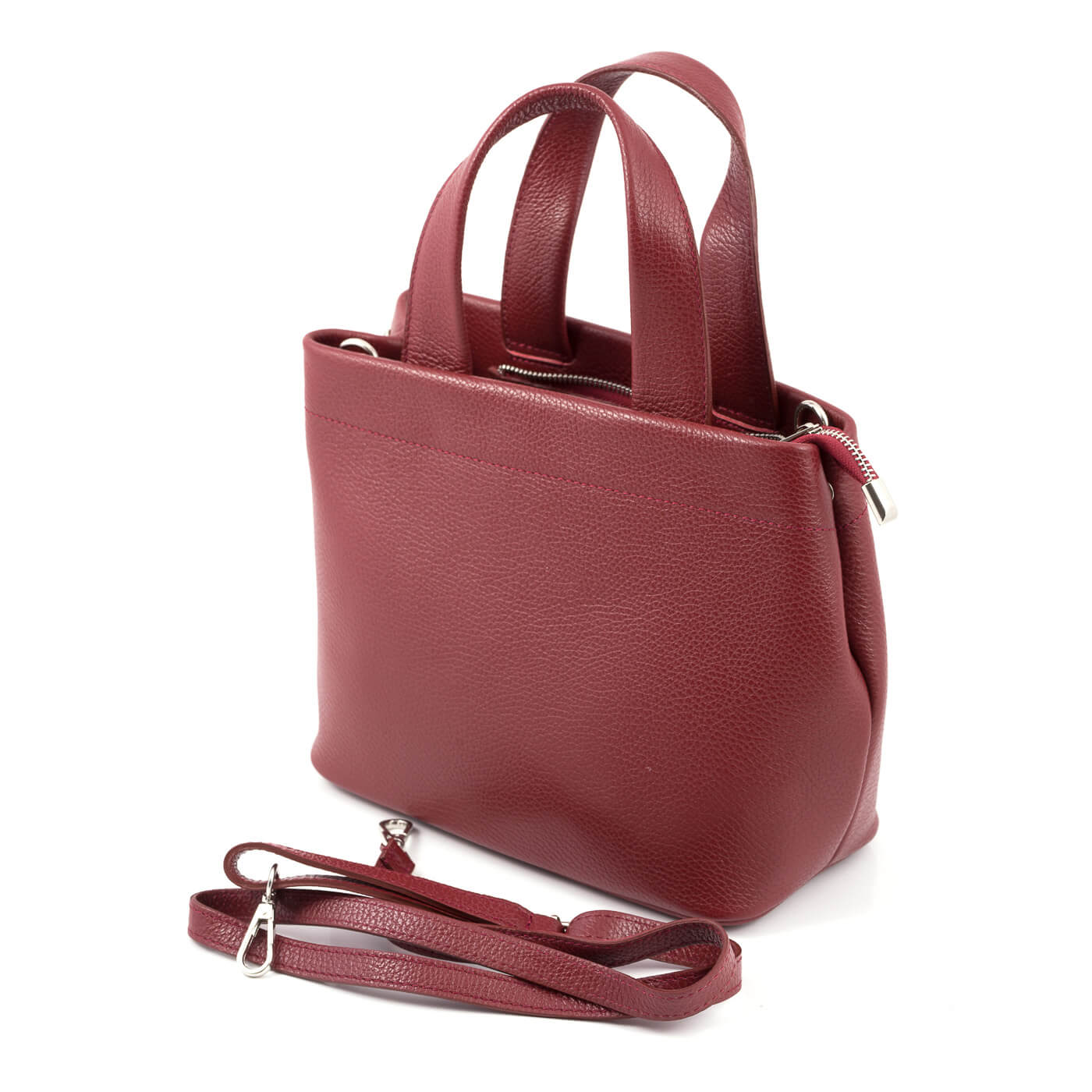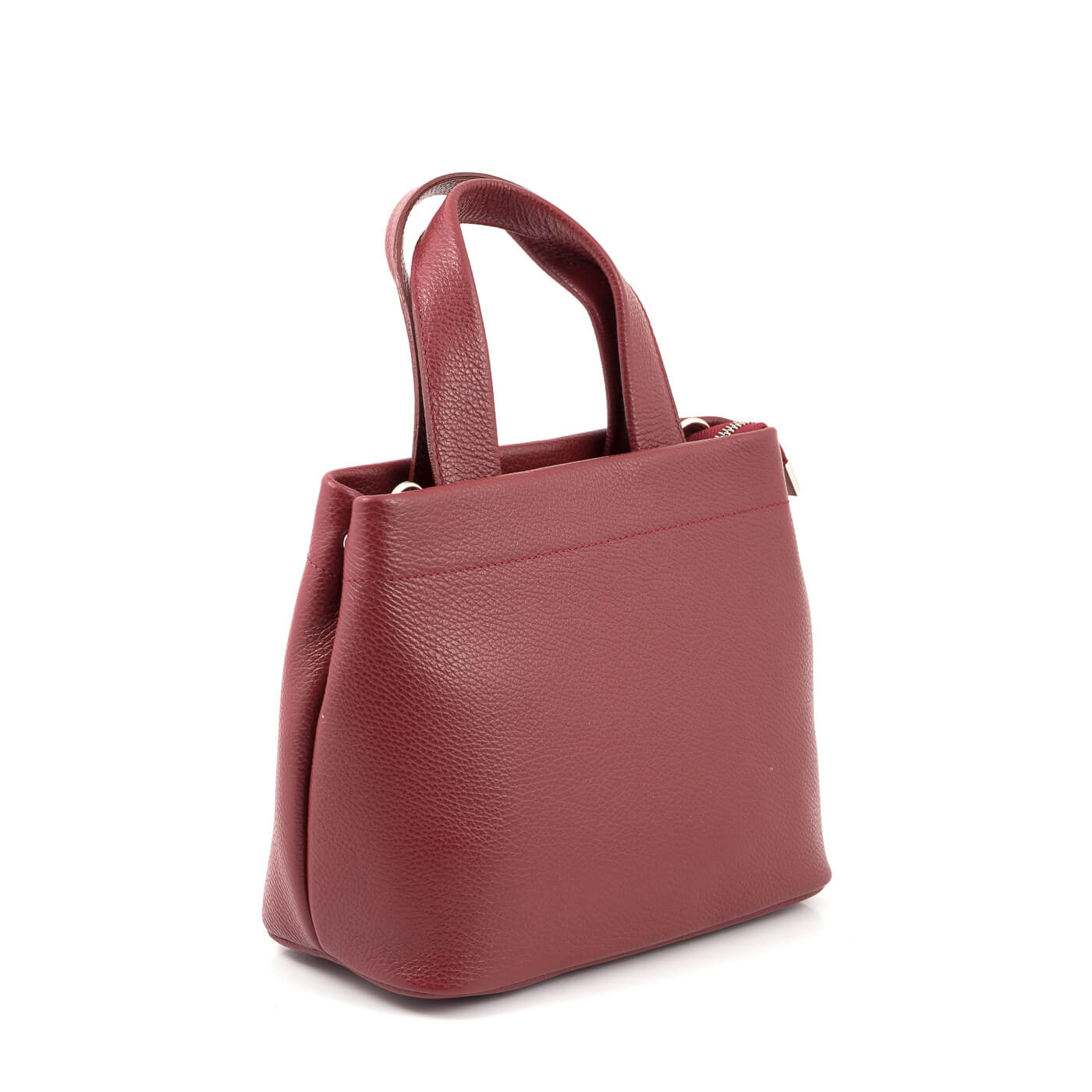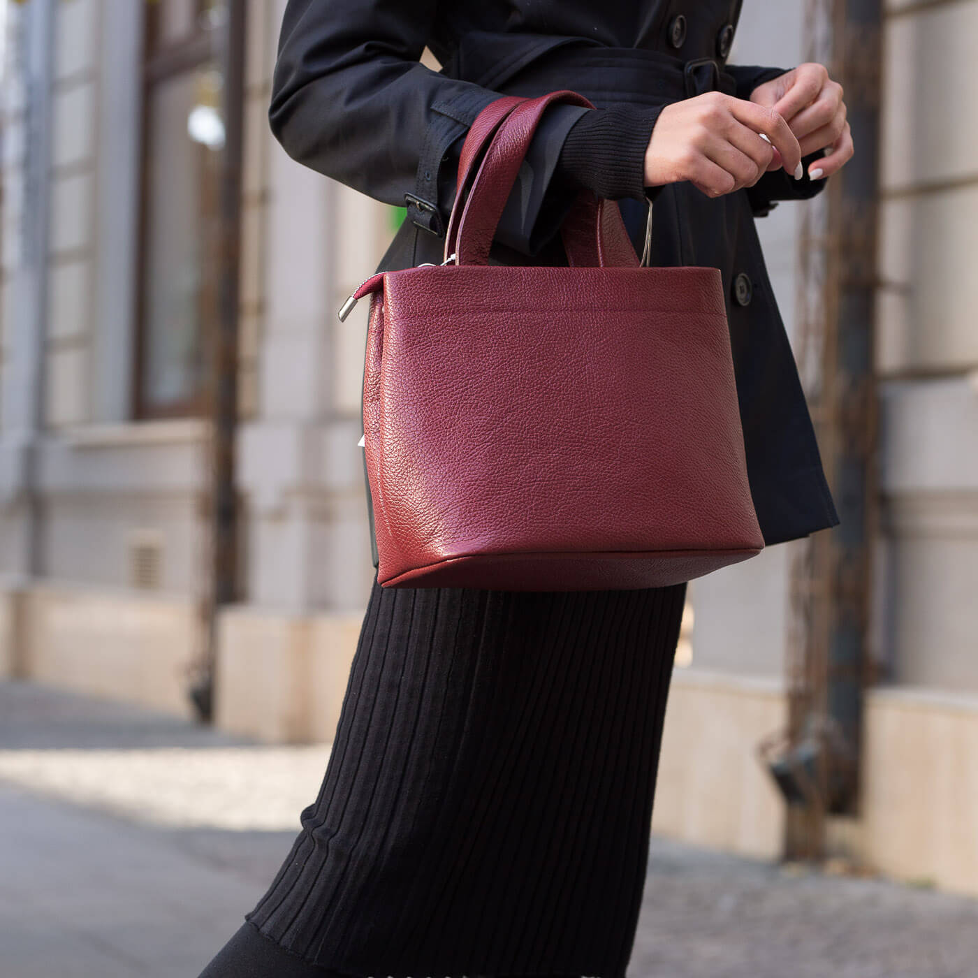 Geanta este prevazuta cu doua manere din piele pentru a fi purtata in mana si o curea detasabila ce permite purtarea pe umar.
