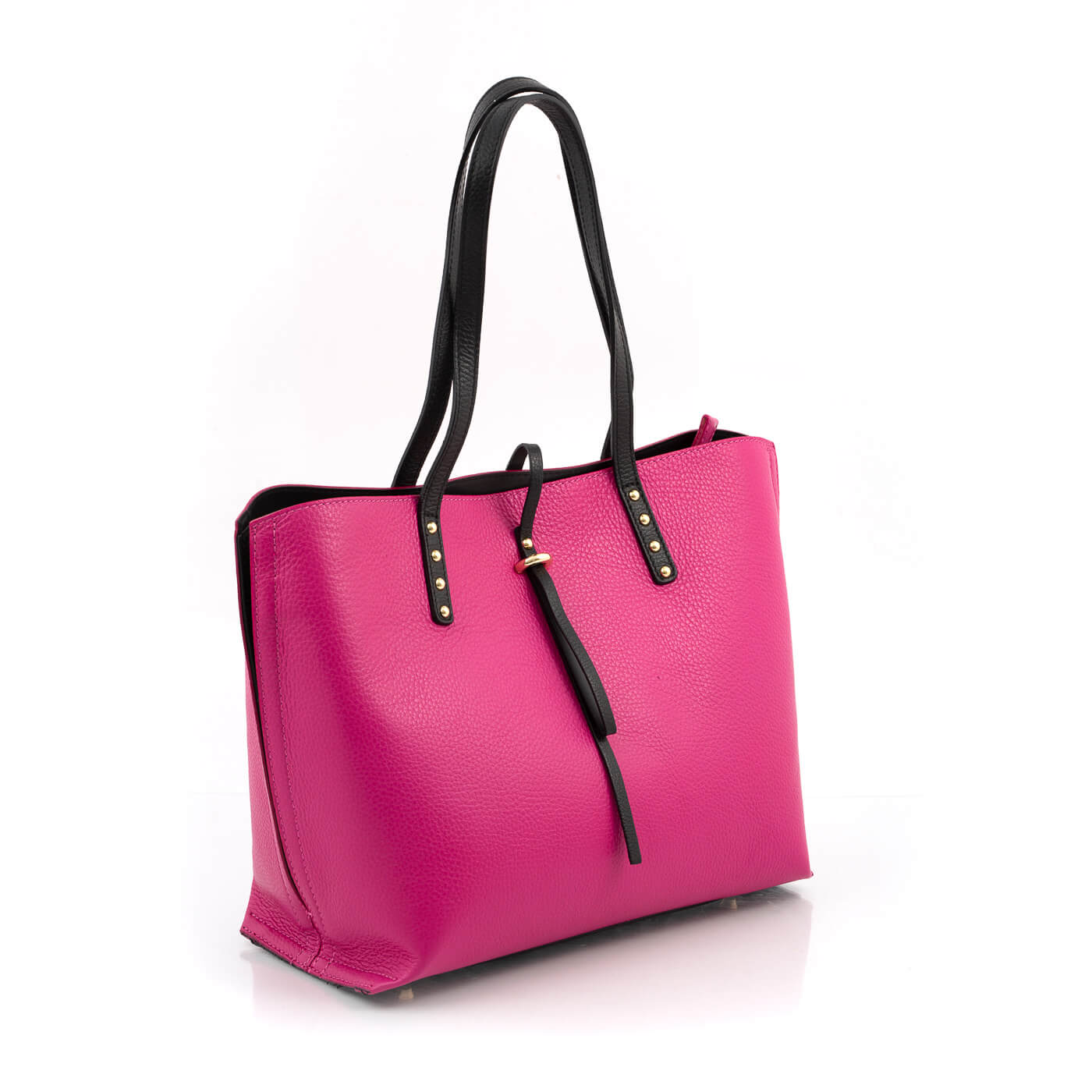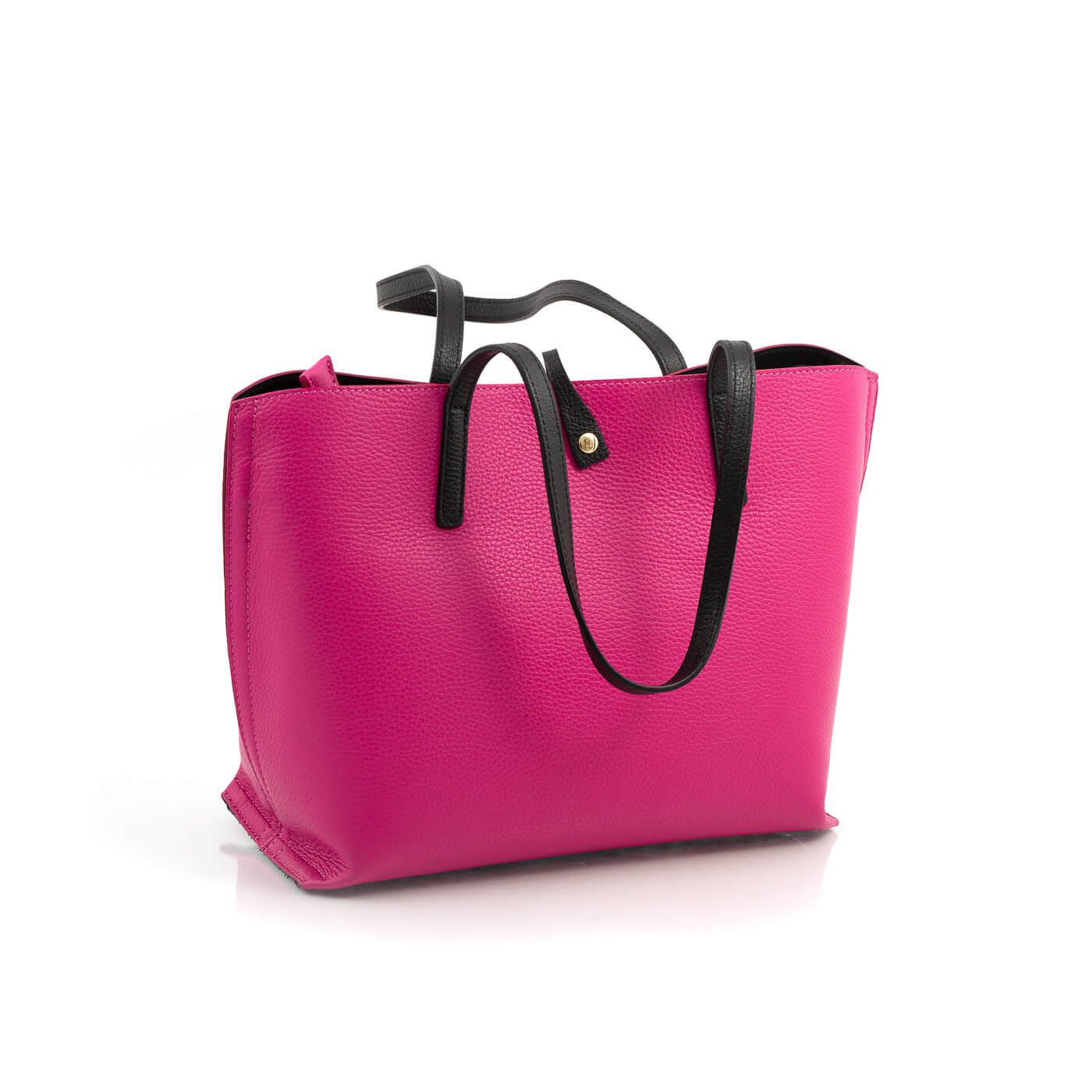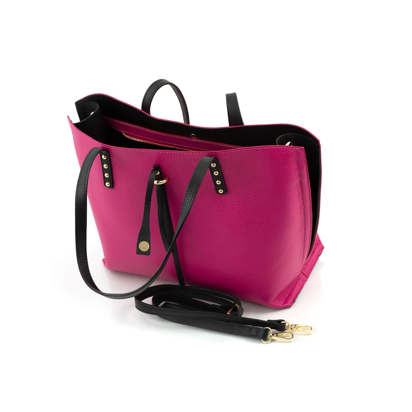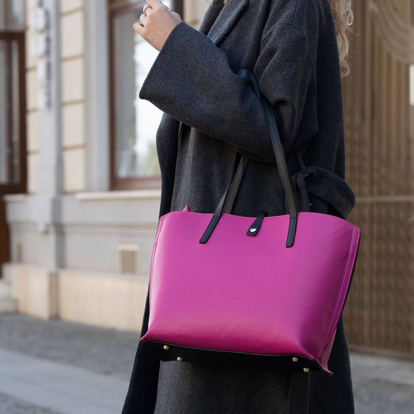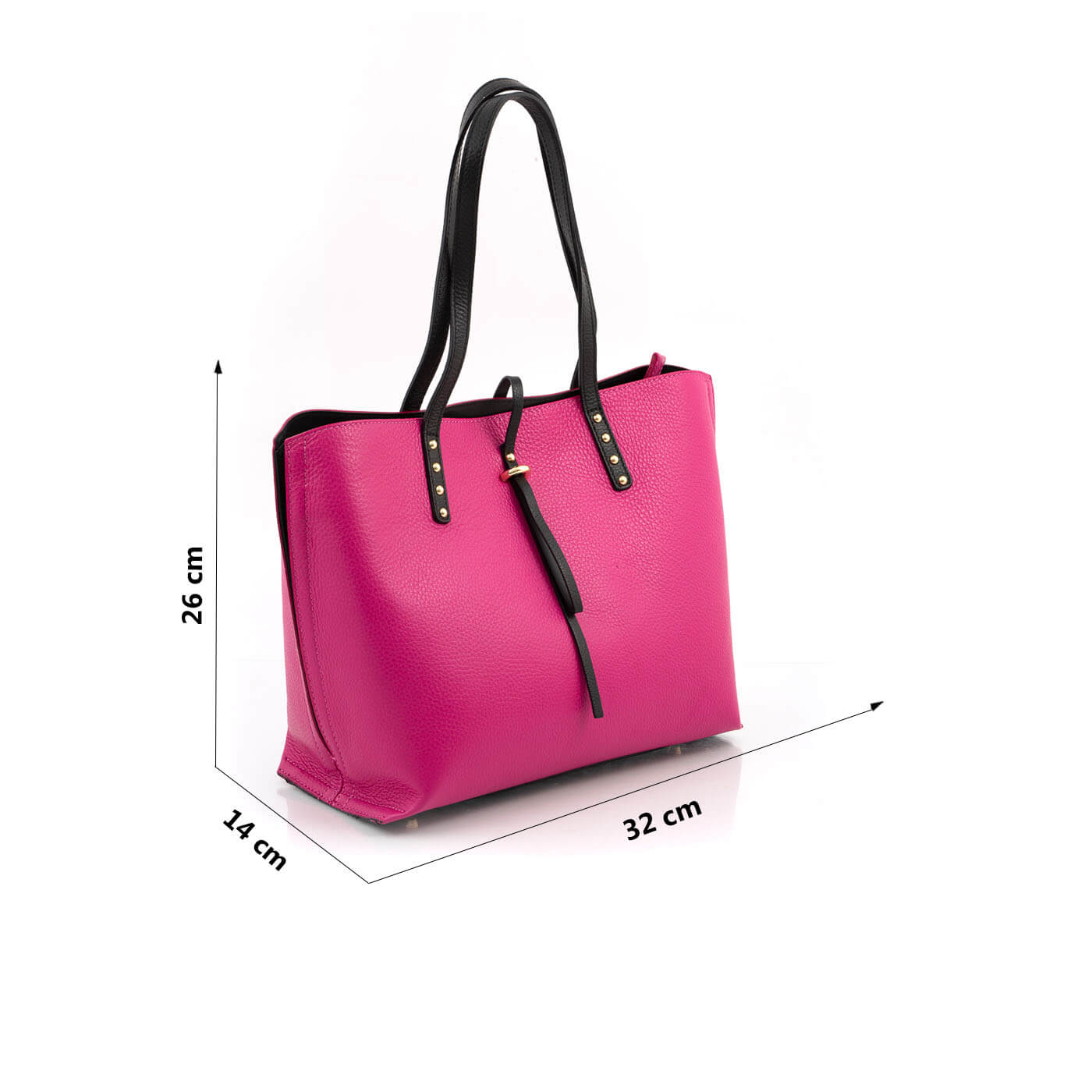 Geanta este prevazuta cu doua manere din piele pentru a fi purtata in mana si o curea detasabila de piele ce permite purtarea pe umar.