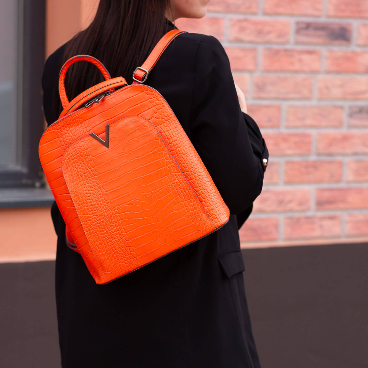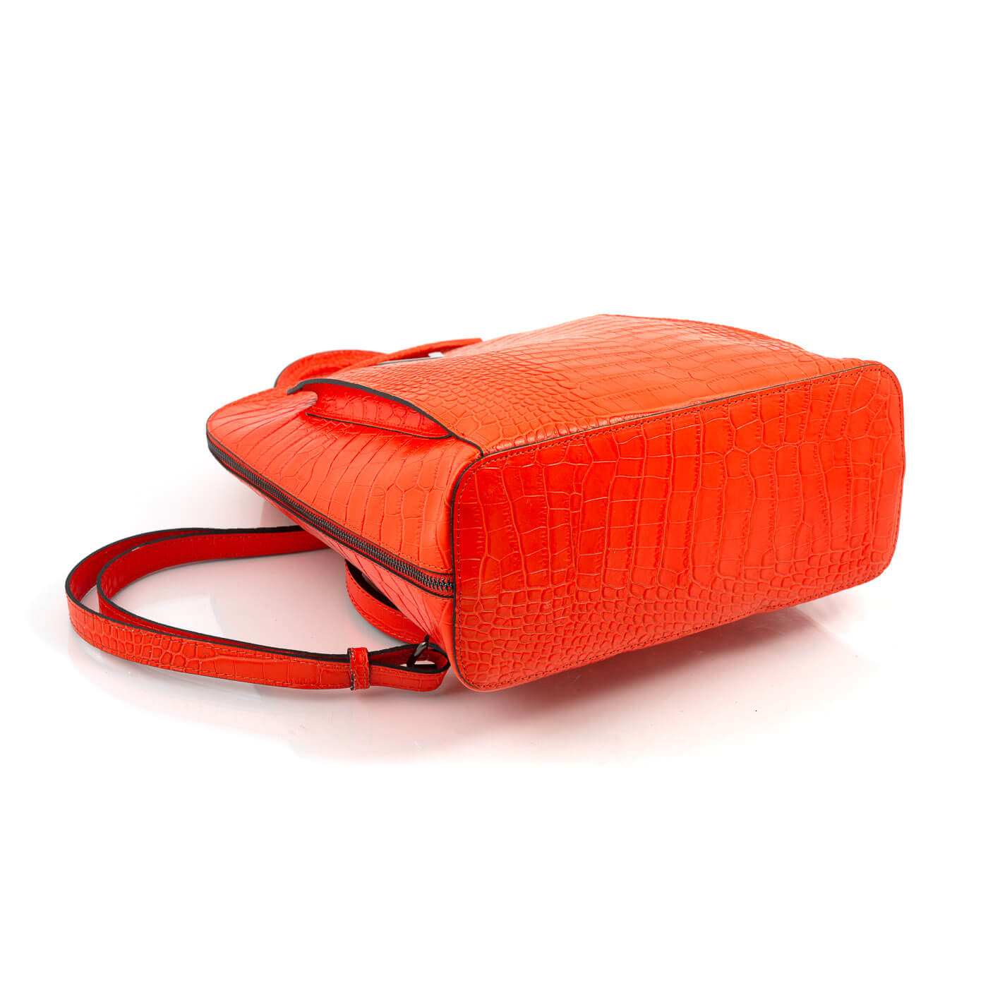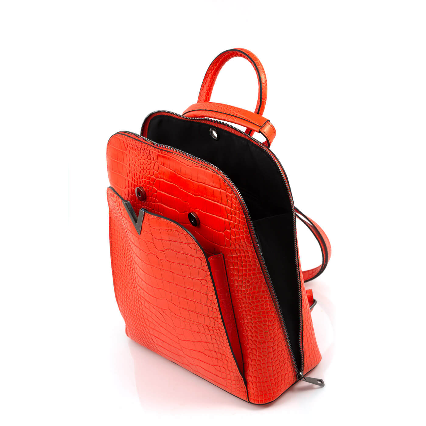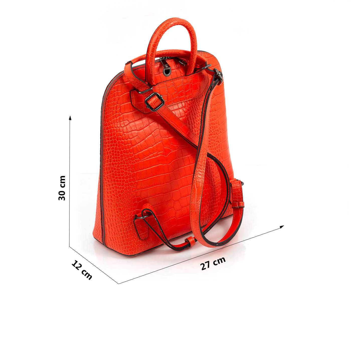 Rucsacul este prevazut cu un maner din piele pentru a fi purtat in mana sau pe brat si doua barete de umar reglabile.