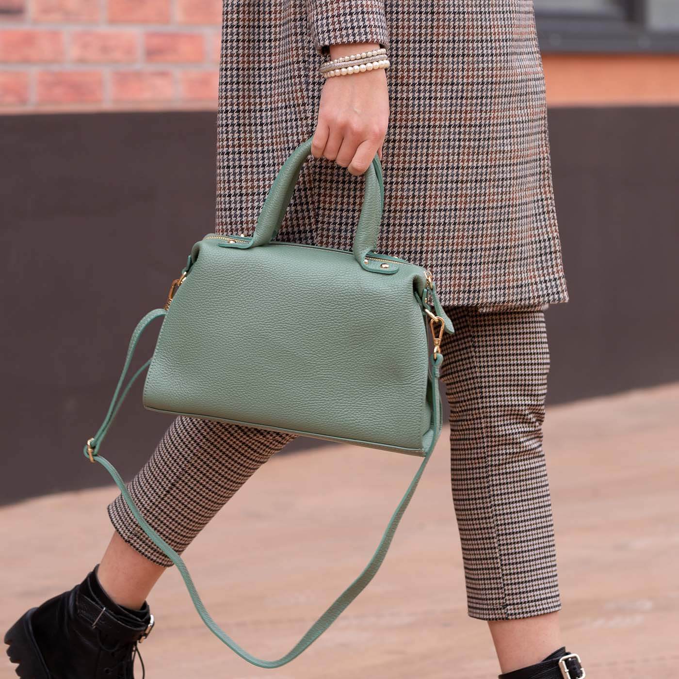 Geanta este prevazuta cu o curelusa din piele, pentru a fi purtata in mana si o curea detasabila, ajustabila, ce permite purtarea si pe umar.