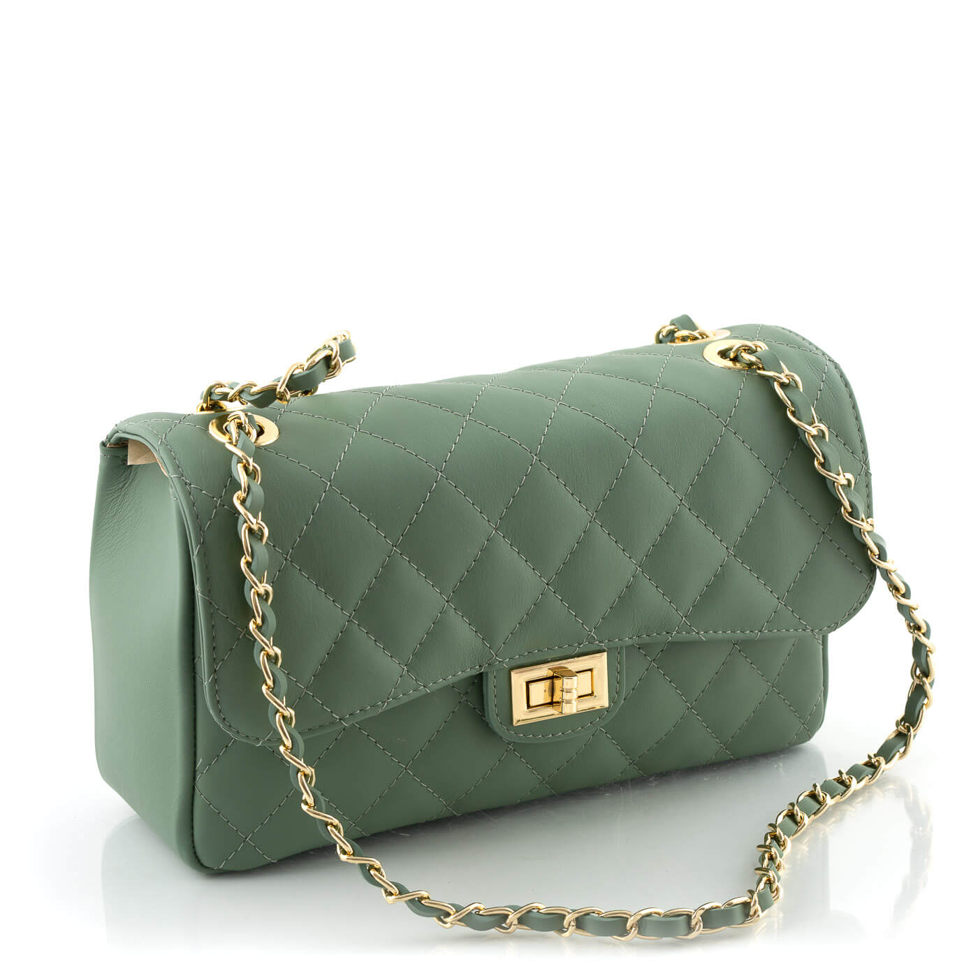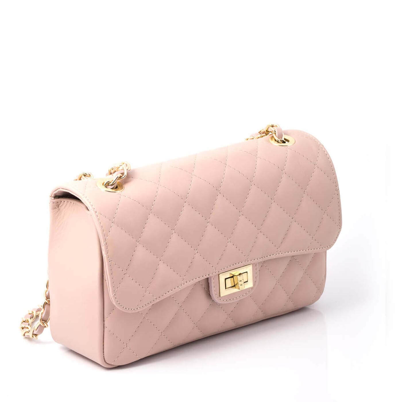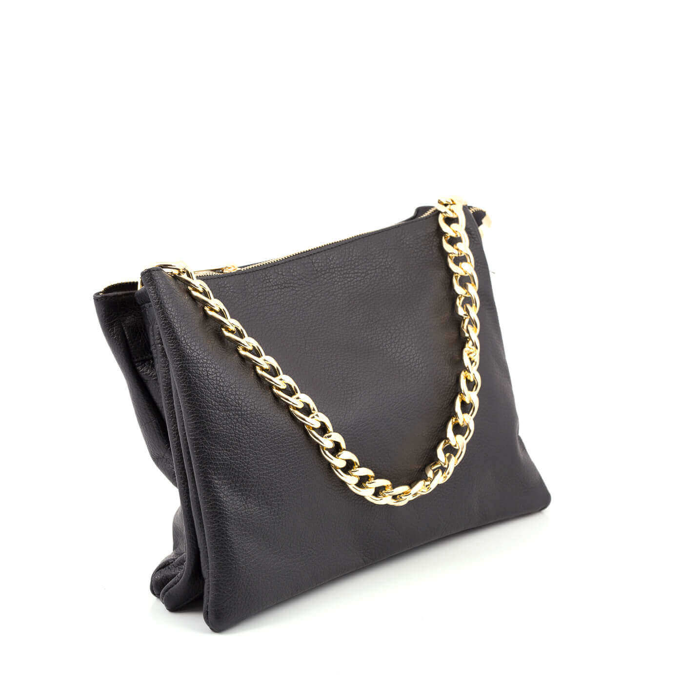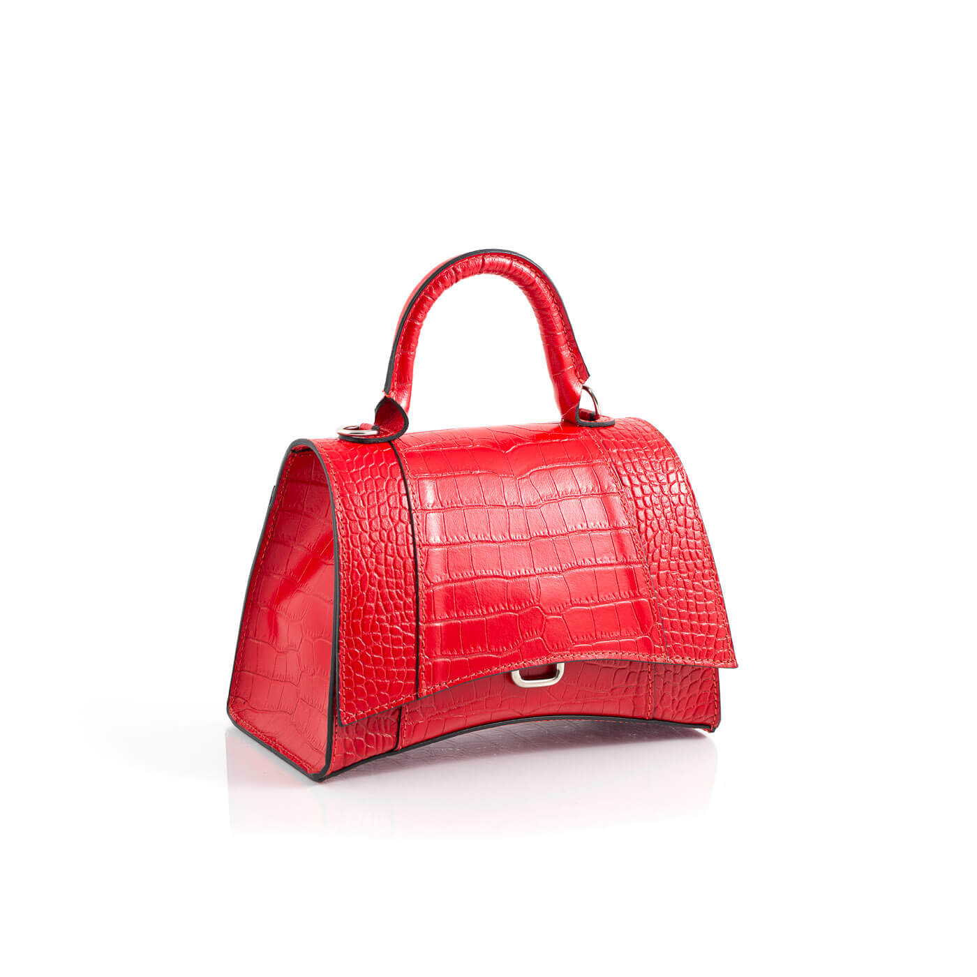 Geanta este prevazuta cu o curelusa metalica pentru a fi purtata in mana si o curea detasabila din piele ce permite purtarea pe umar.