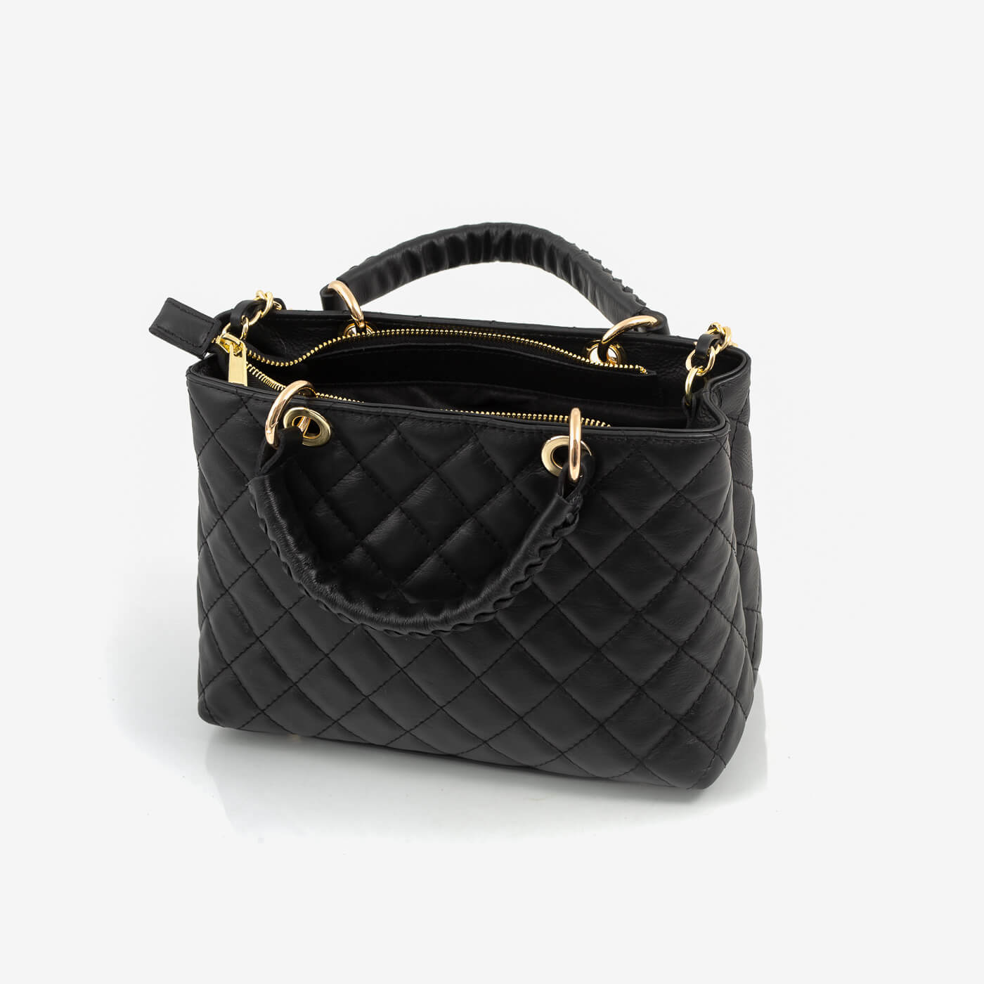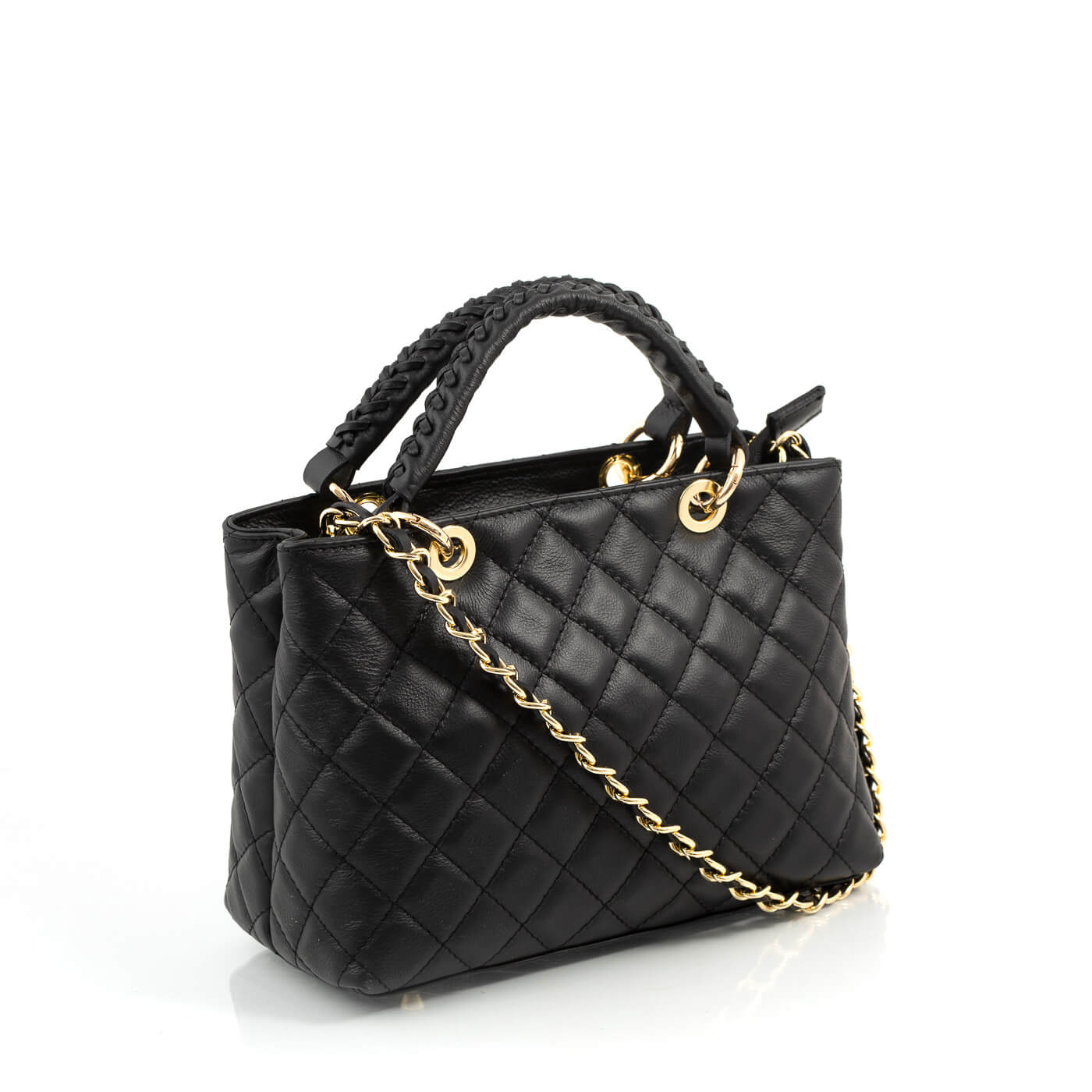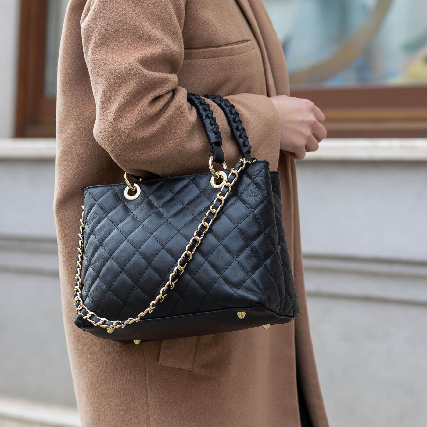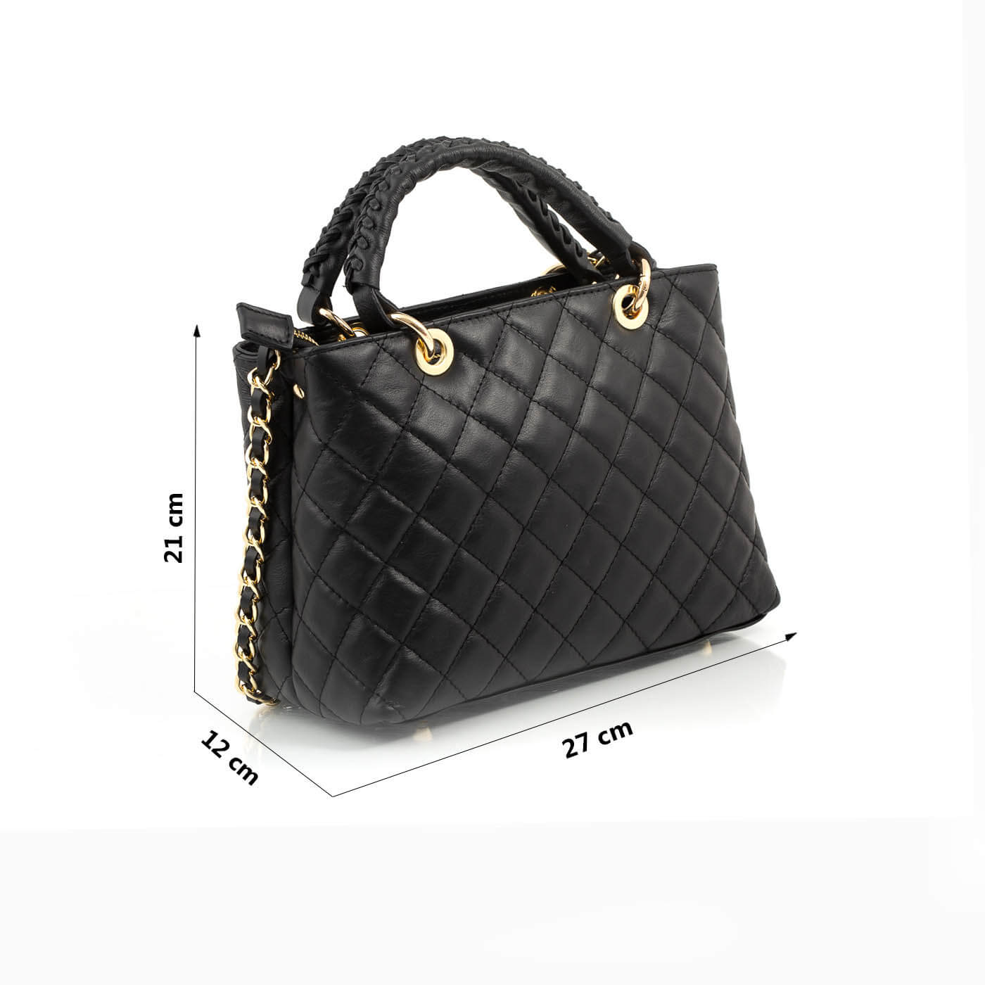 Geanta este prevazuta cu doua manere ce permite purtarea in mana si o bareta de umar metalica