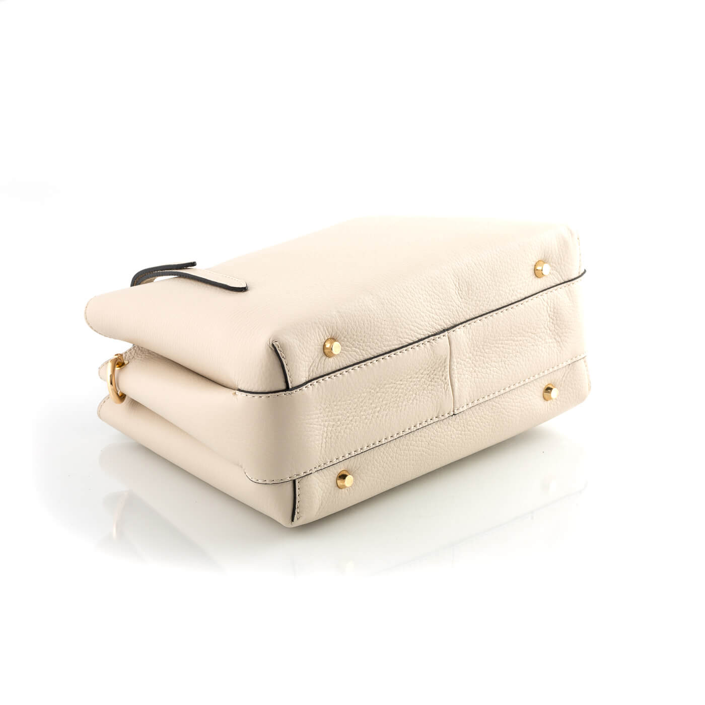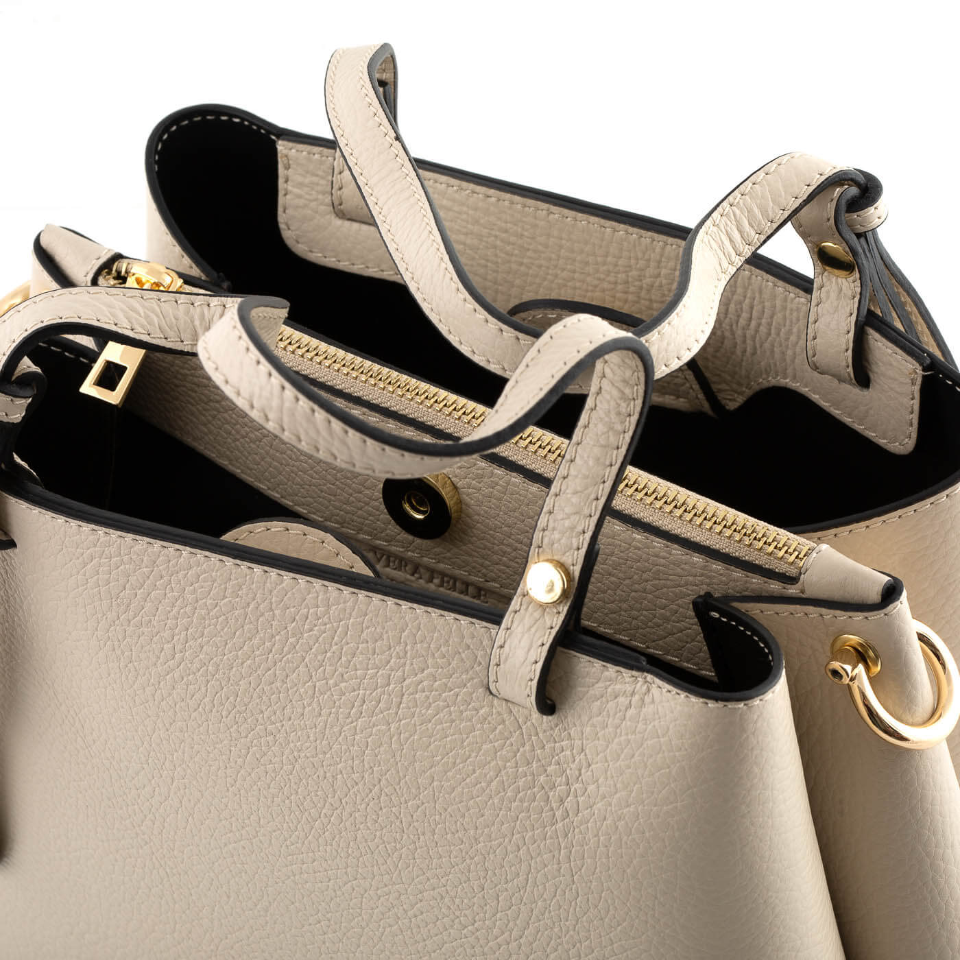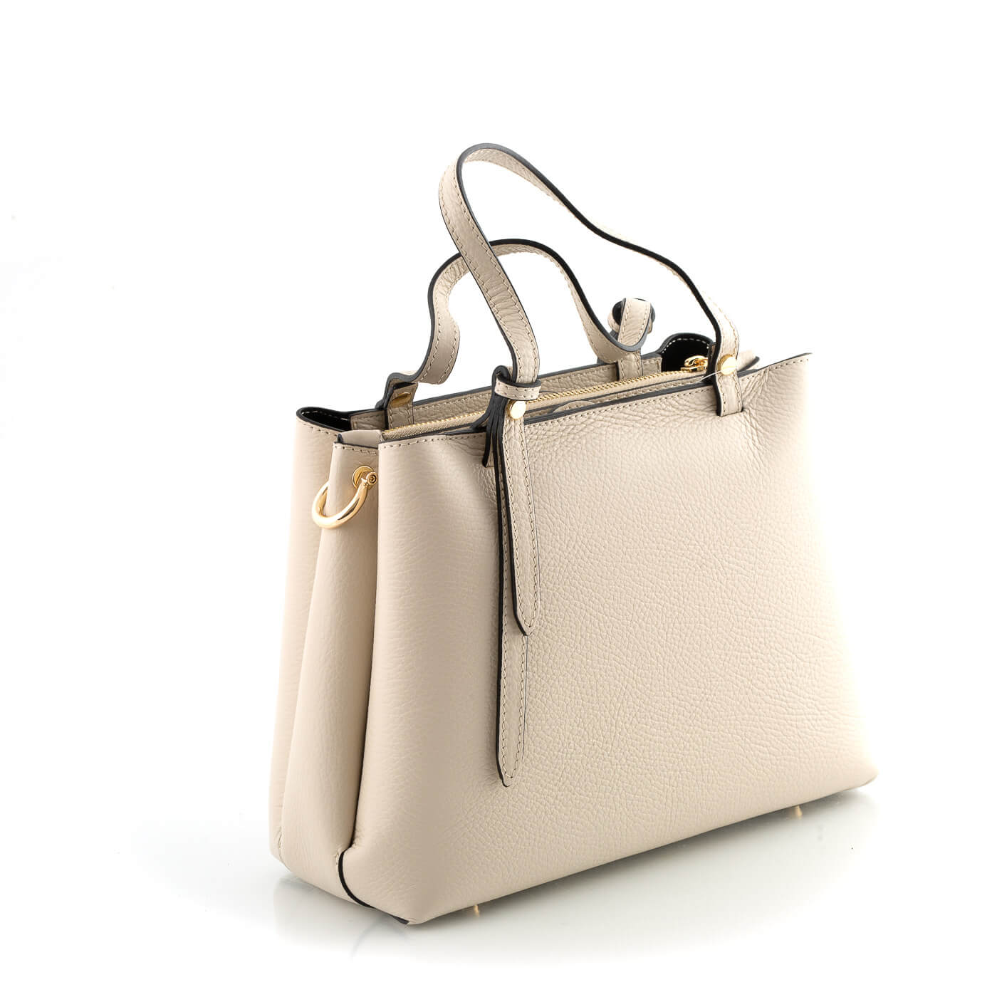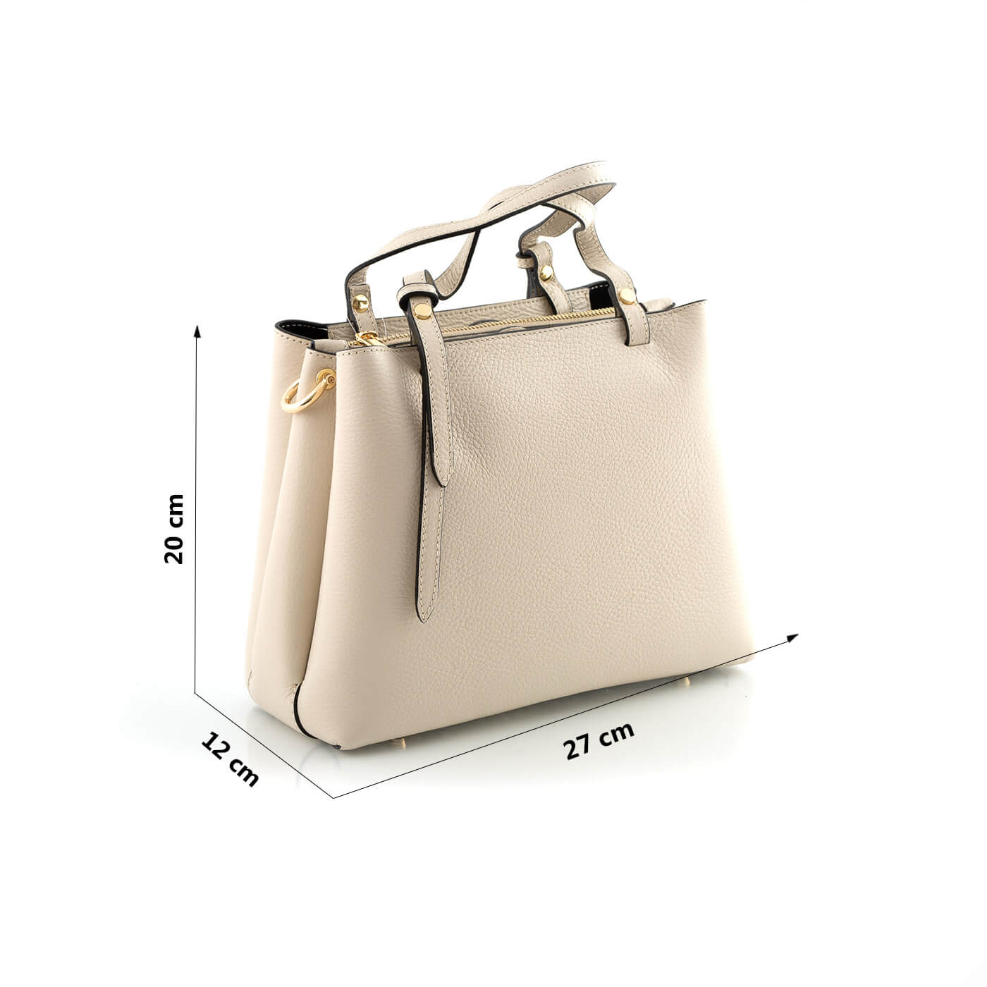 Geanta este prevazuta cu doua manere din piele pentru a fi purtata in mana si o curea detasabila de piele ce permite purtarea pe umar.