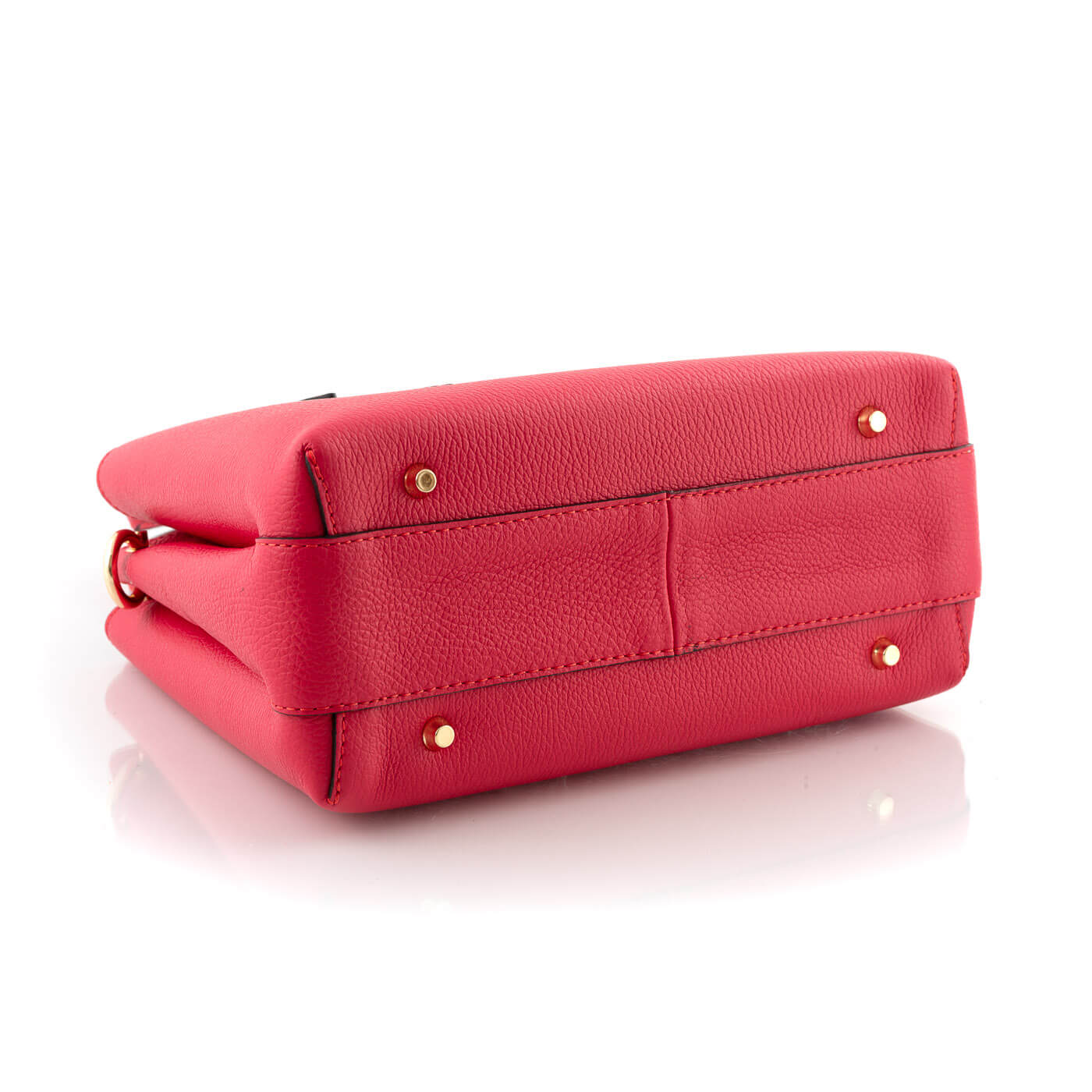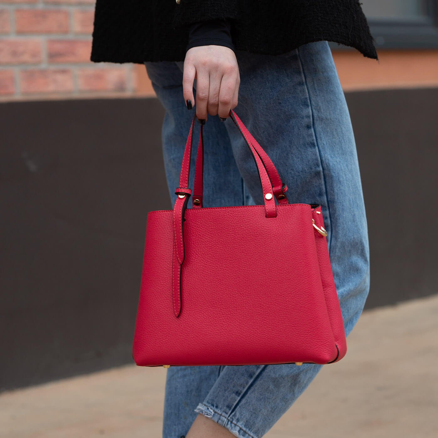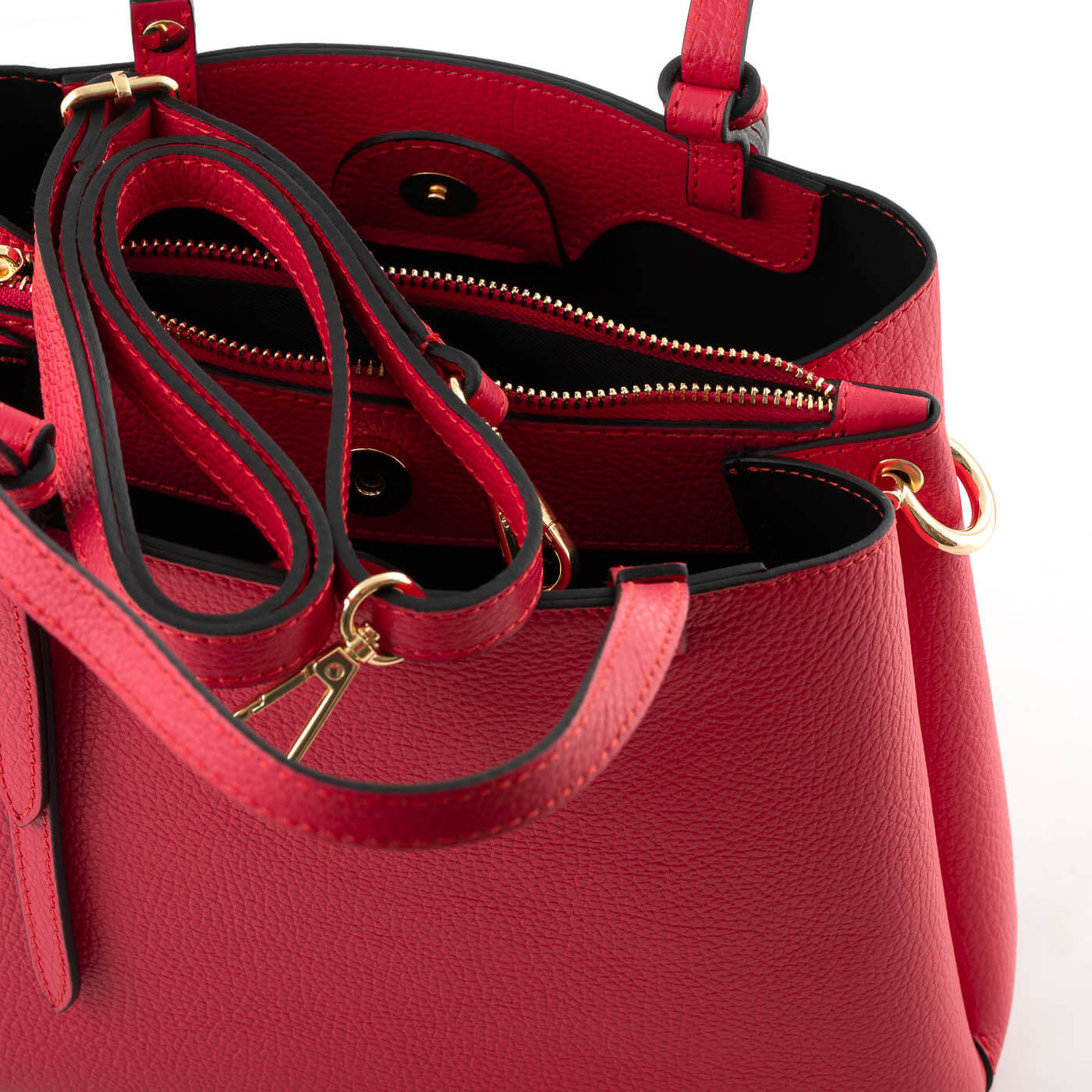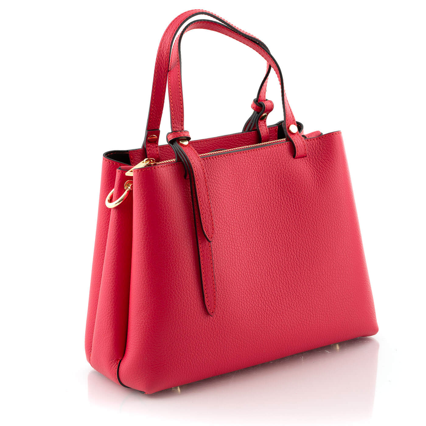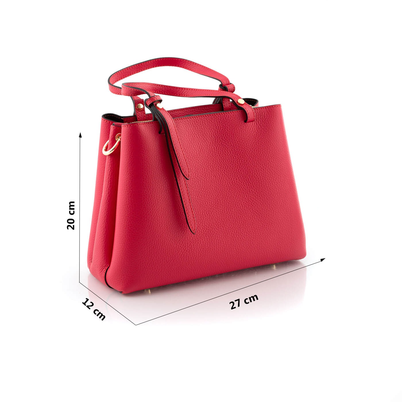 Geanta este prevazuta cu doua manere din piele pentru a fi purtata in mana si o curea detasabila de piele ce permite purtarea pe umar.