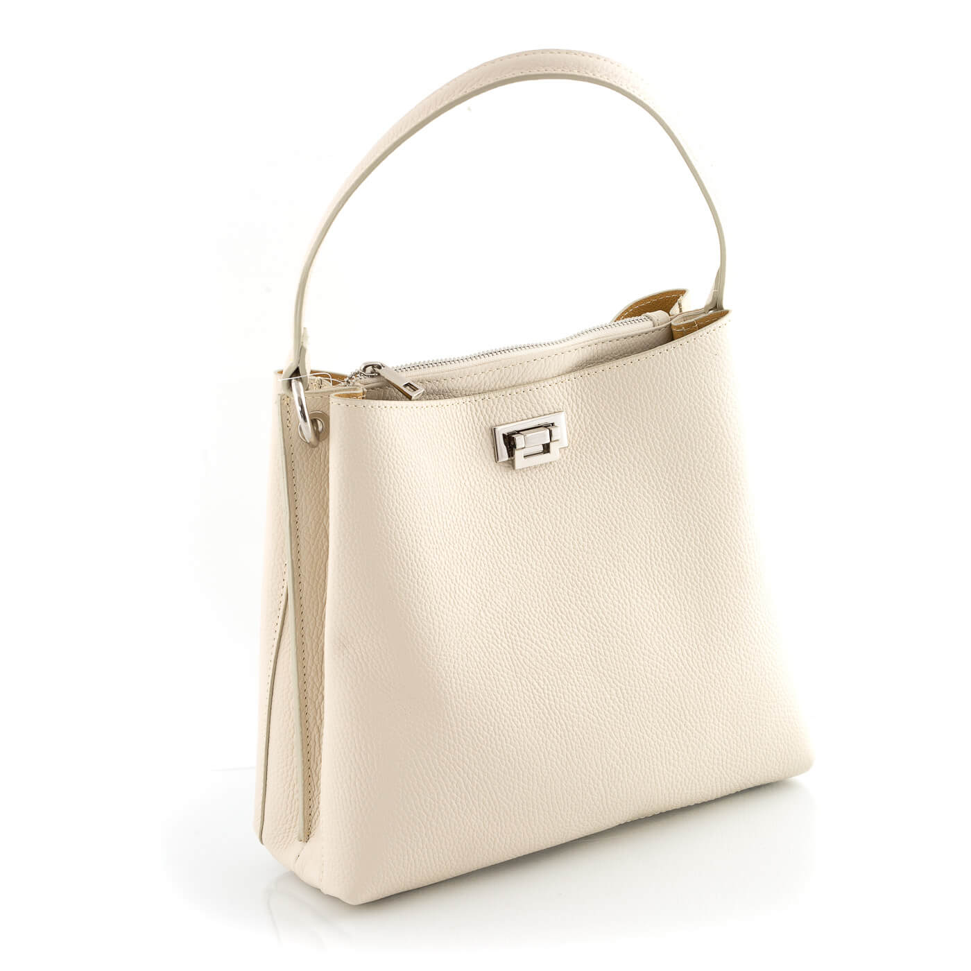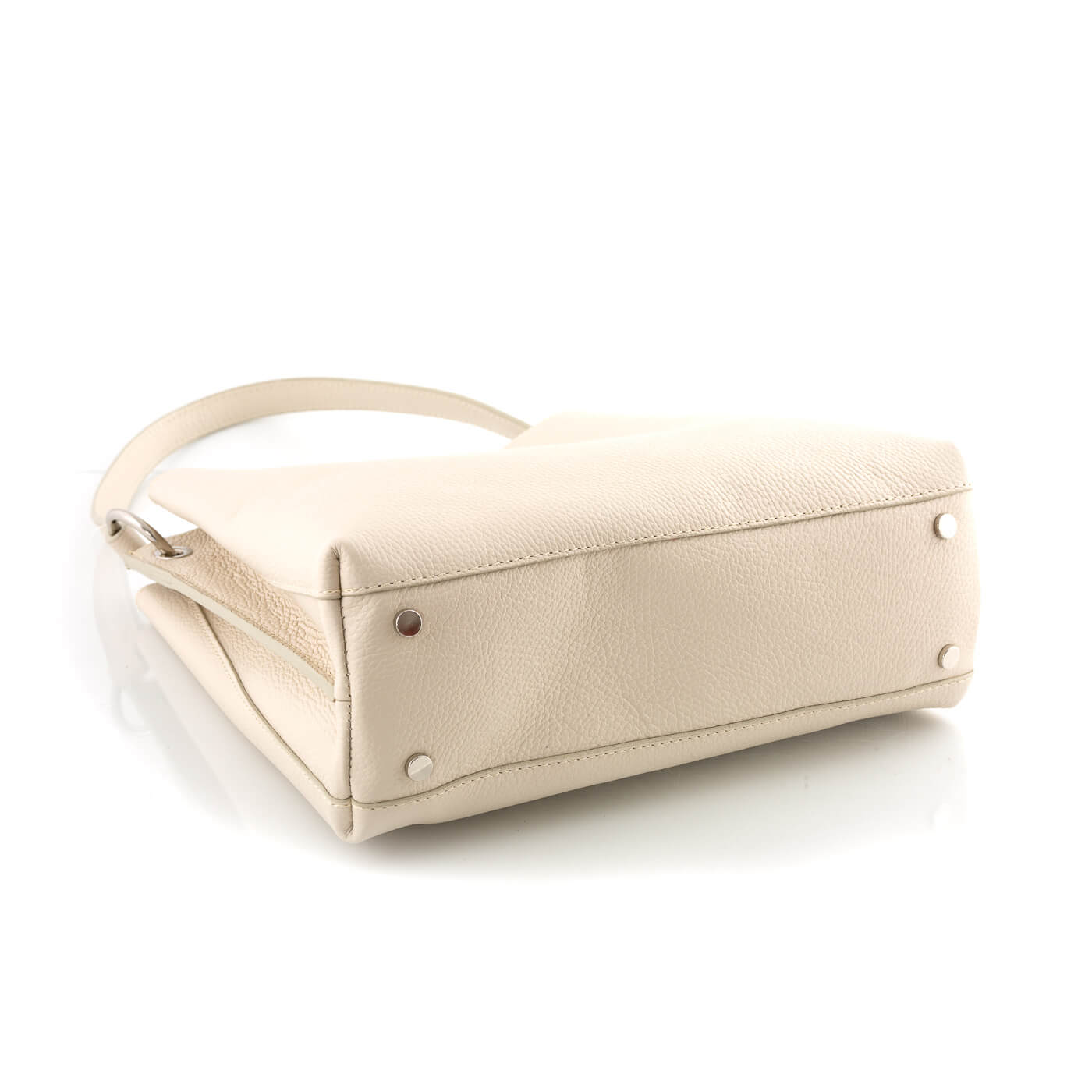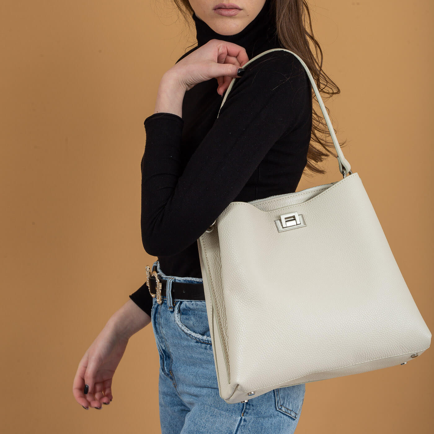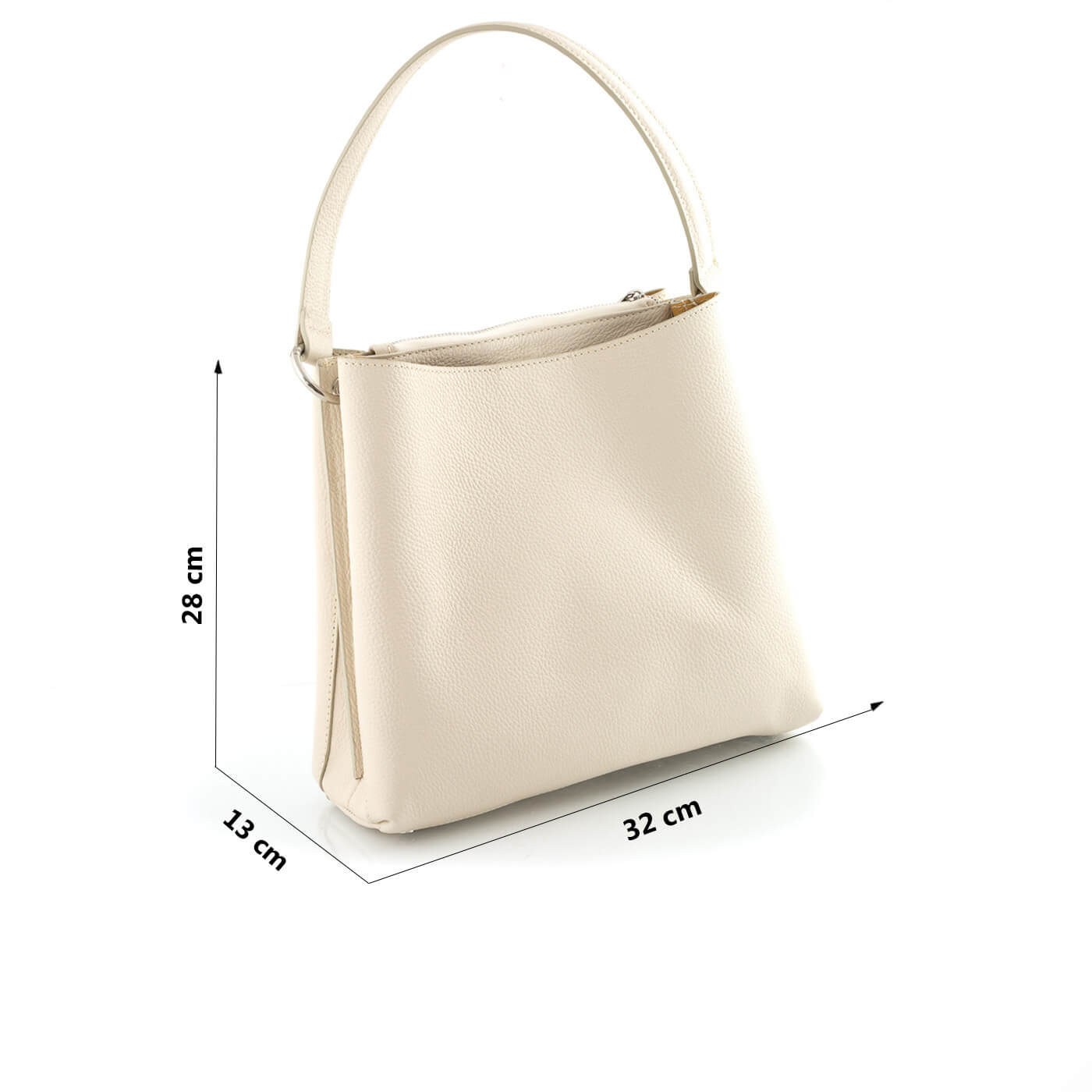 Geanta este prevazuta cu doua manere din piele pentru a fi purtata in mana si o curea detasabila de piele ce permite purtarea pe umar.