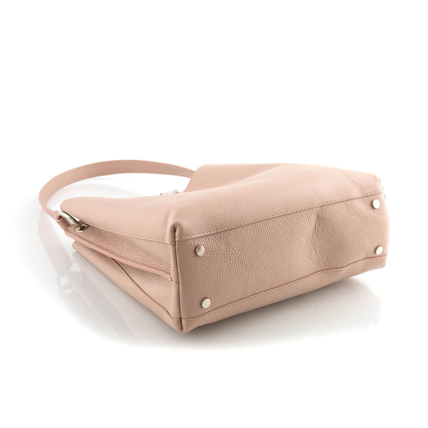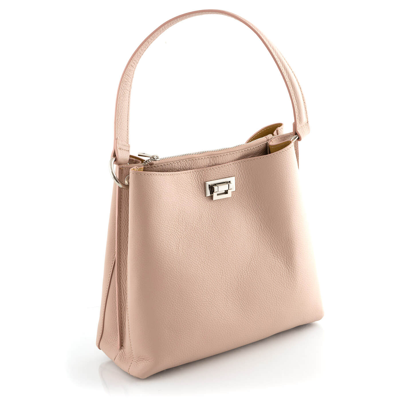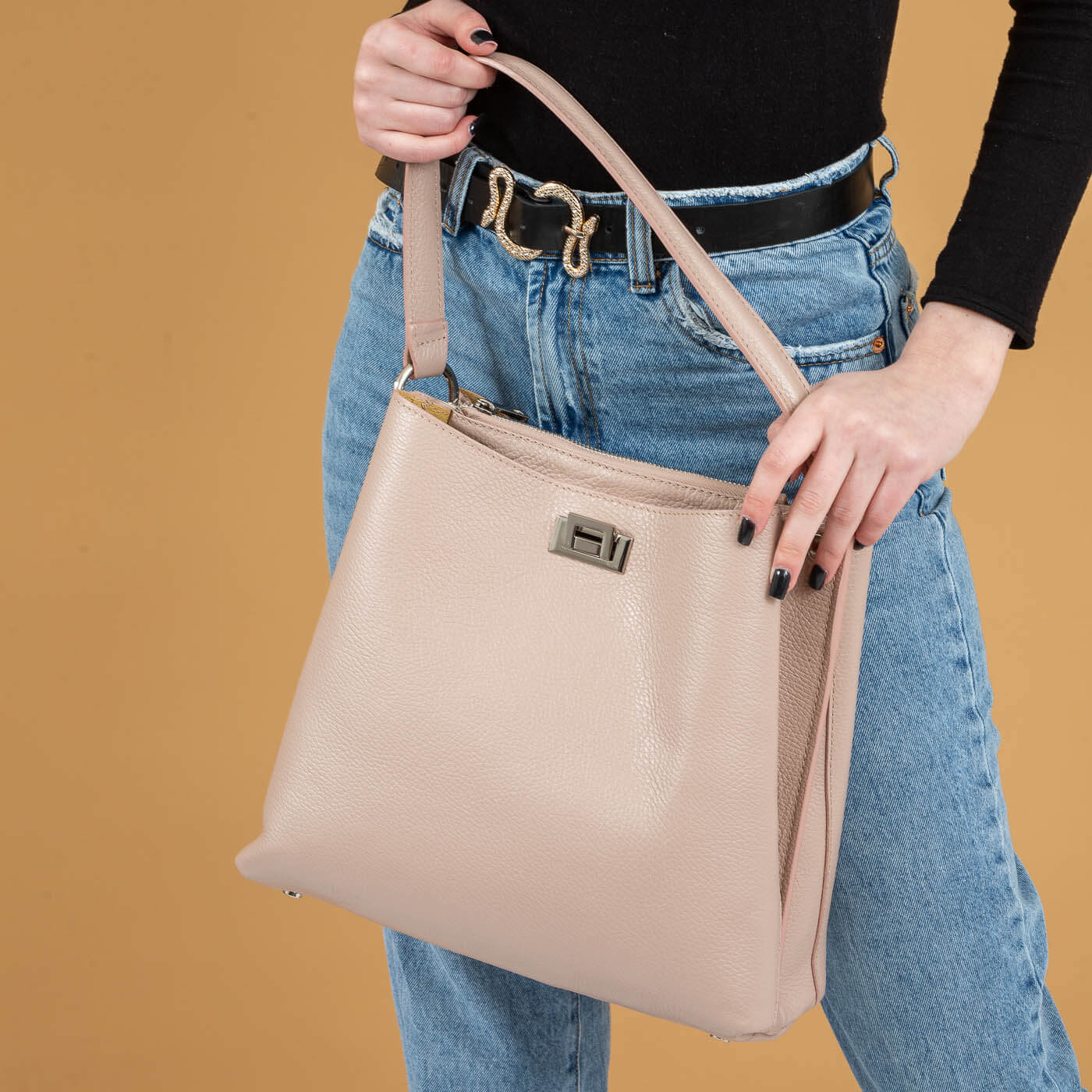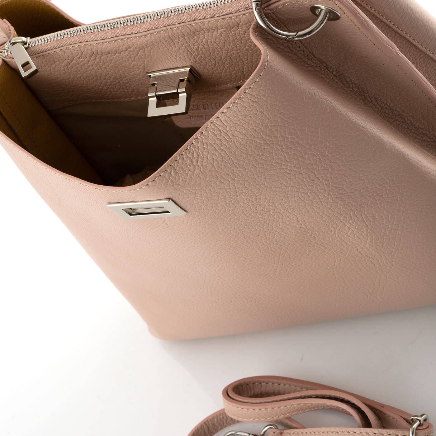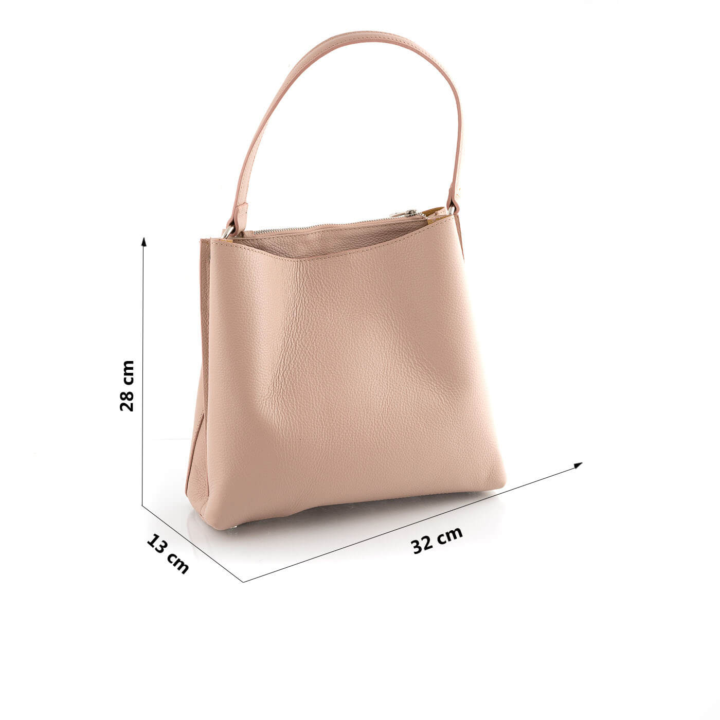Geanta este prevazuta cu doua manere din piele pentru a fi purtata in mana si o curea detasabila de piele ce permite purtarea pe umar.