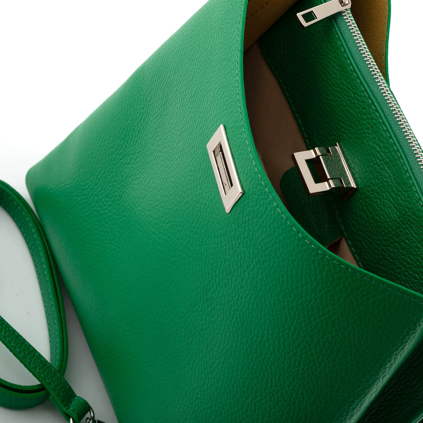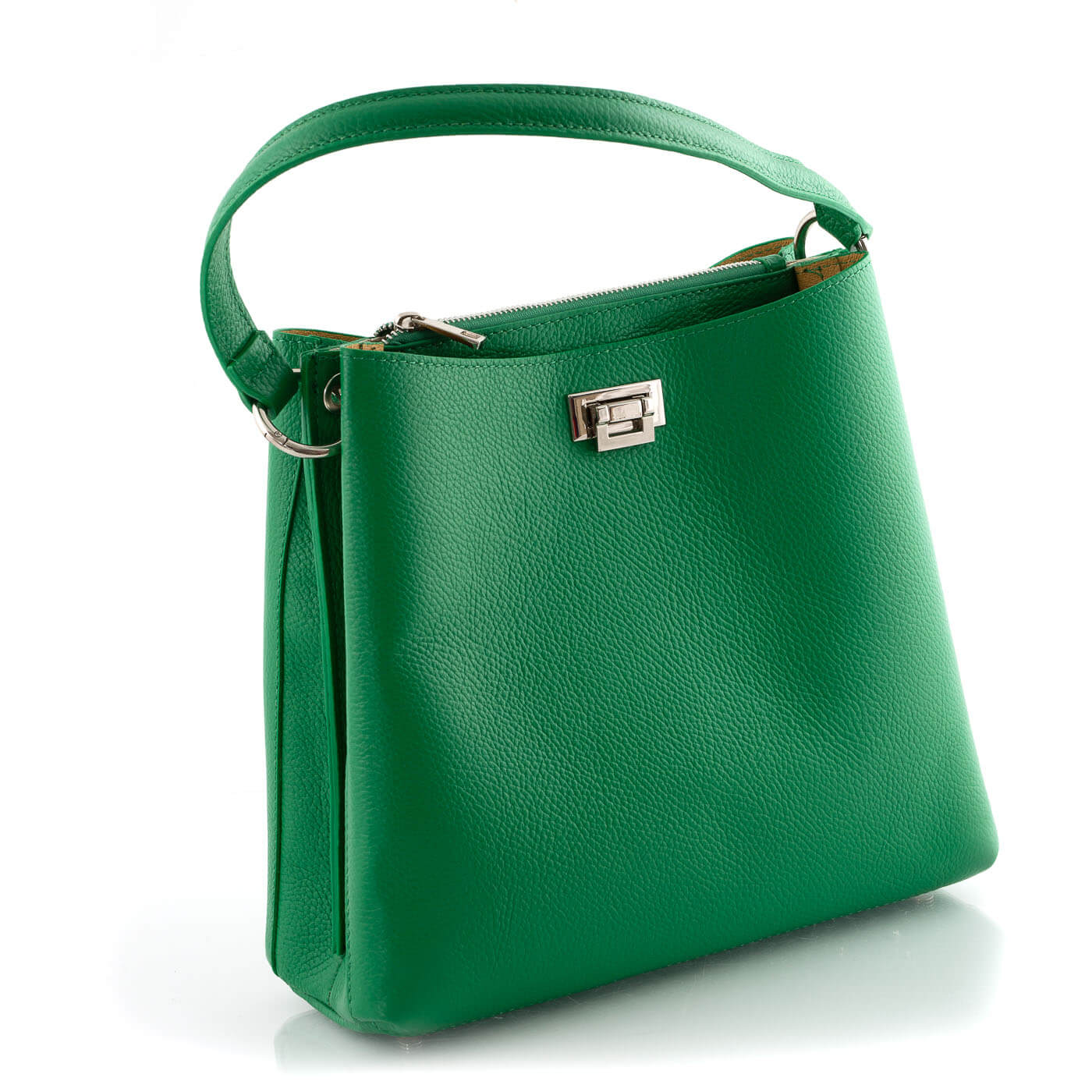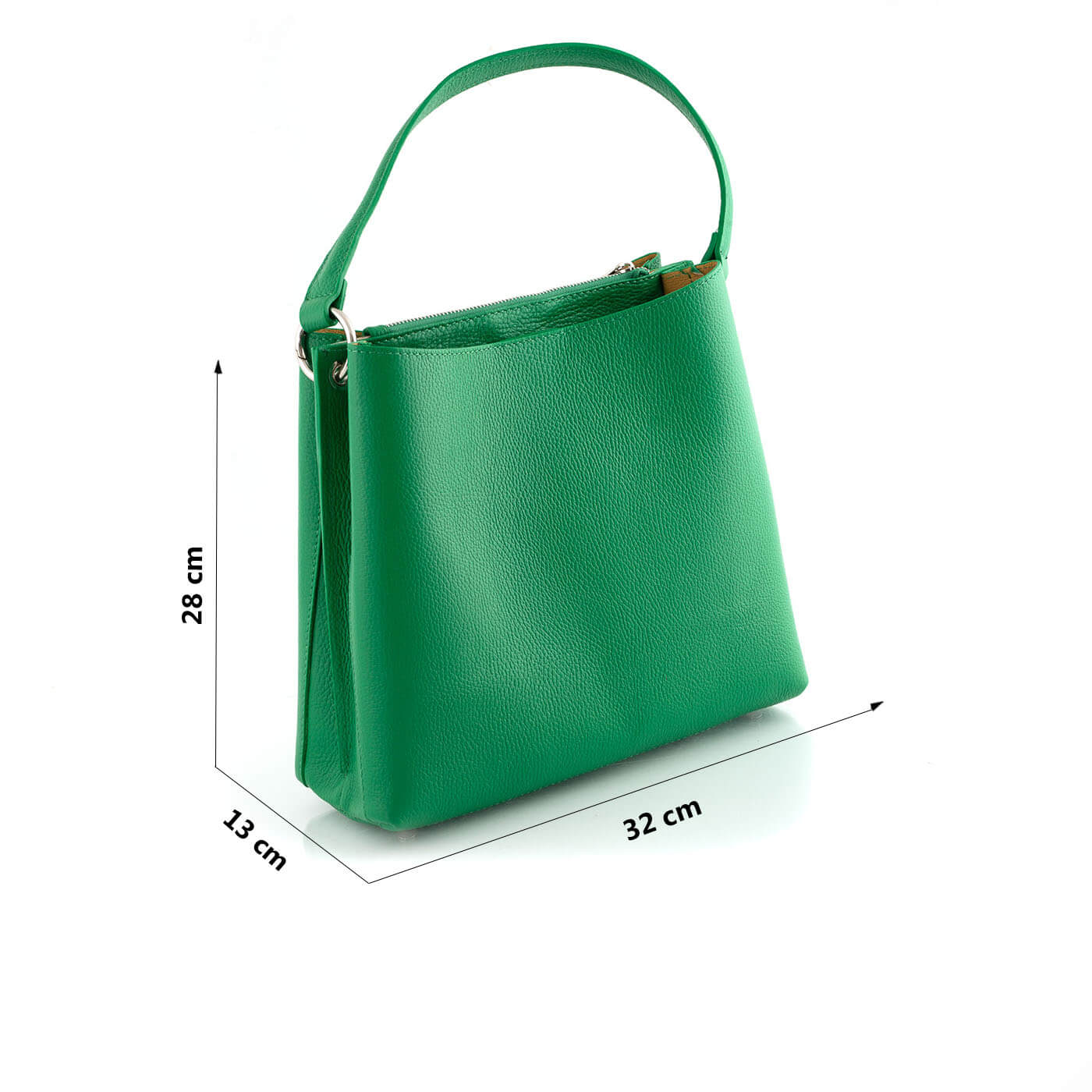 Geanta este prevazuta cu doua manere din piele pentru a fi purtata in mana si o curea detasabila de piele ce permite purtarea pe umar.