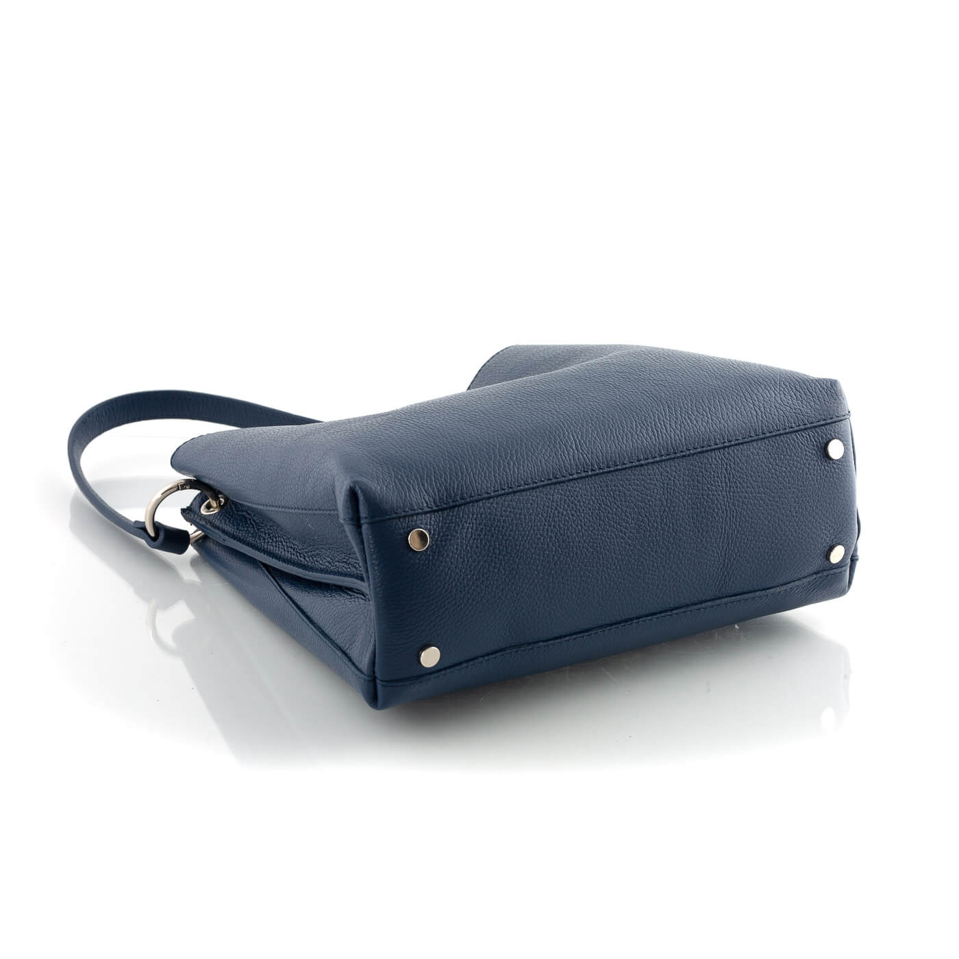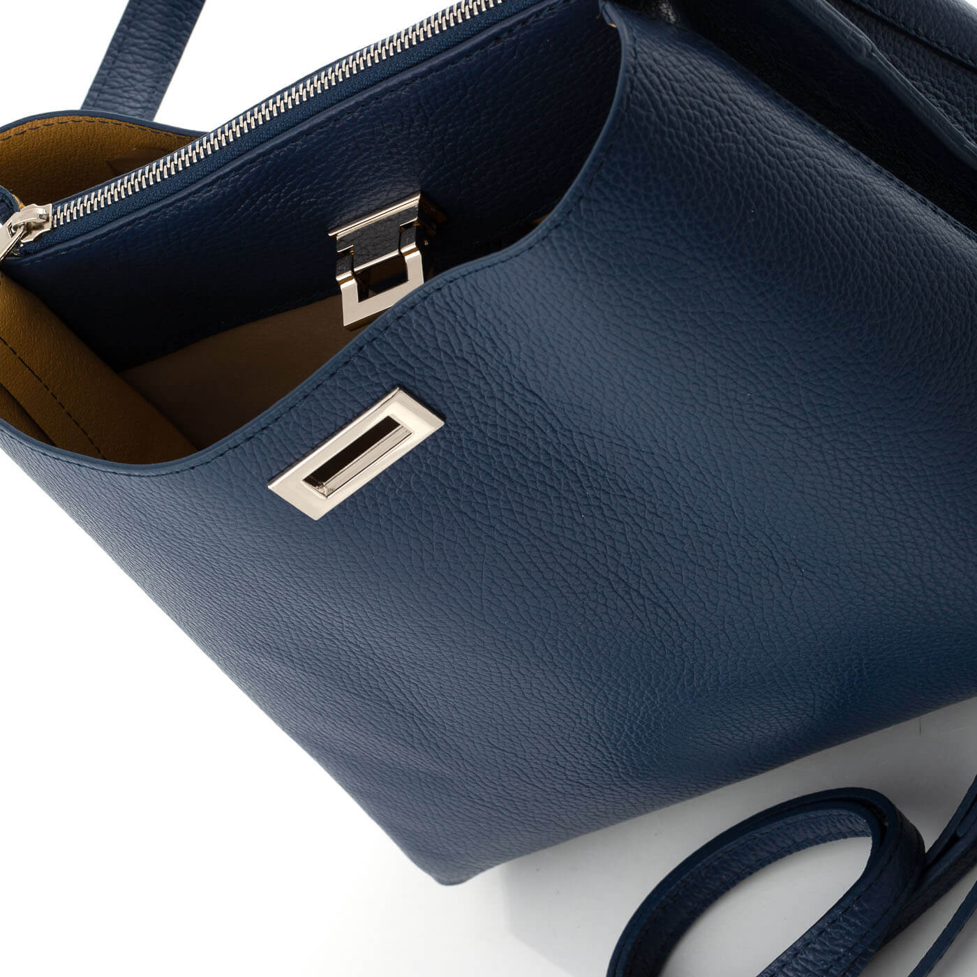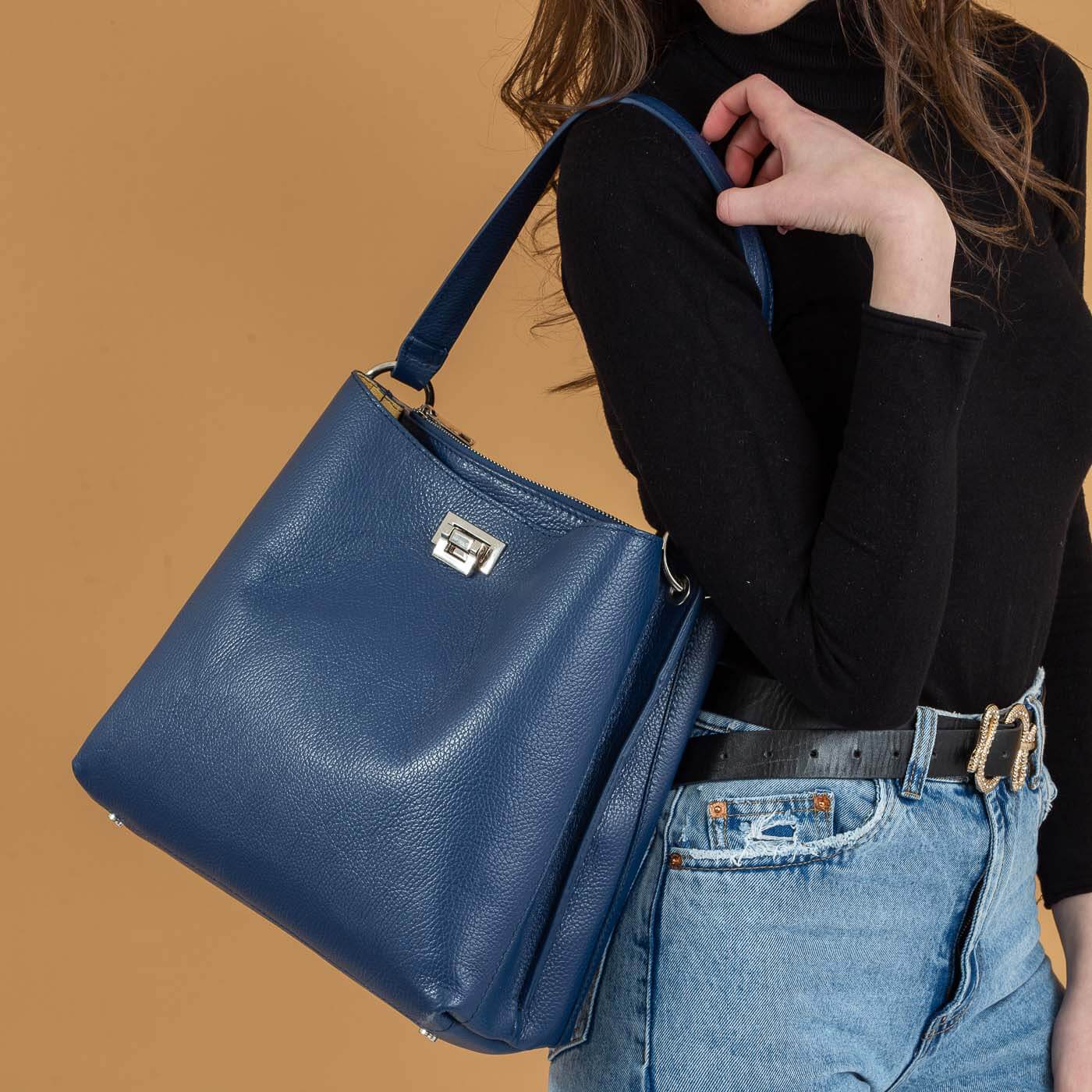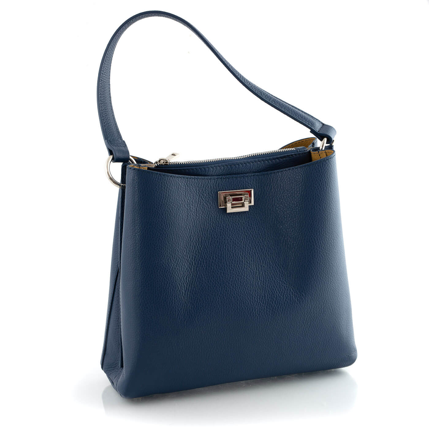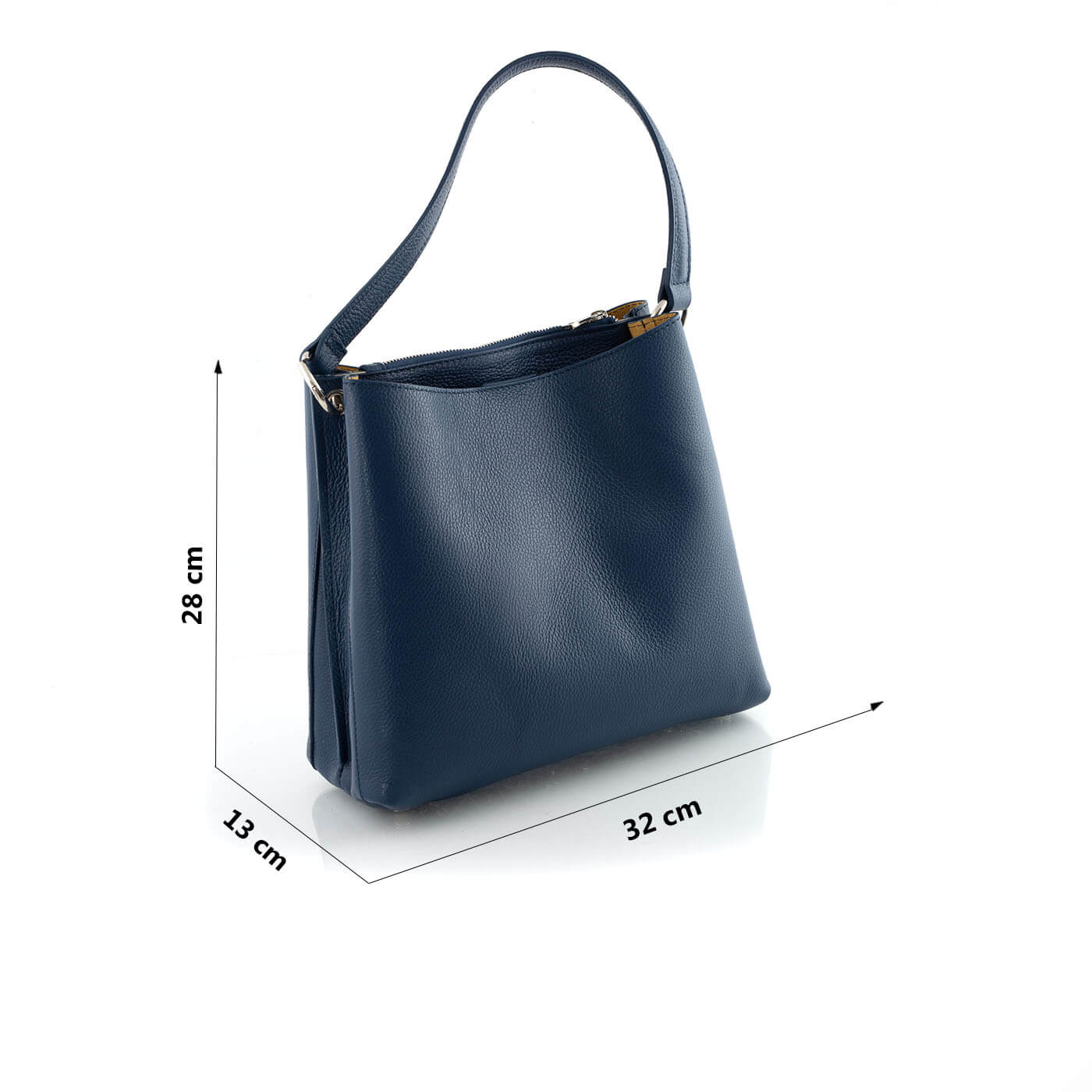 Geanta este prevazuta cu doua manere din piele pentru a fi purtata in mana si o curea detasabila de piele ce permite purtarea pe umar.