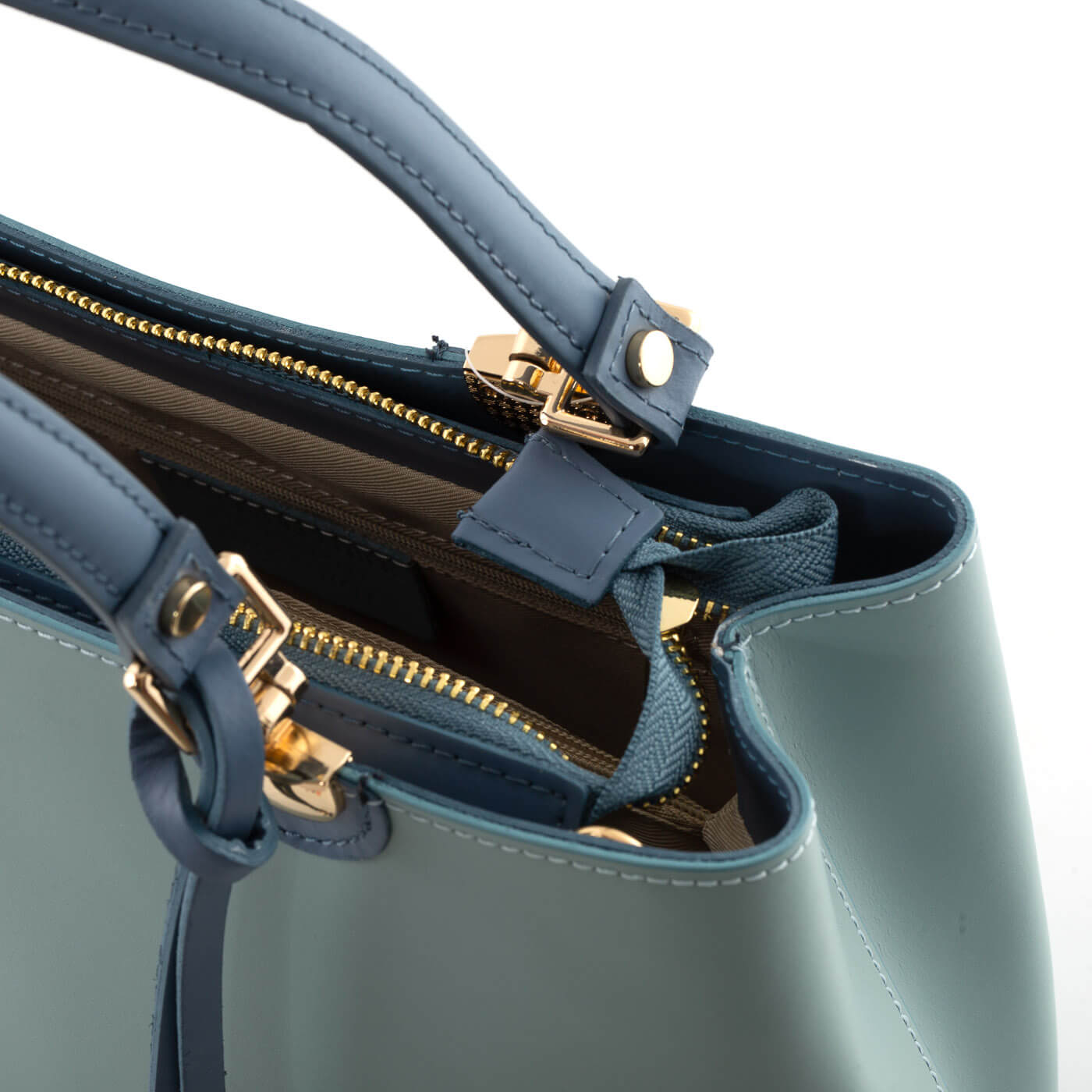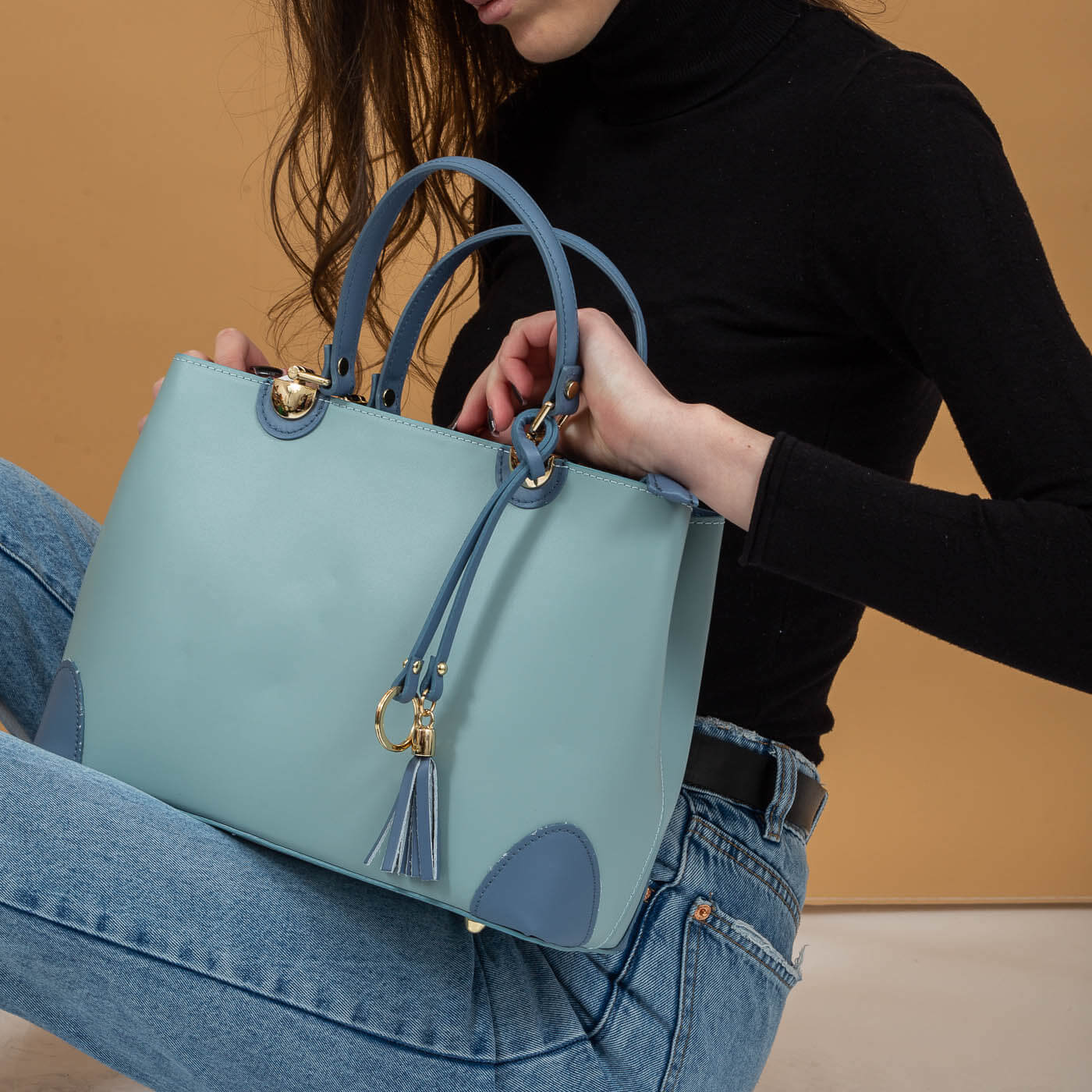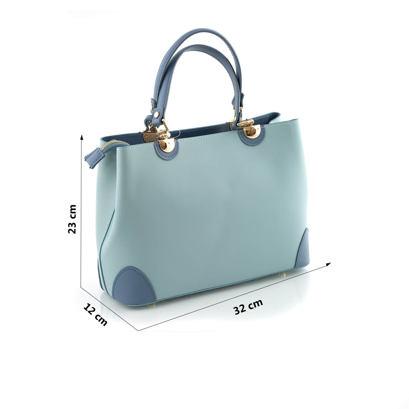 Geanta este prevazuta cu doua cureluse din piele, pentru a fi purtata in mana si o curea detasabila, ajustabila, ce permite purtarea si pe umar.