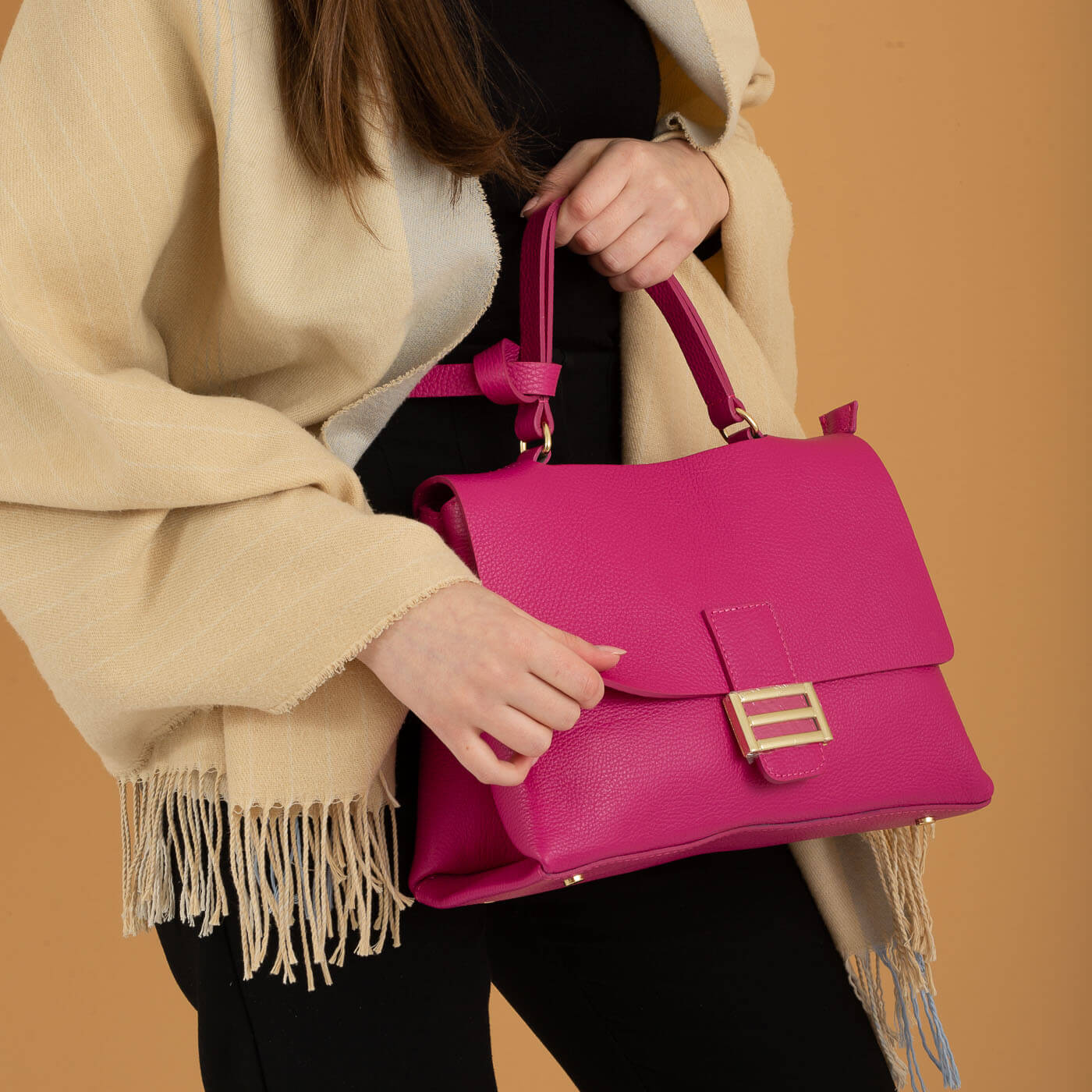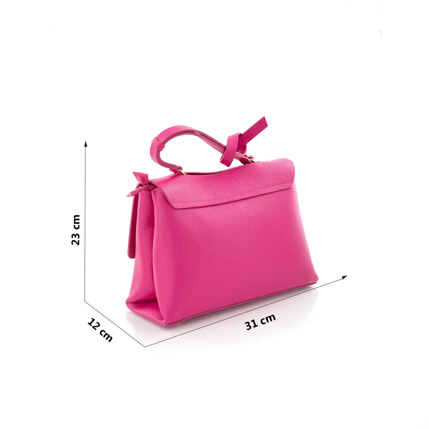 Geanta este prevazuta cu maner ce permite purtarea in mana si o curea lunga din piele, detasabila.