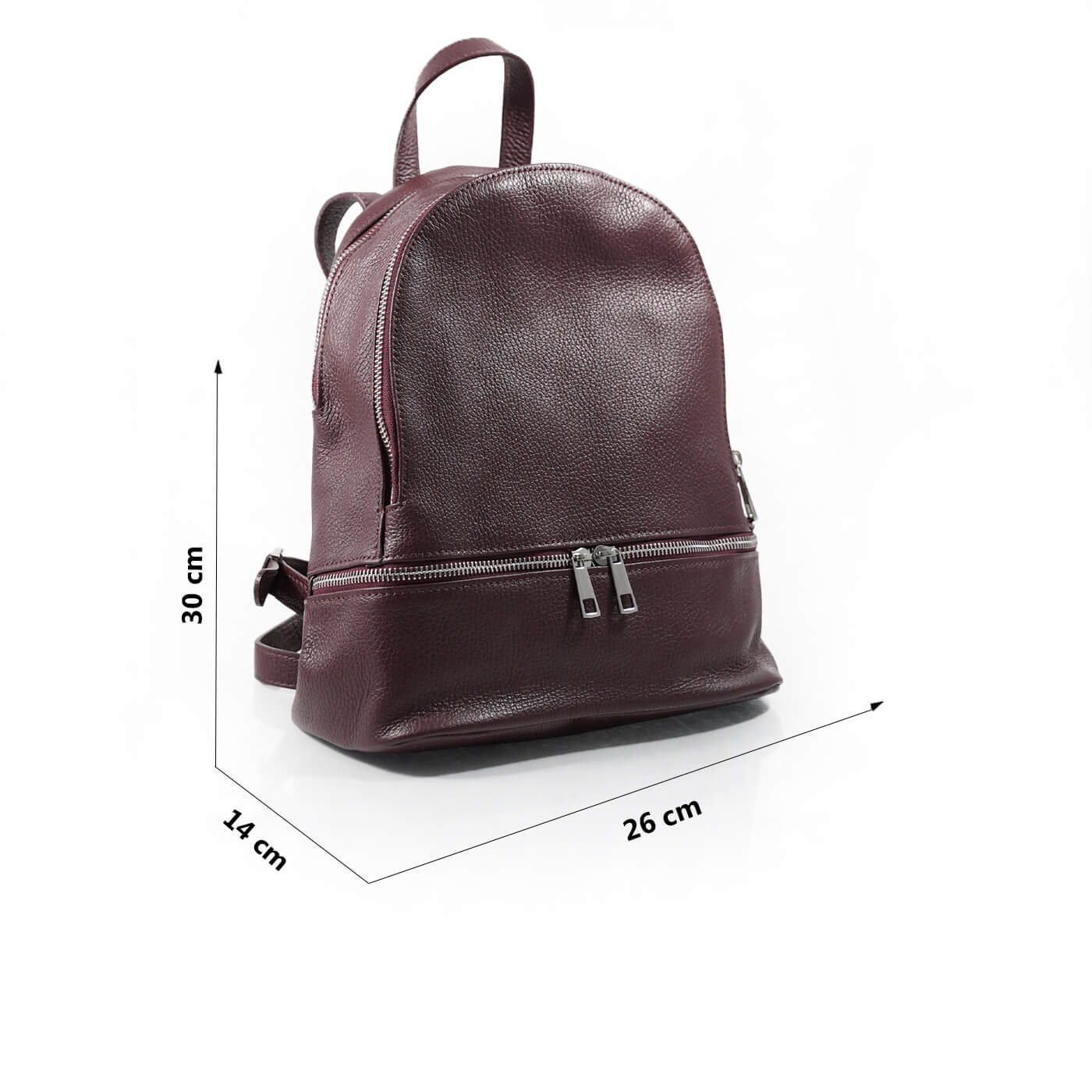 Rucsacul este prevazut cu un maner din piele pentru a fi purtat in mana sau pe brat si doua barete de umar reglabile.