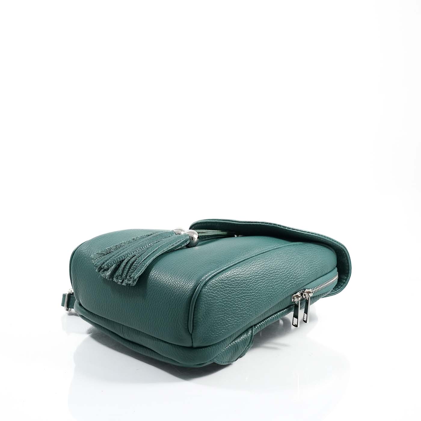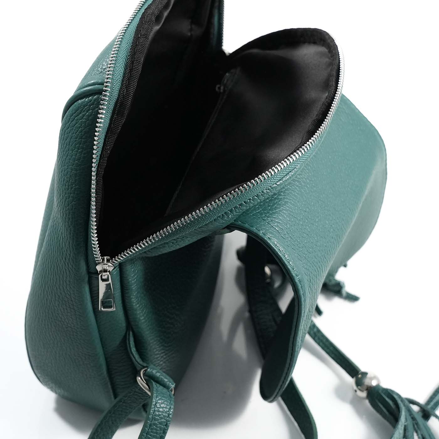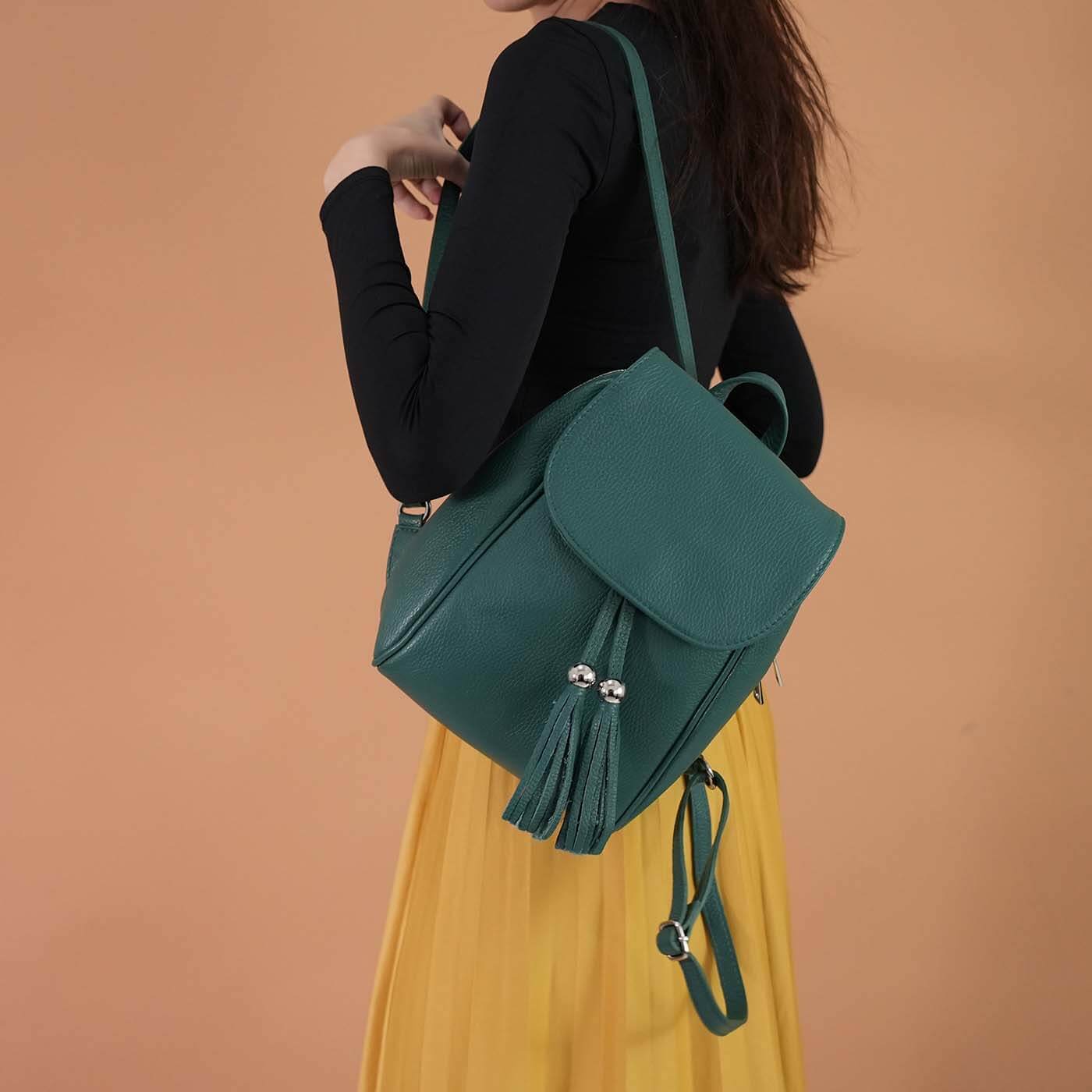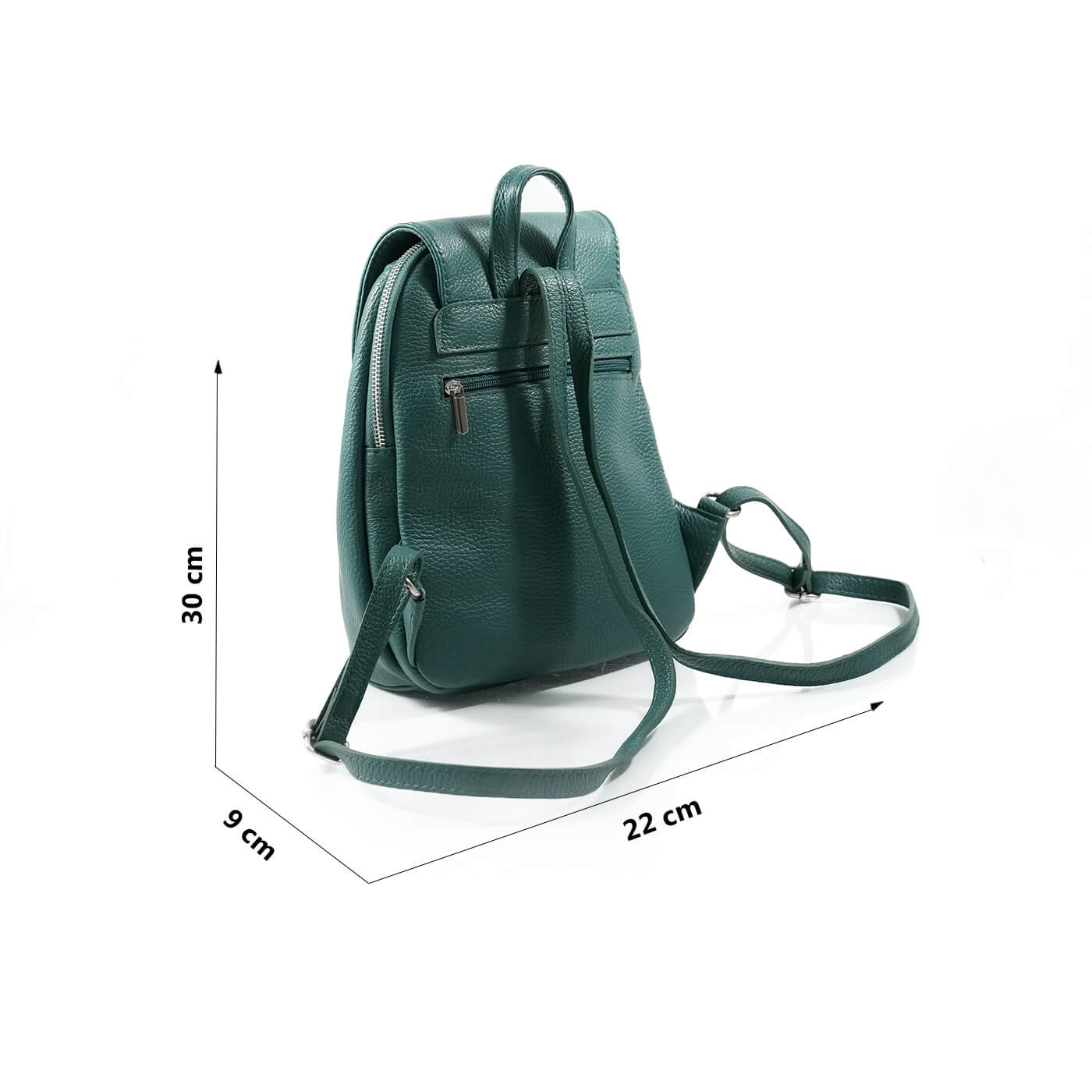 Rucsacul este prevazut cu un maner din piele pentru a fi purtat in mana si doua barete de umar reglabile.