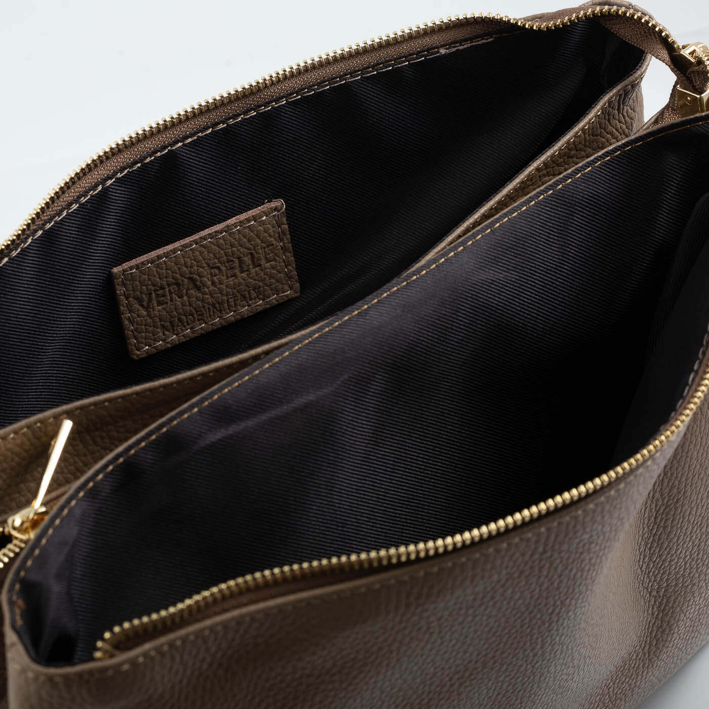 - Compartimente/buzunare: In interior trei compartimente, dintre care cel din mijloc se inchide cu fermoar.