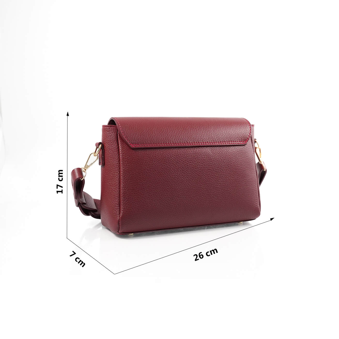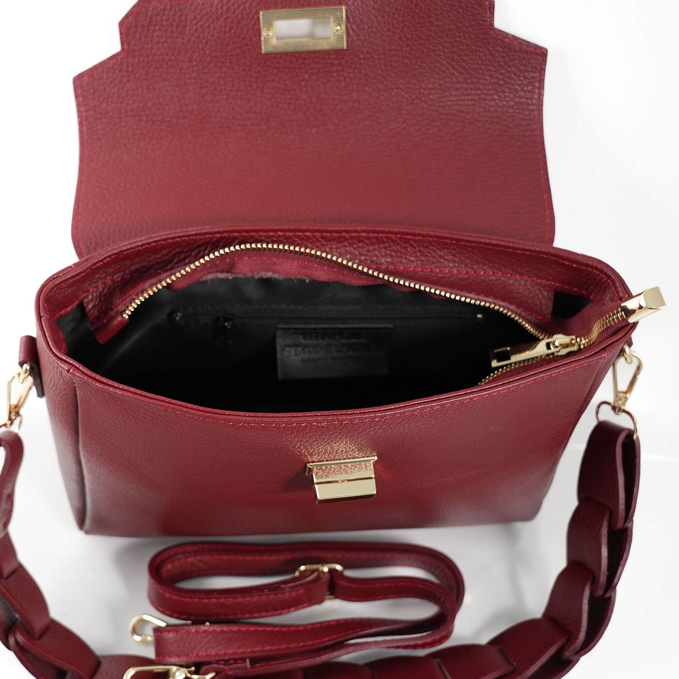 Geanta este prevazuta cu o curea din piele pentru a fi purtata in mana sau pe brat si o curea detasabila ce permite purtarea pe umar