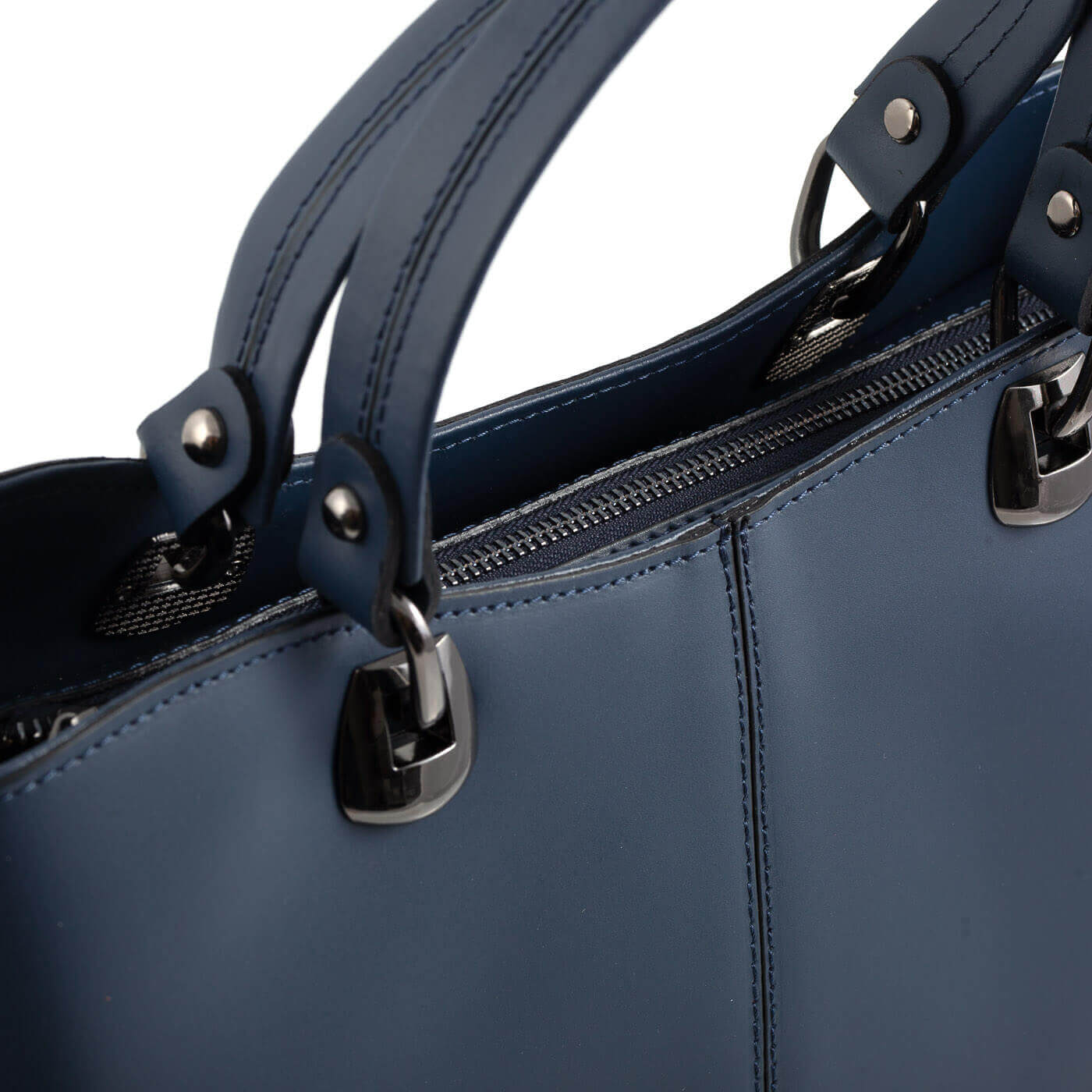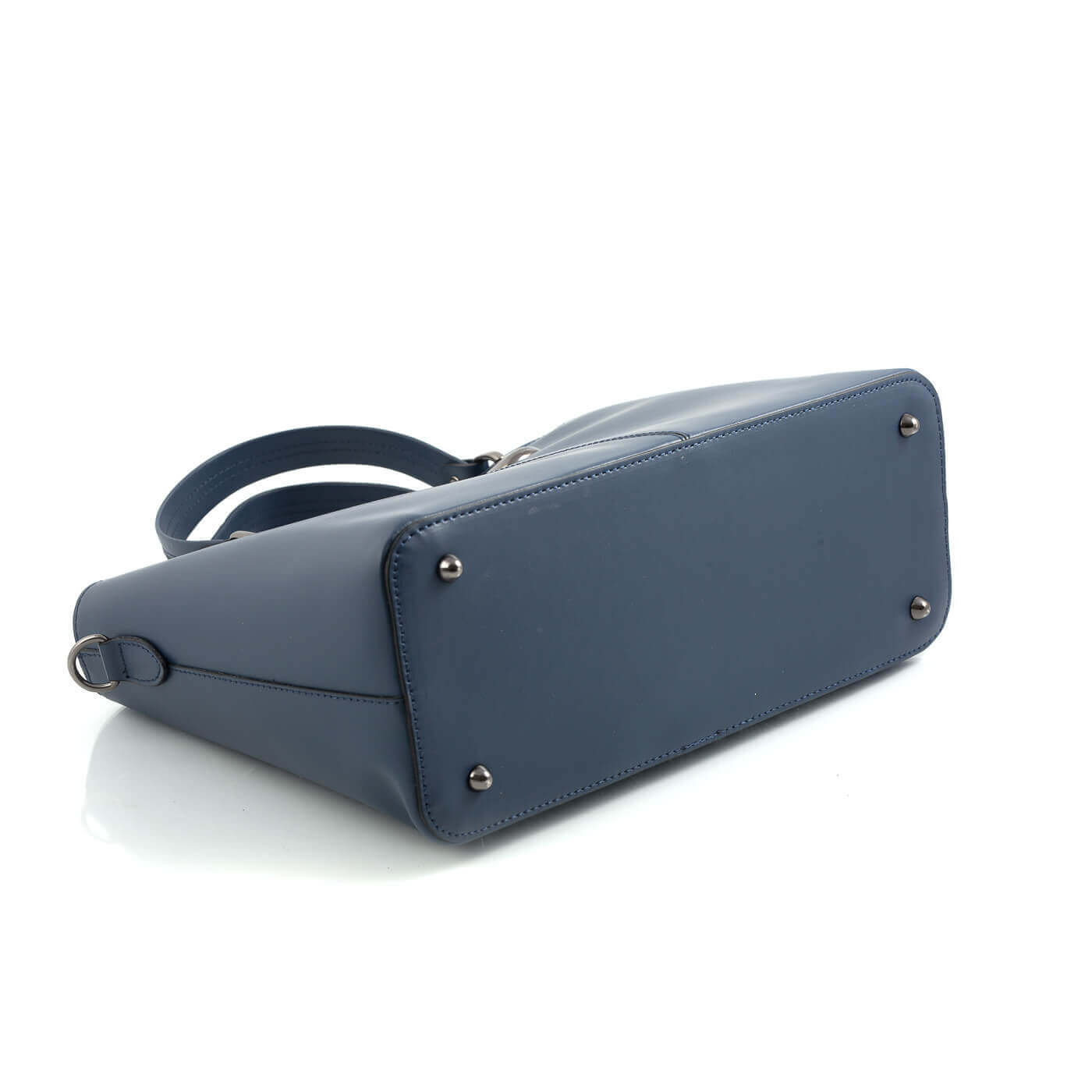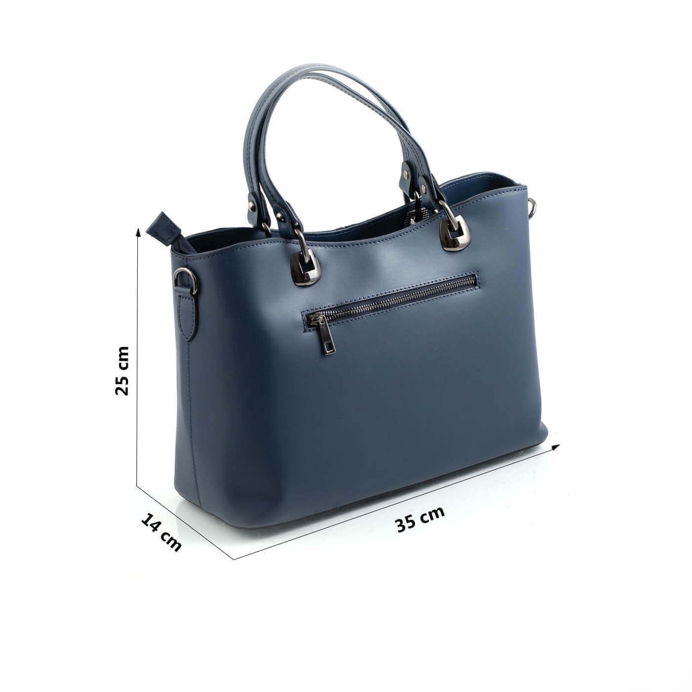 Geanta este prevazuta cu doua cureluse din piele pentru a fi purtata in mana si o curea detasabila ce permite purtarea si pe umar.