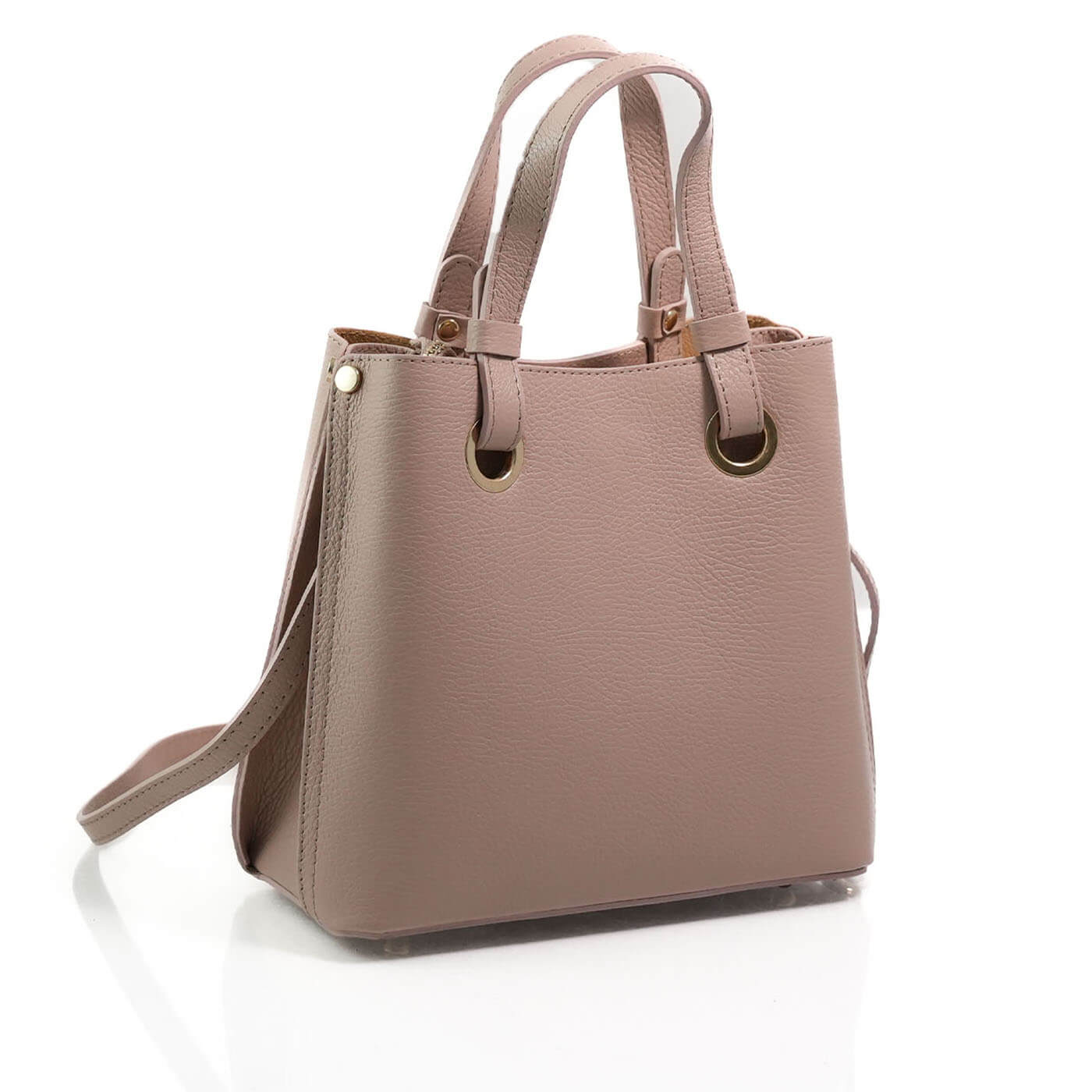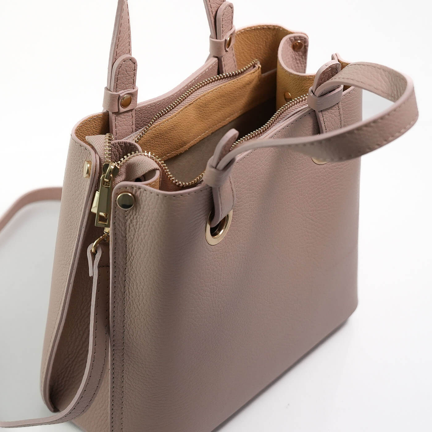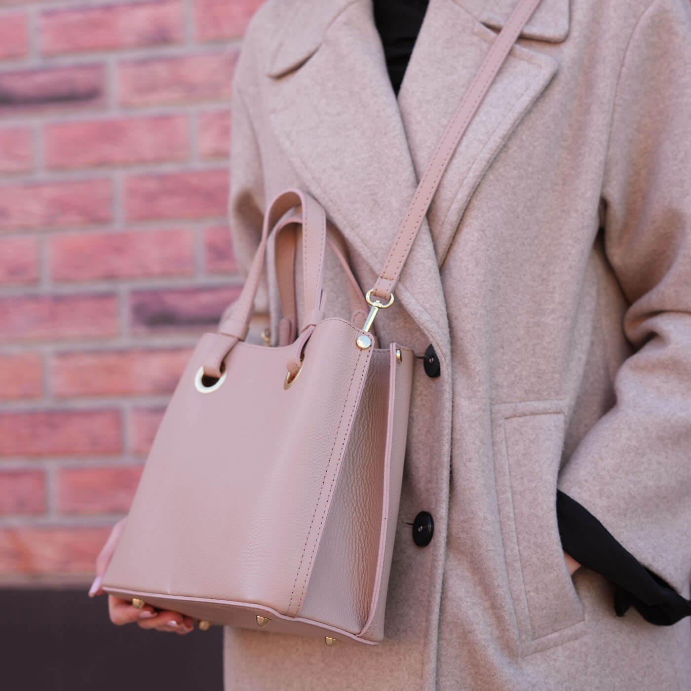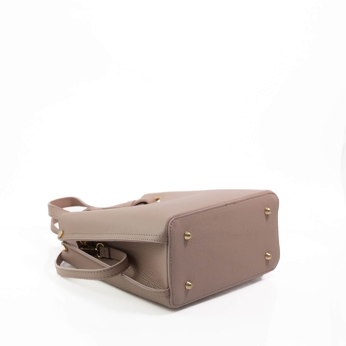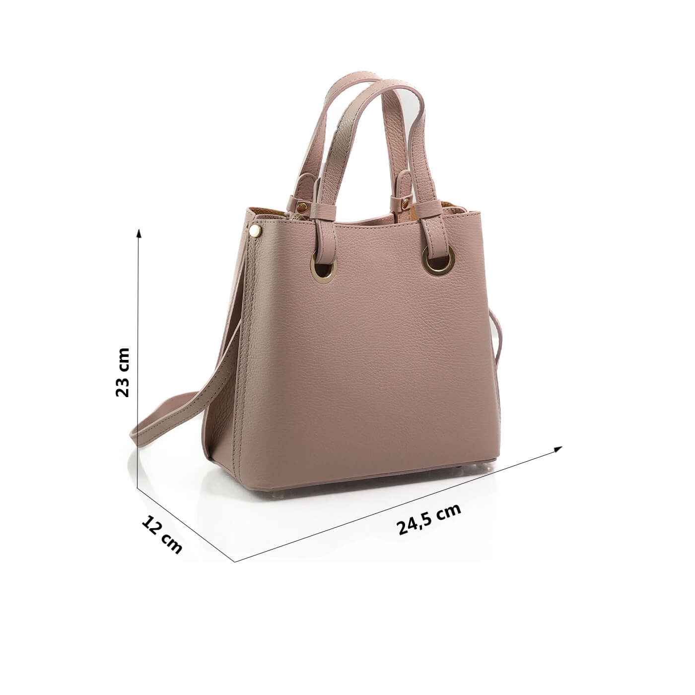 Geanta este prevazuta cu doua manere din piele pentru a fi purtata in mana si o curea detasabila de piele ce permite purtarea pe umar.