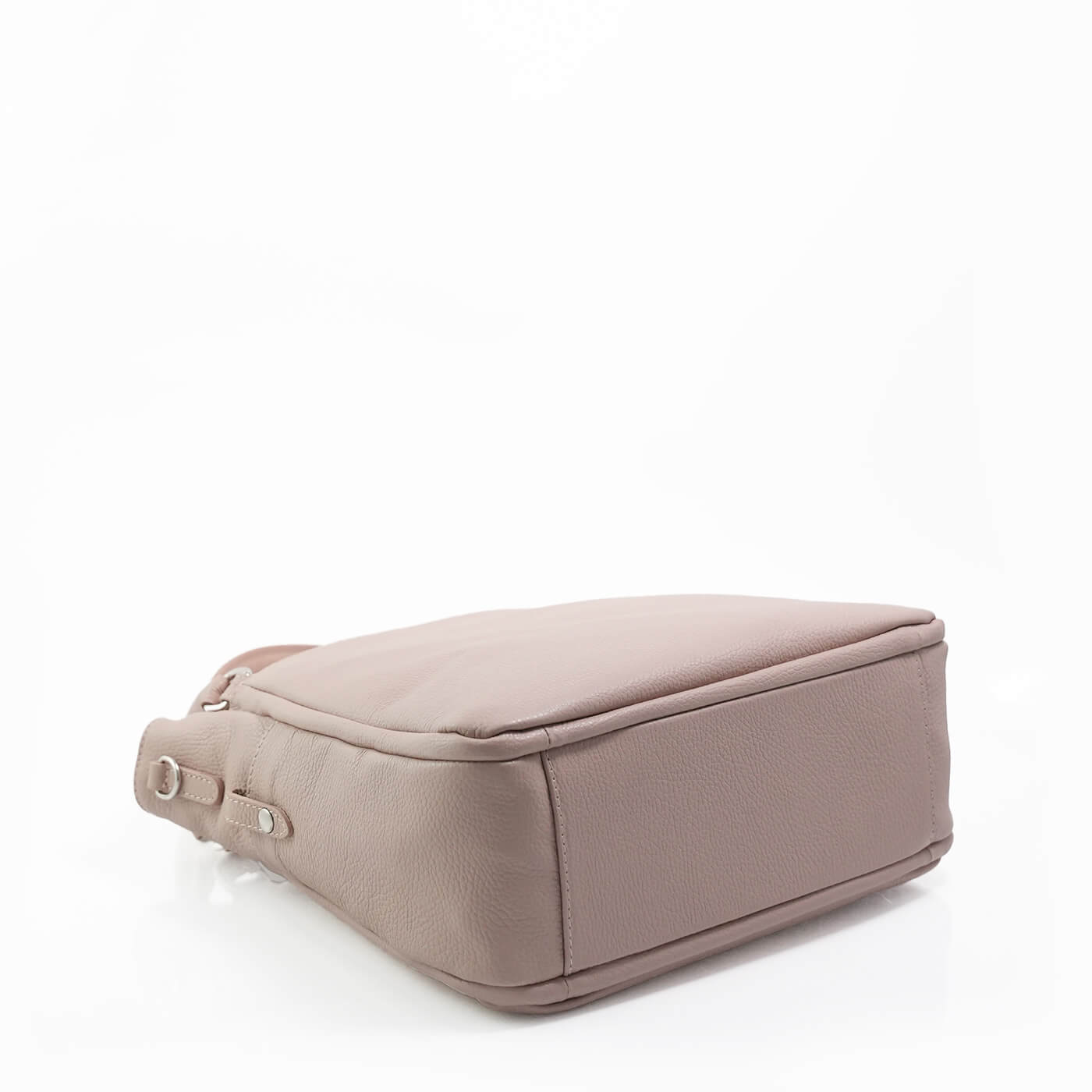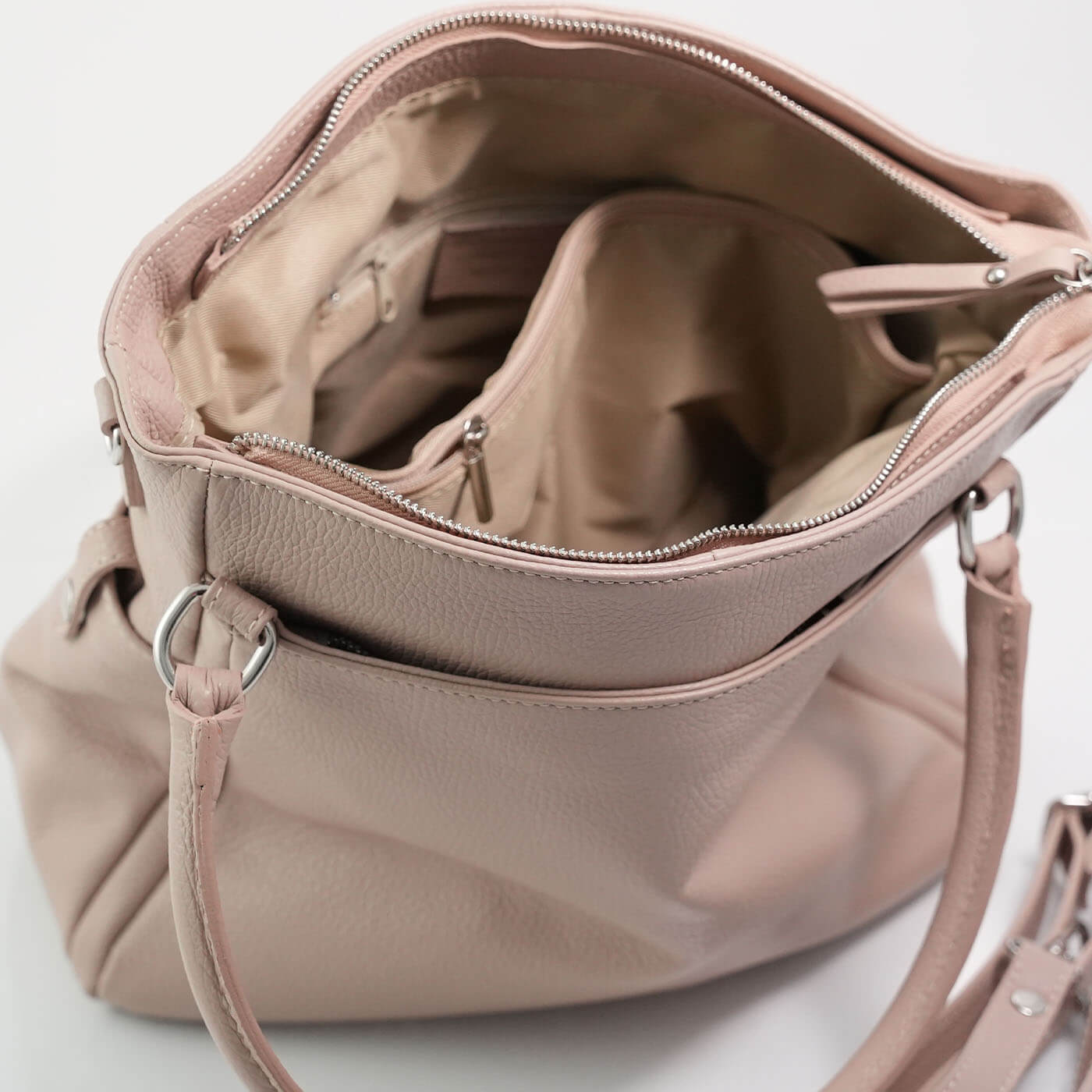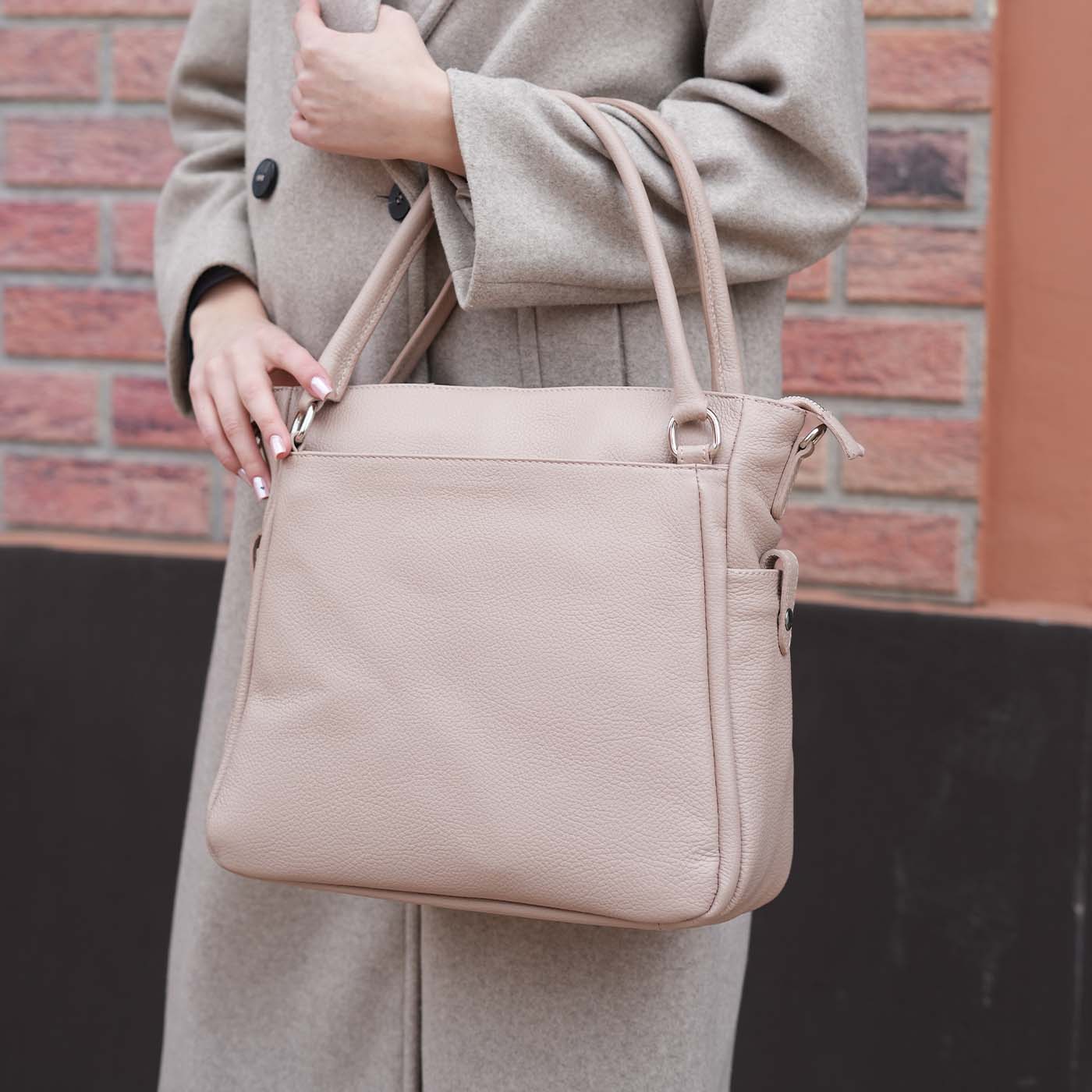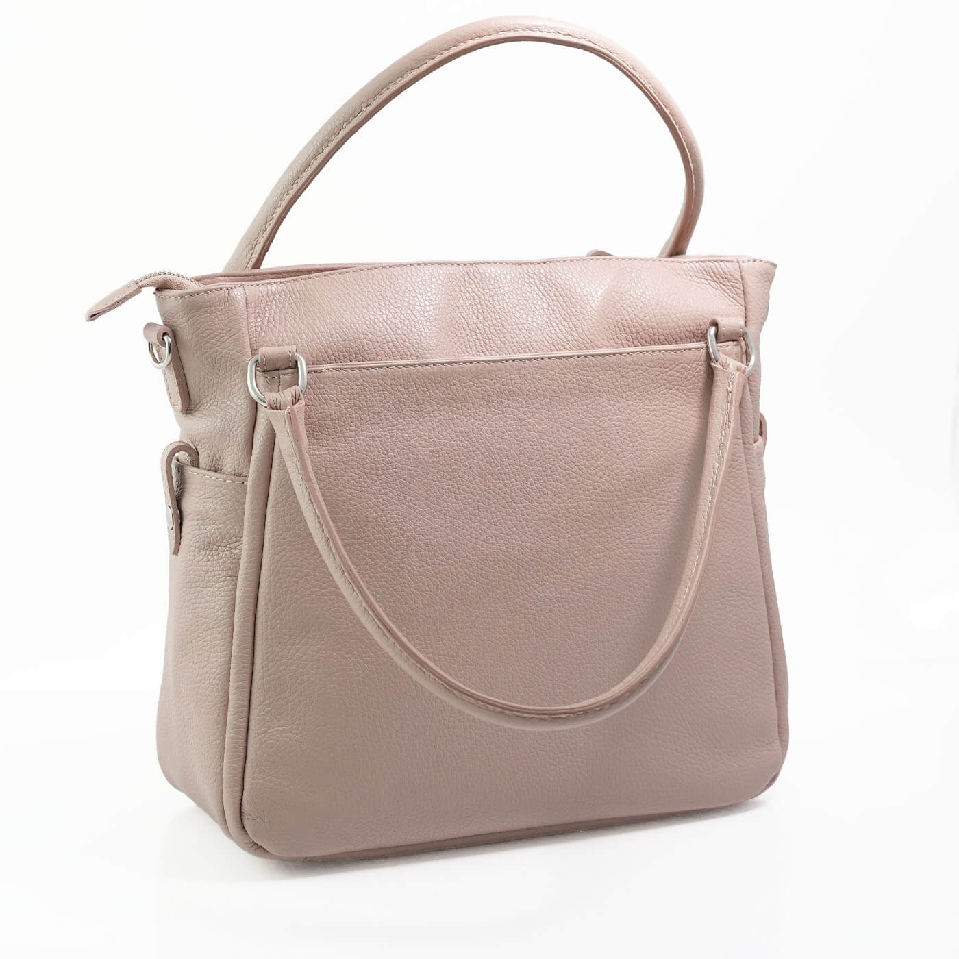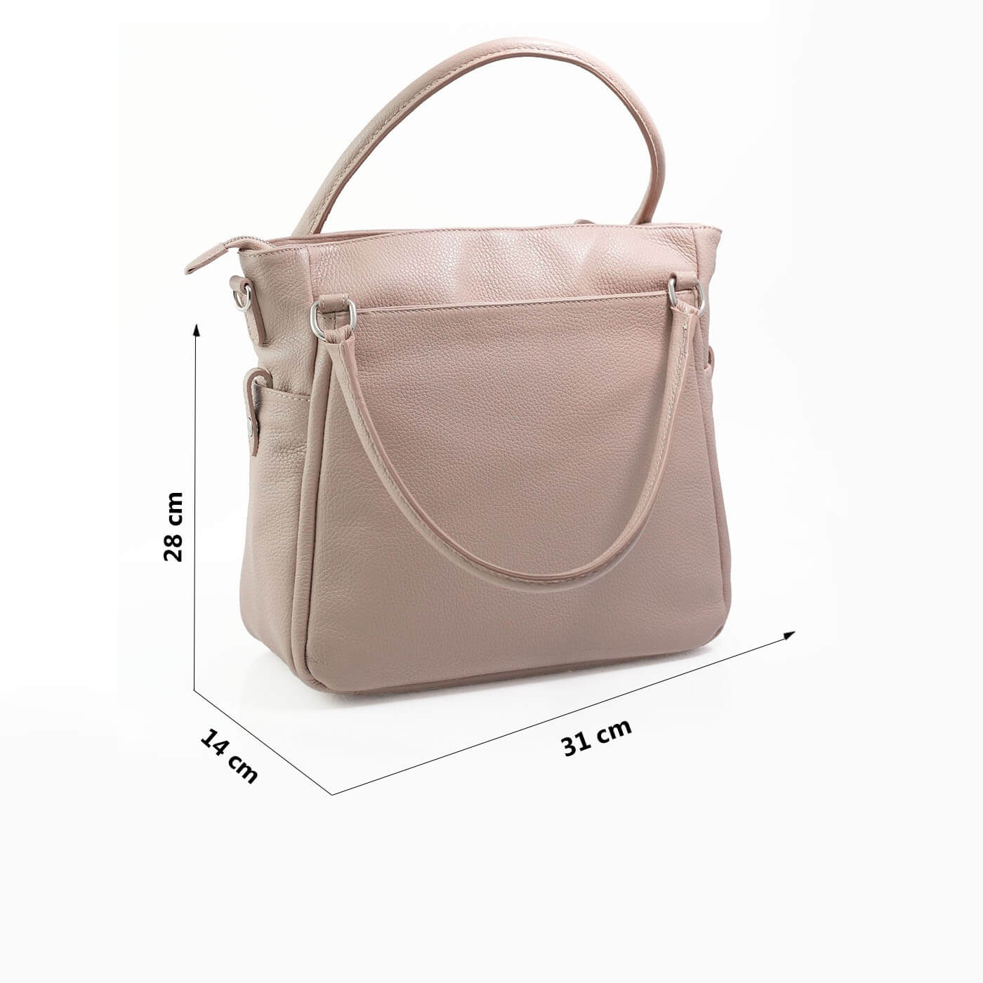 Geanta este prevazuta cu doua manere din piele pentru a fi purtata in mana si o curea detasabila de piele ce permite purtarea pe umar.